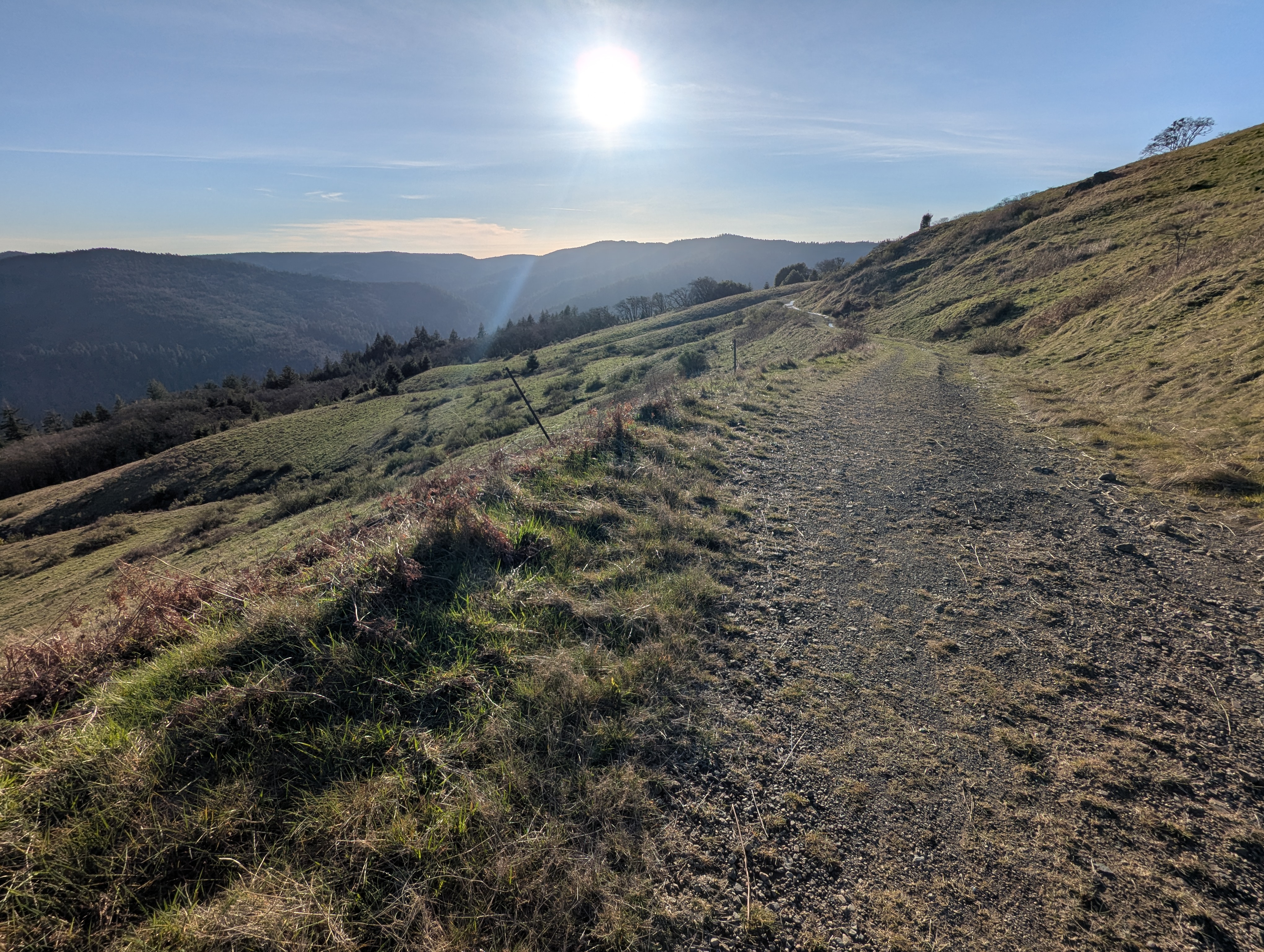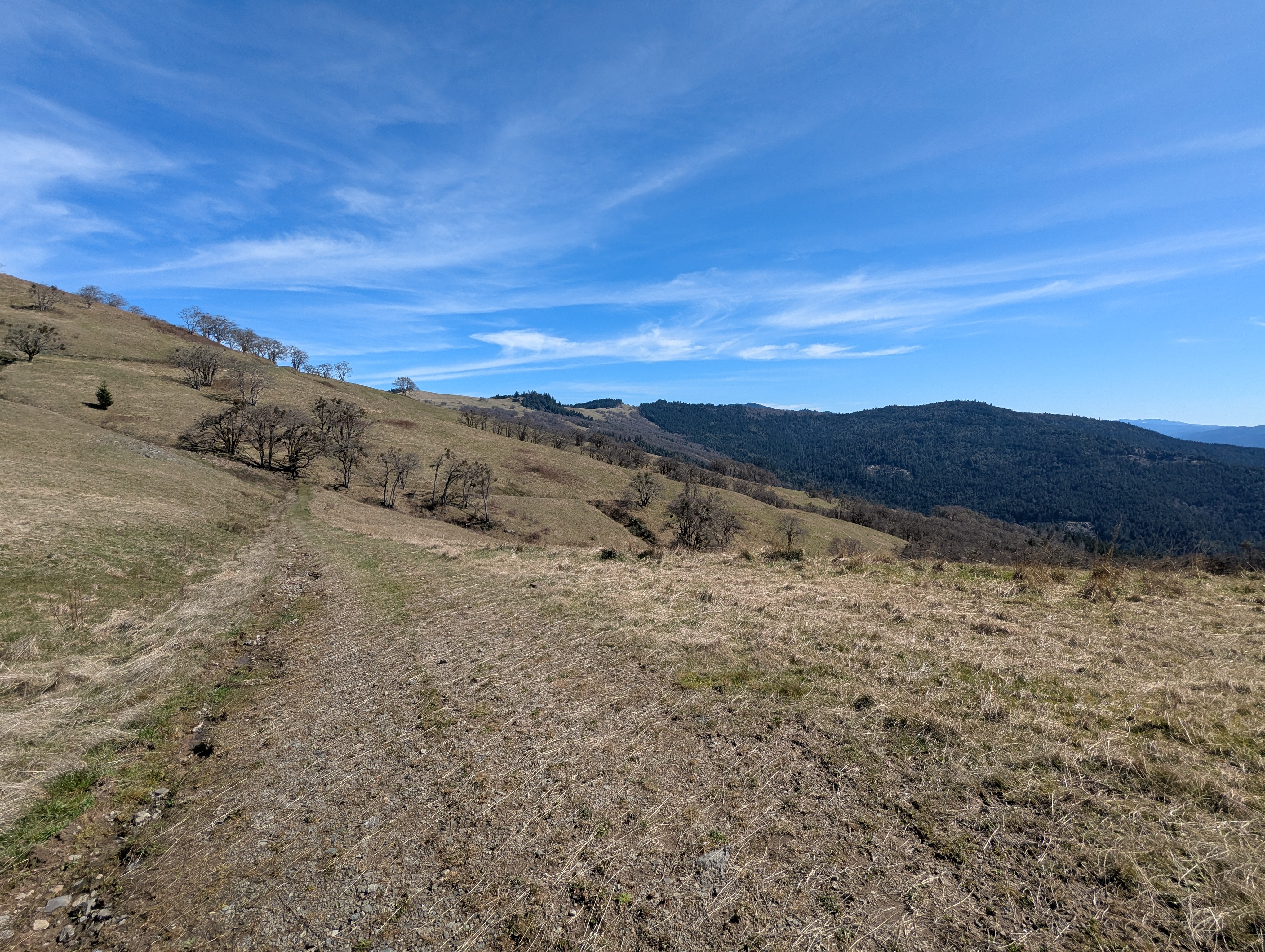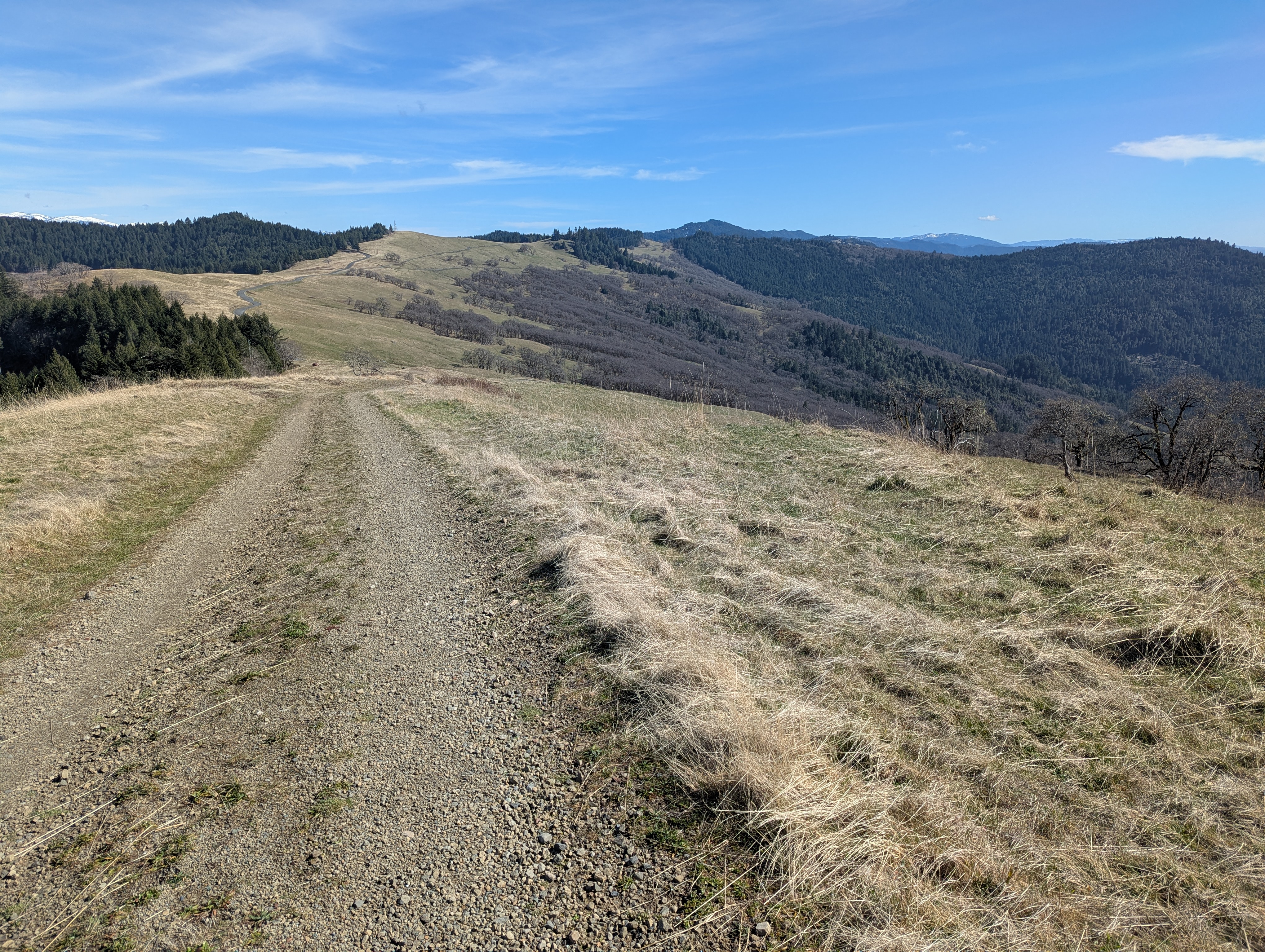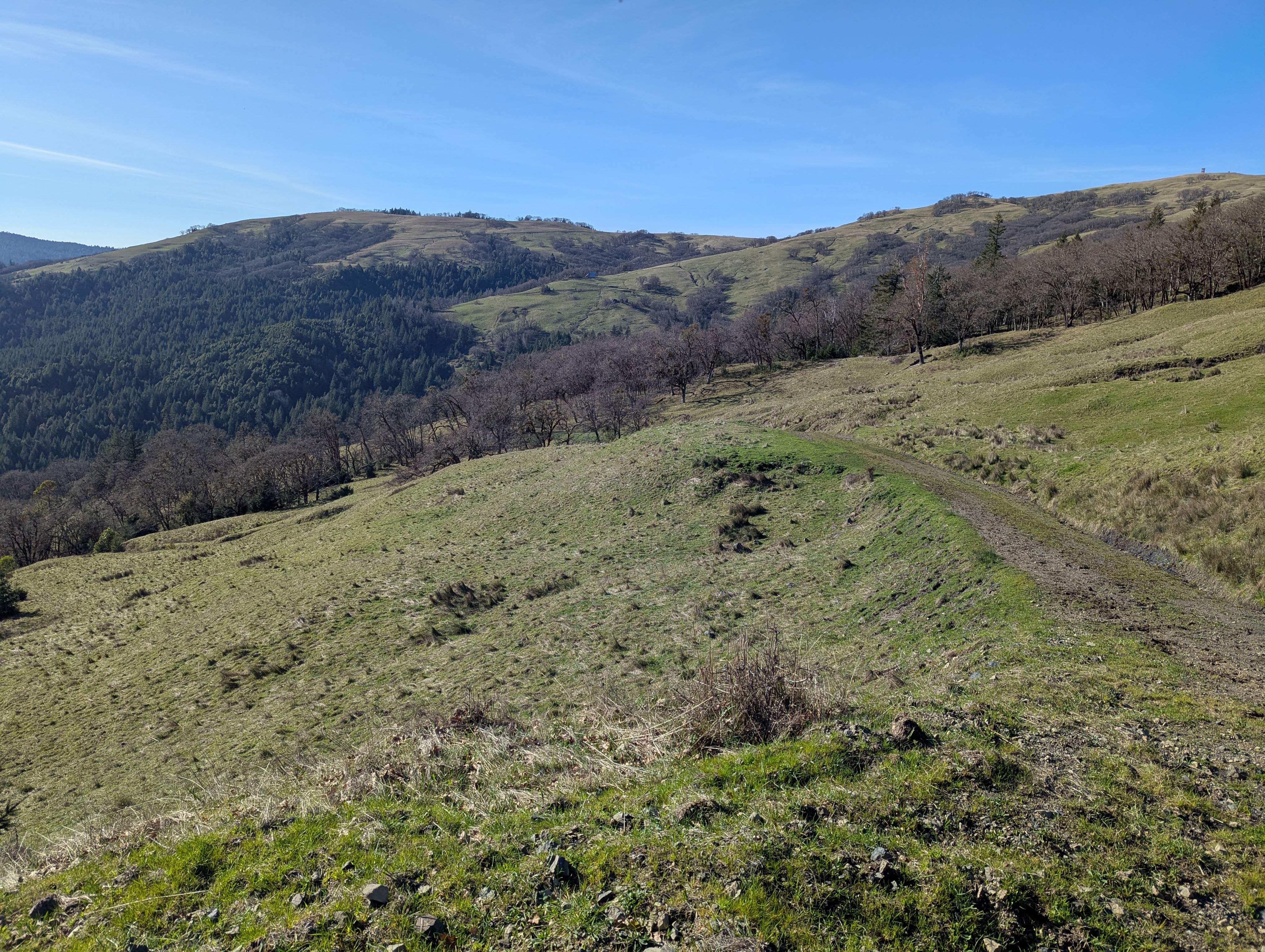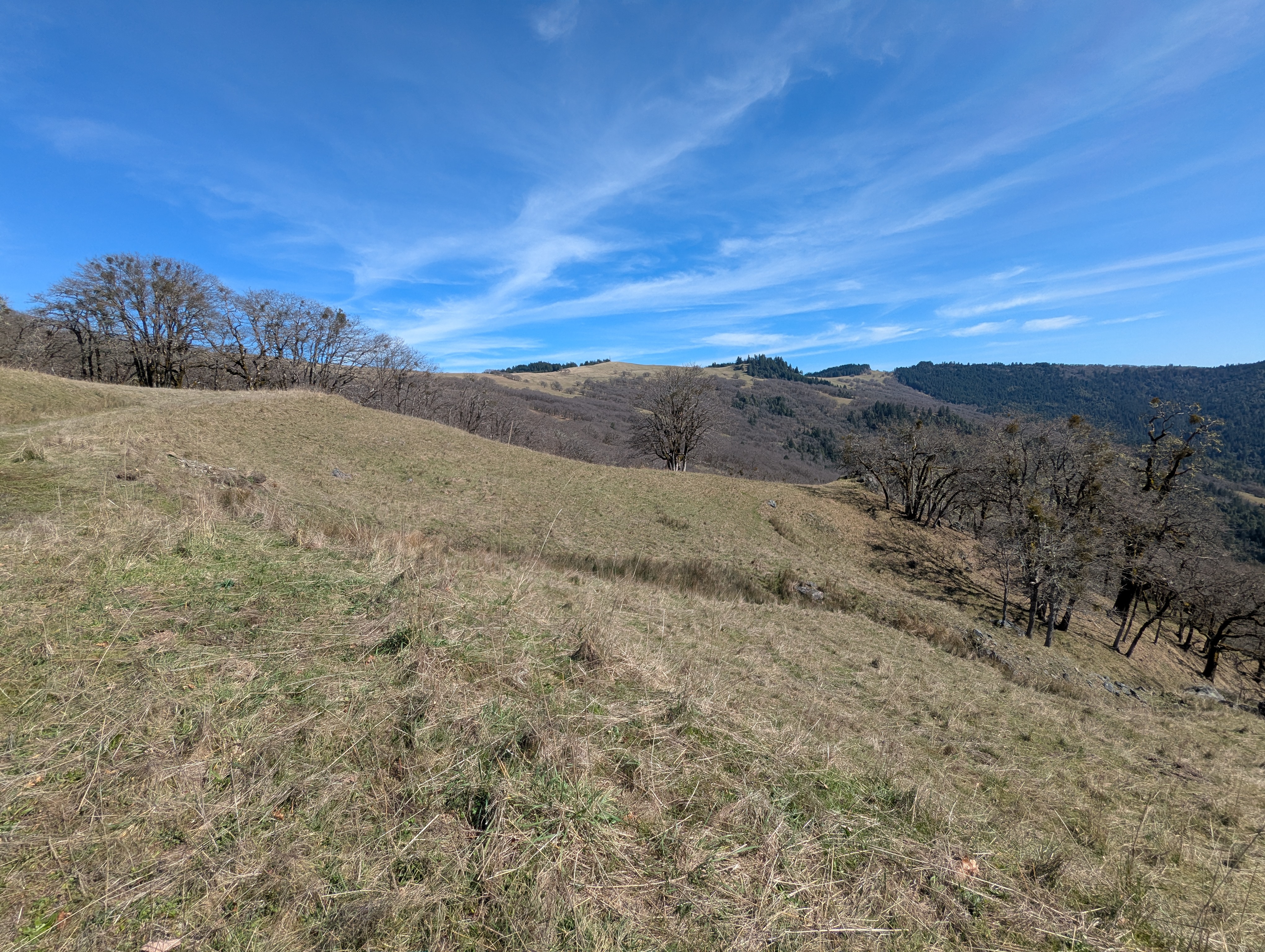 I reach a junction and need to make a decision. I can continue downhill to the Long Ridge Sheep Shed which would shorten my hike by a lot. I decide not to give in to the weariness that I’m feeling, and fork left onto the unmarked High Prairie Road. I gain back all the elevation I just lost and climb up towards Bald Hills Road. There’s a small falcon calling and swooping and my Merlin app confirms that it’s an American Kestrel. I can hear another one far away answering the call. I see a giant California ground squirrel dart across the hillside and disappear into a rock outcrop.
