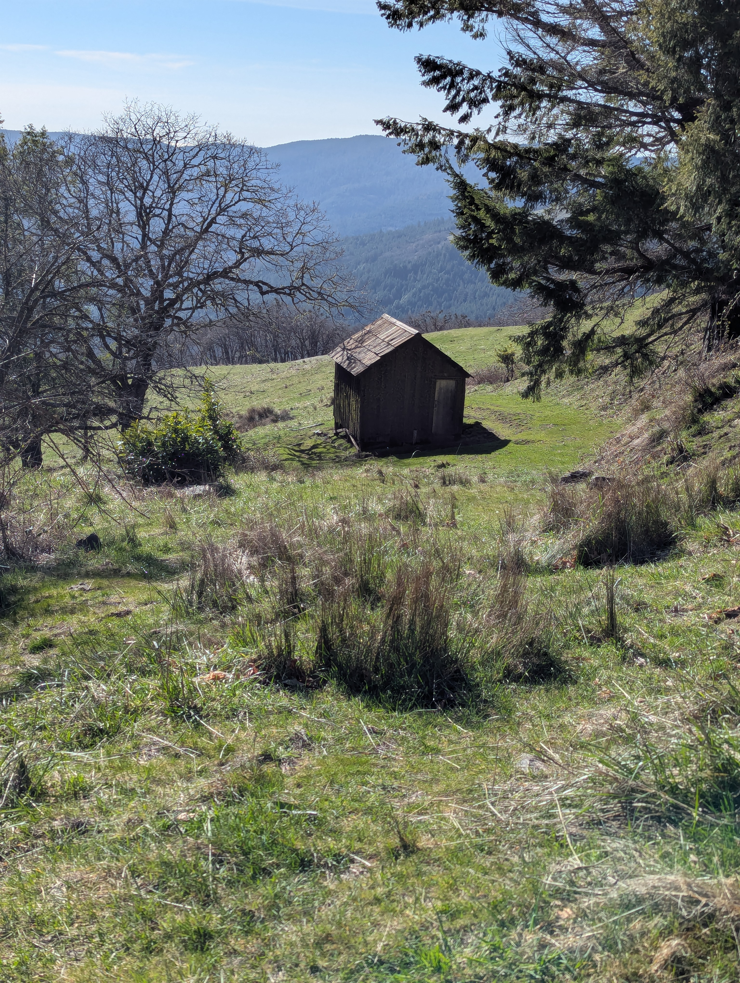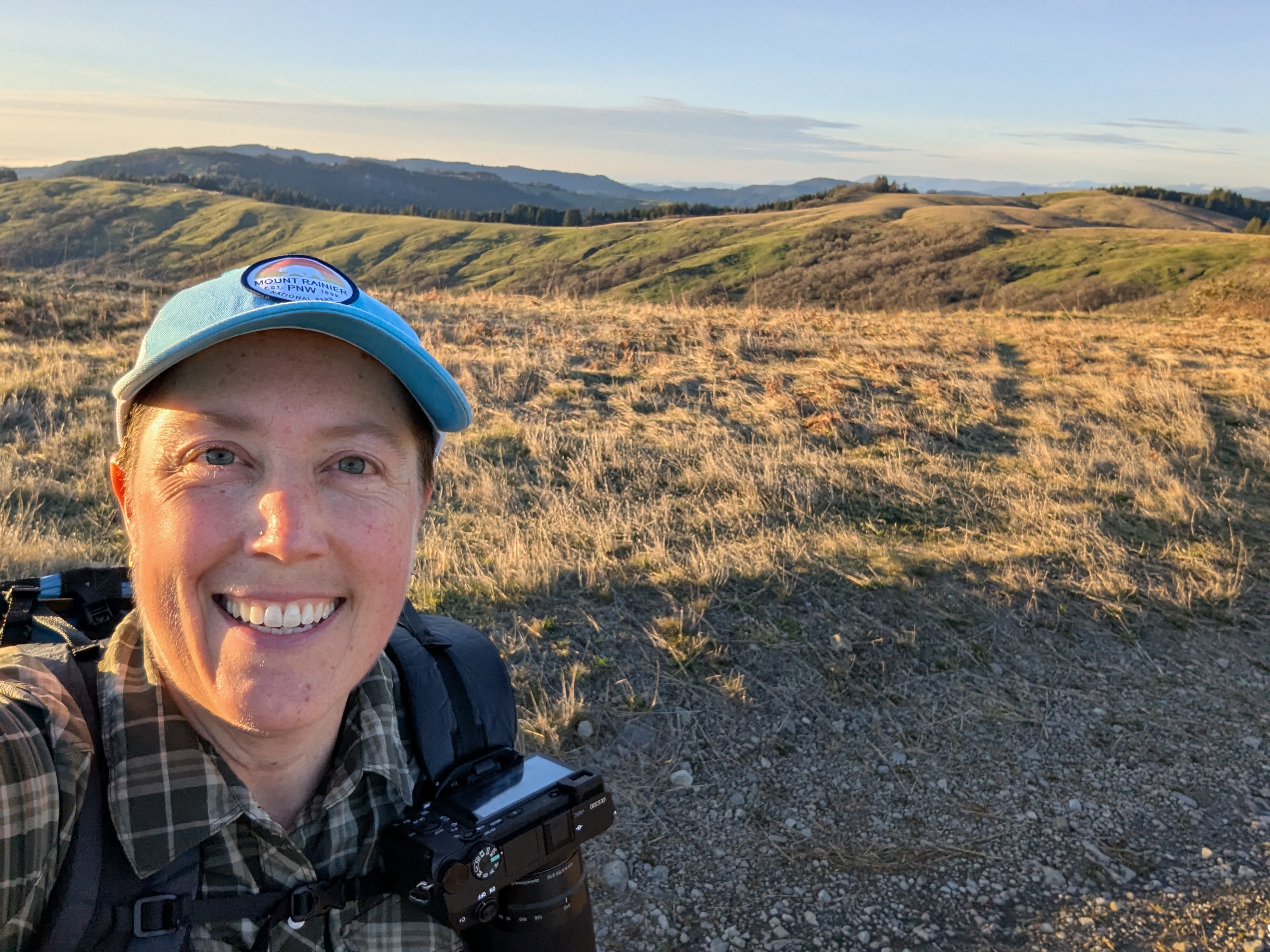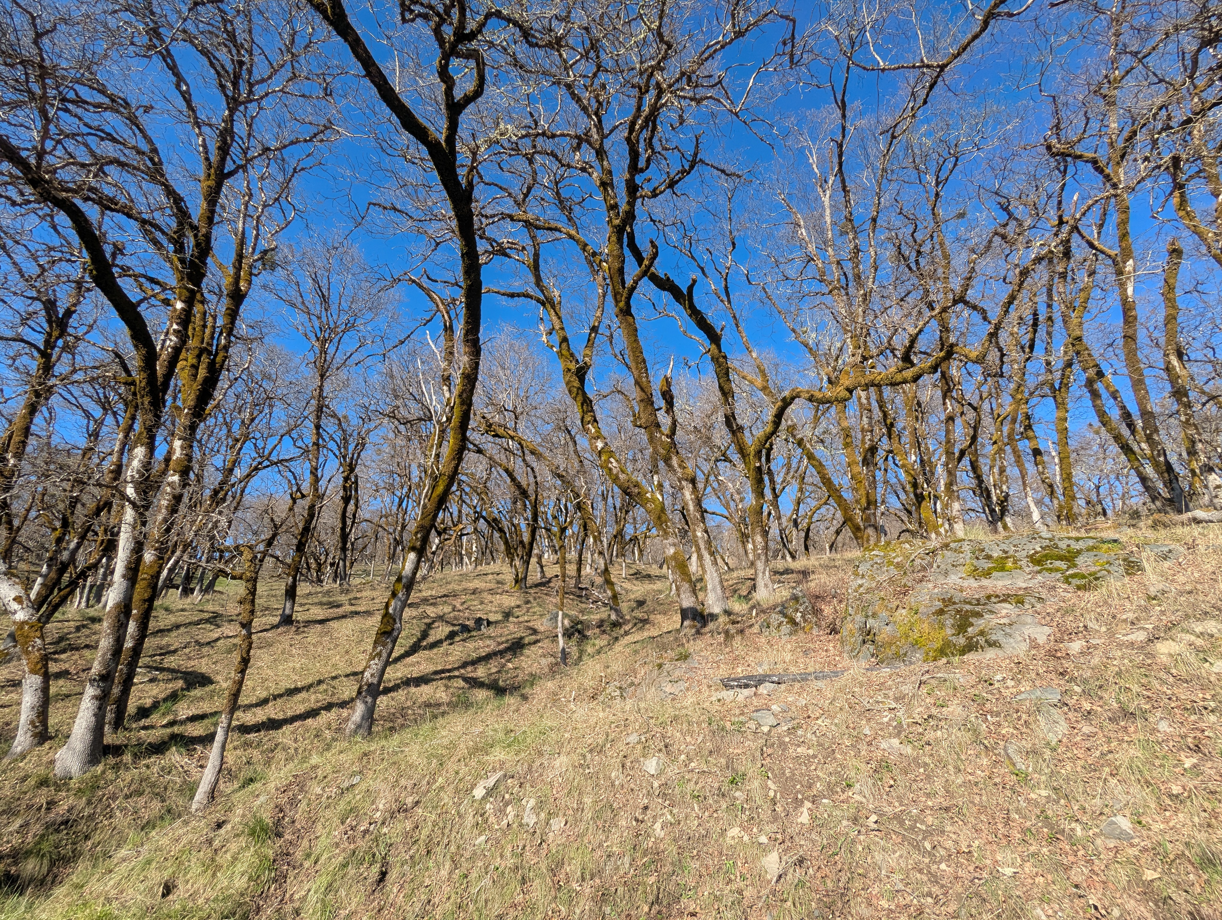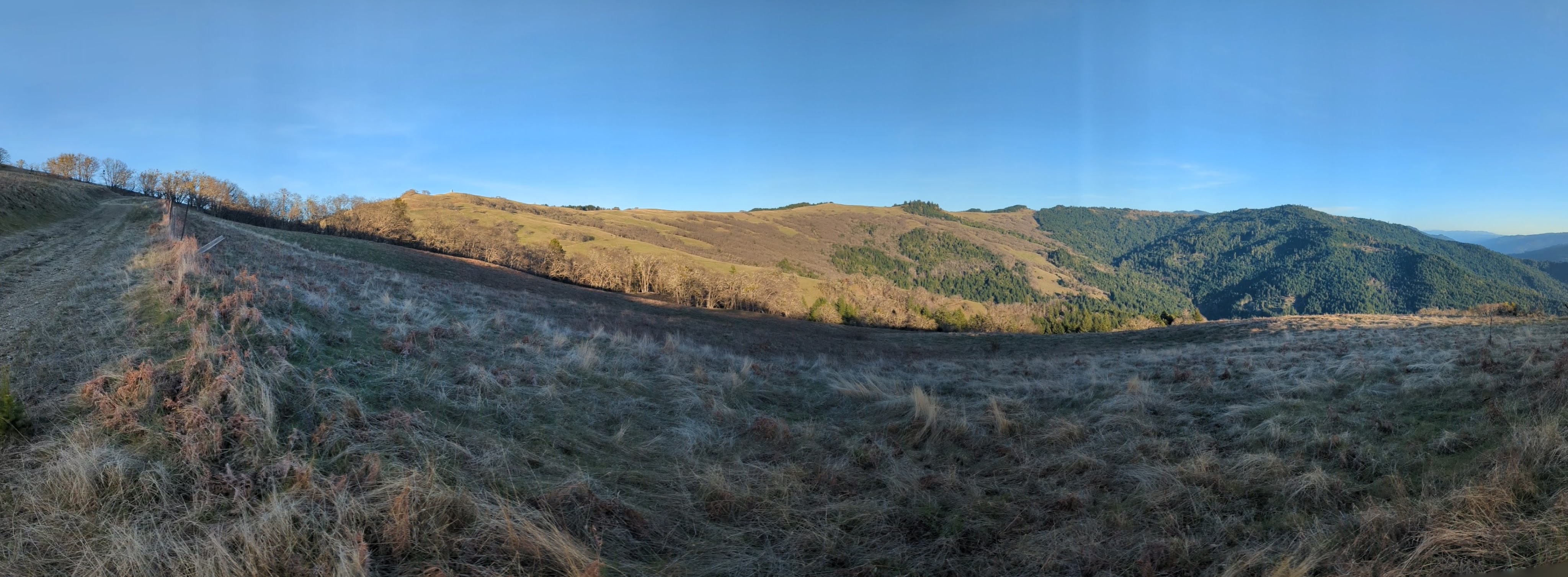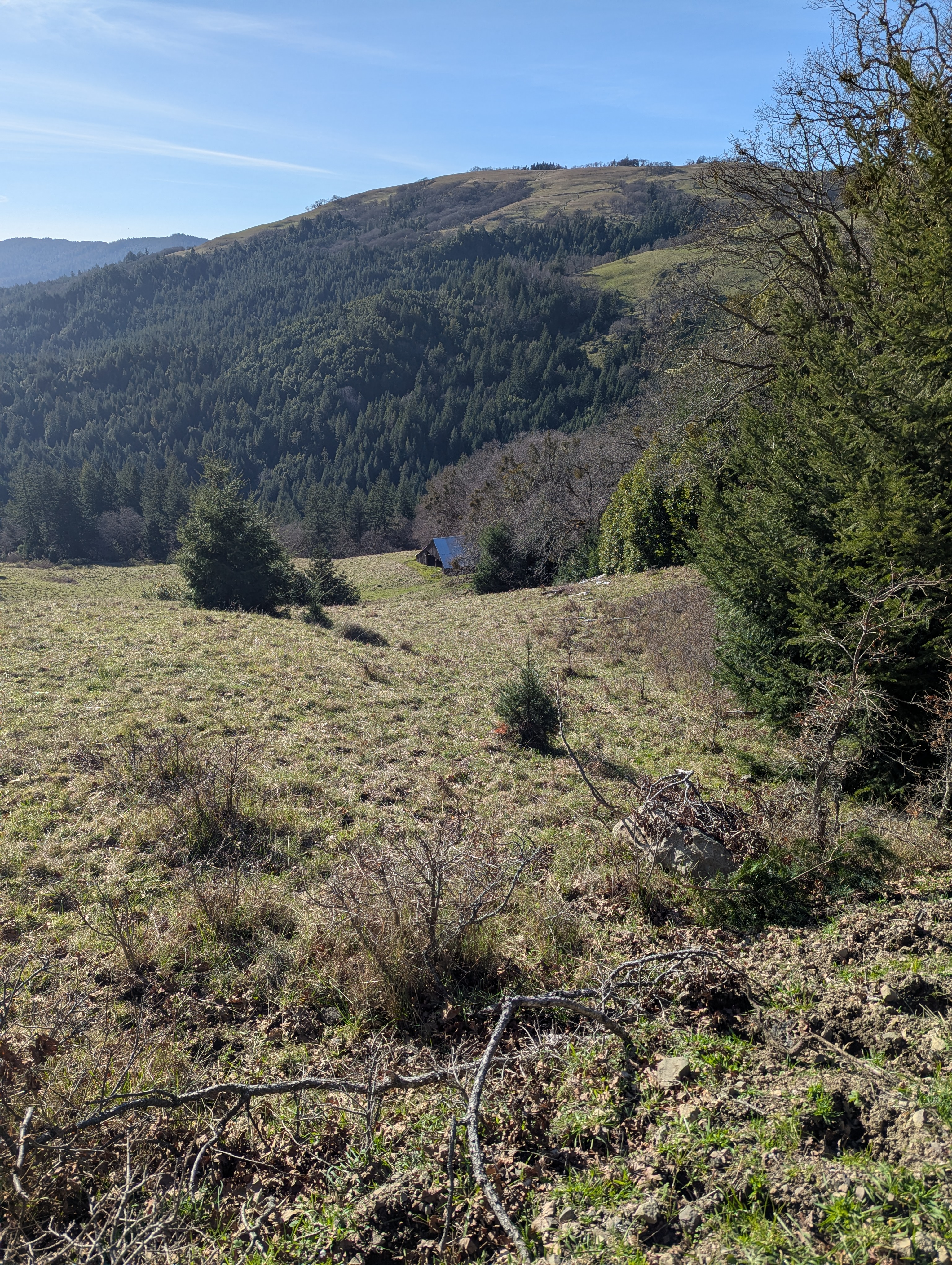 I reach a junction and need to make a decision. I can continue downhill to the Long Ridge Sheep Shed which would shorten my hike by a lot. I decide not to give in to the weariness that I’m feeling, and fork left onto the unmarked High Prairie Road. I gain back all the elevation I just lost and climb up towards Bald Hills Road. There’s a small falcon calling and swooping and my Merlin app confirms that it’s an American Kestrel. I can hear another one far away answering the call. I see a giant California ground squirrel dart across the hillside and disappear into a rock outcrop.
