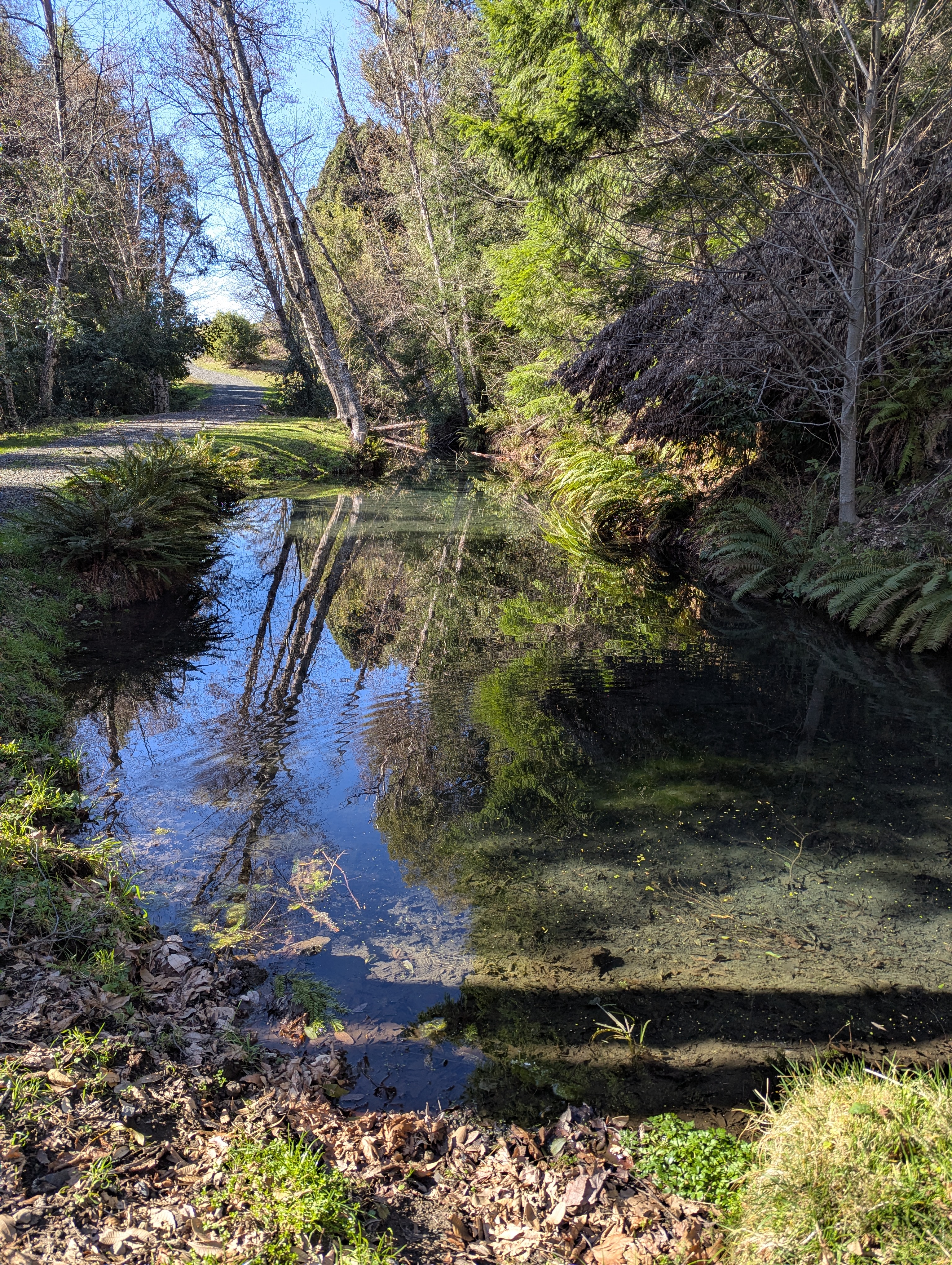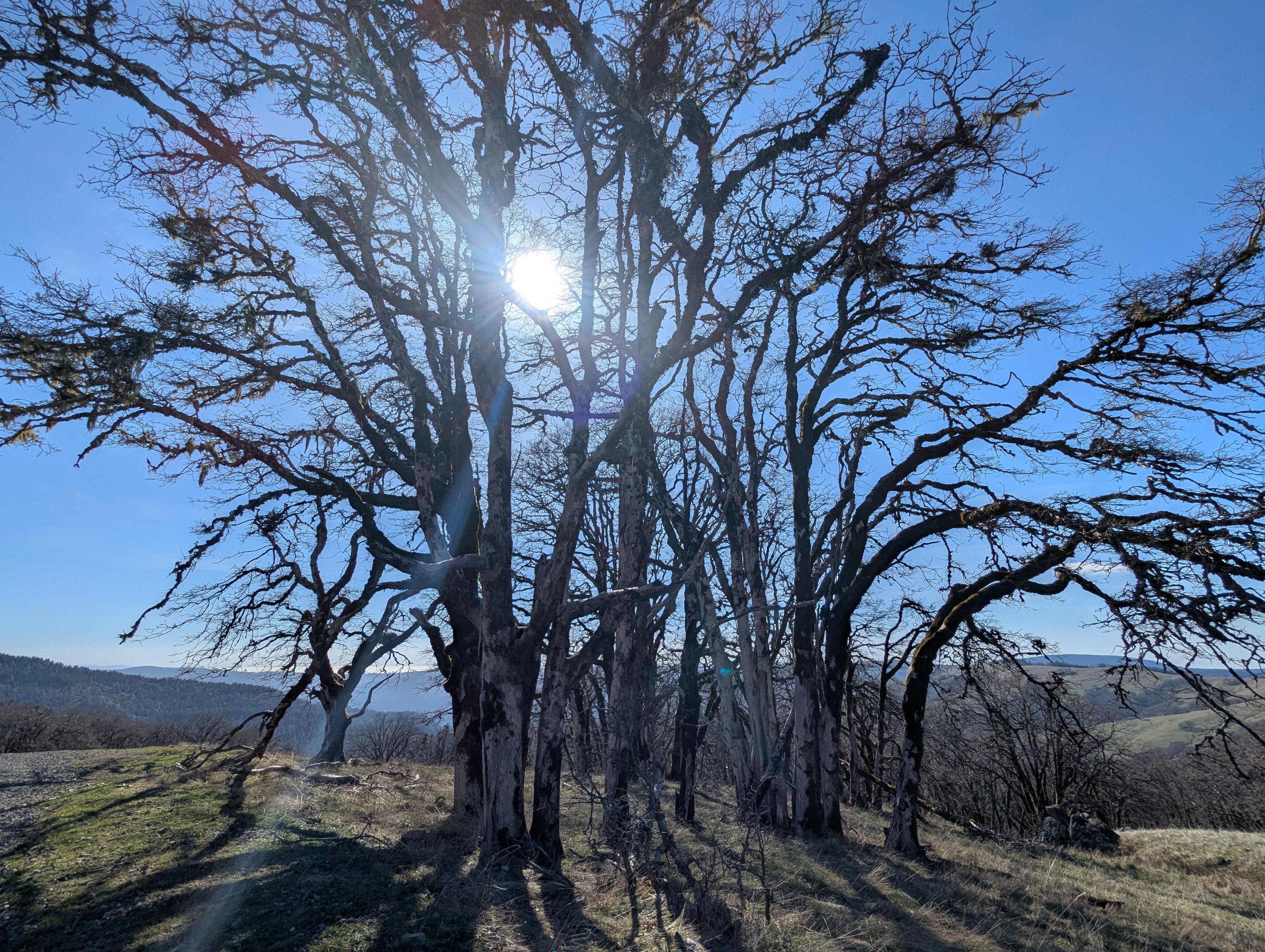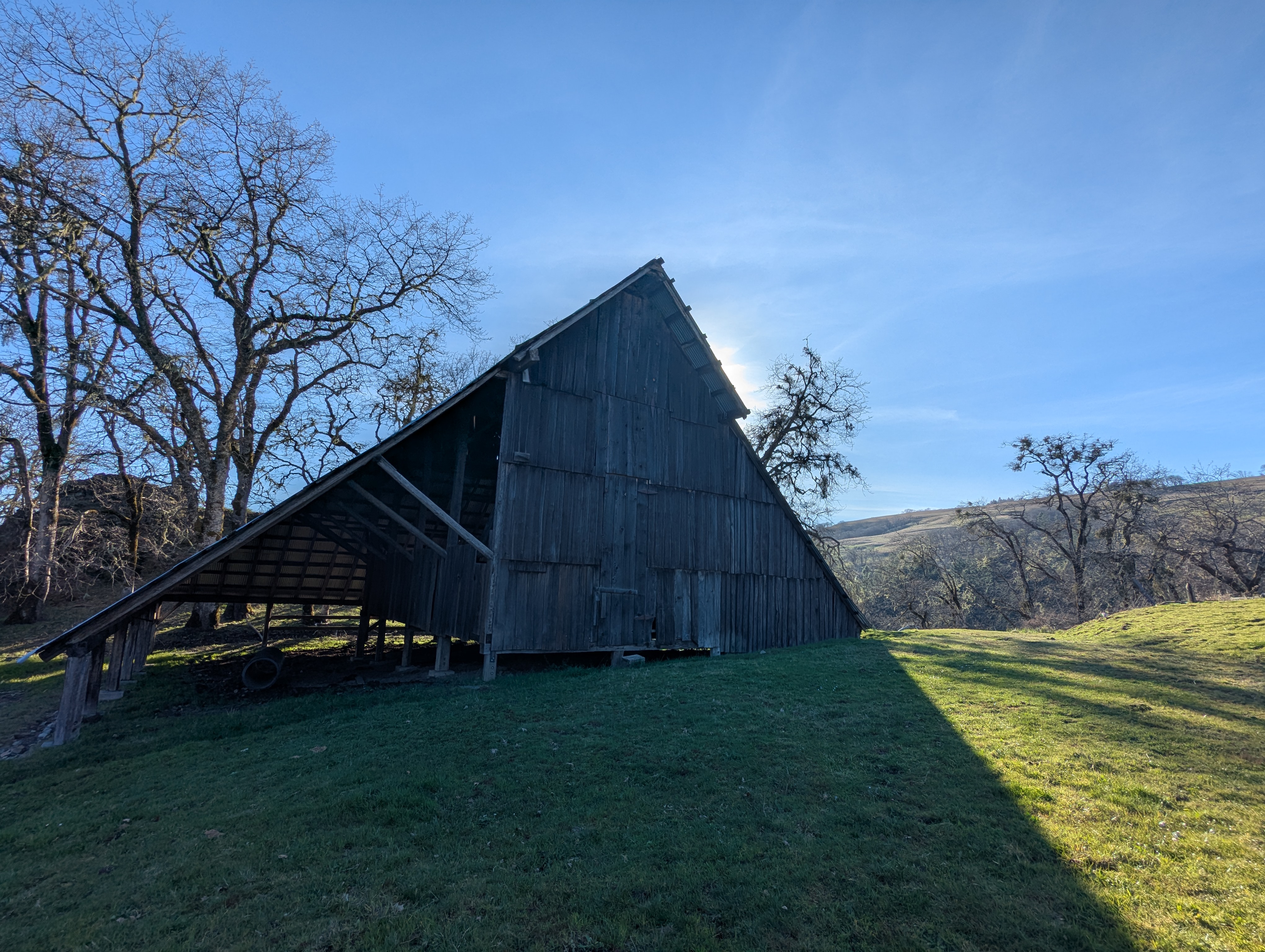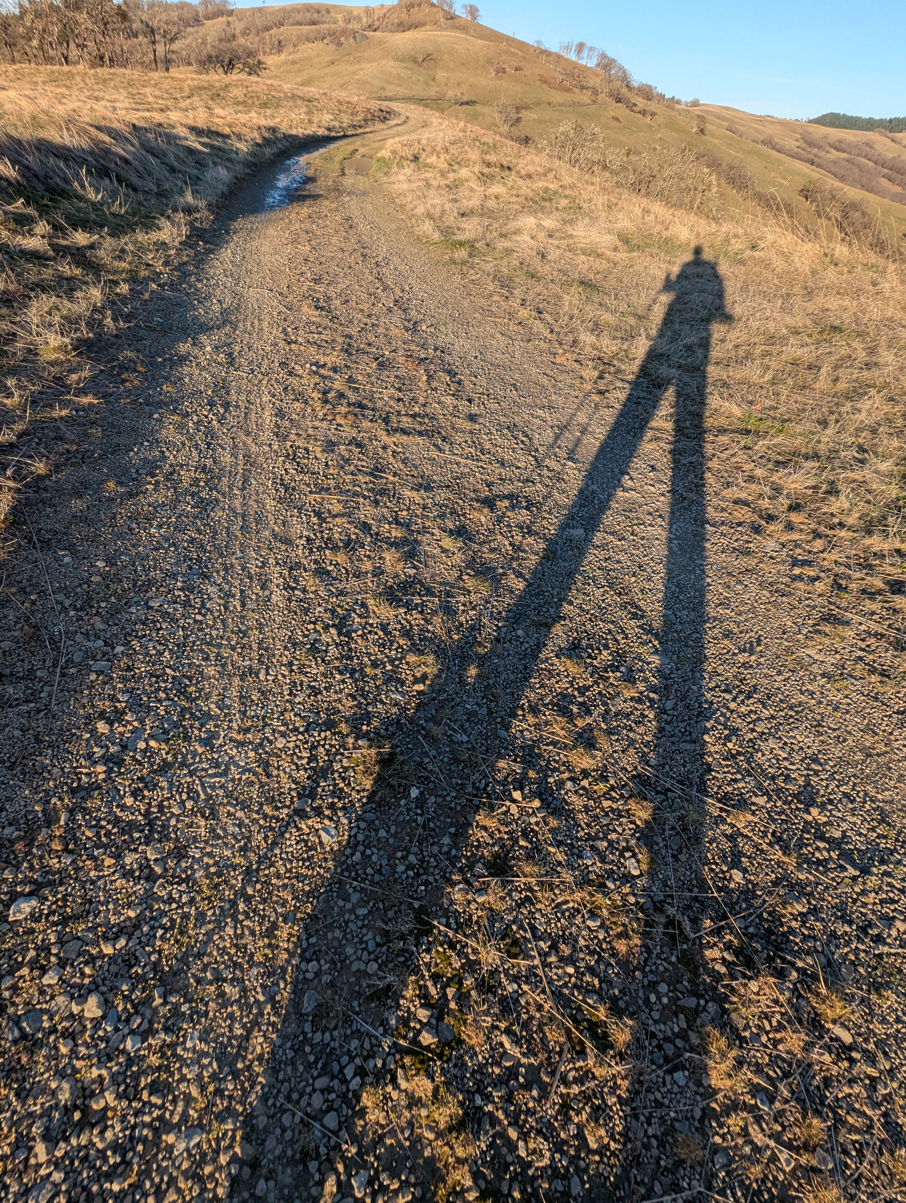 The sun is lowering on the horizon as it blasts through the leafless oaks. I can feel that my arms and my face have gotten a lot of sun this afternoon. My knees are talking to me as I pass the Coyote Creek Barn and Coyote Pond.