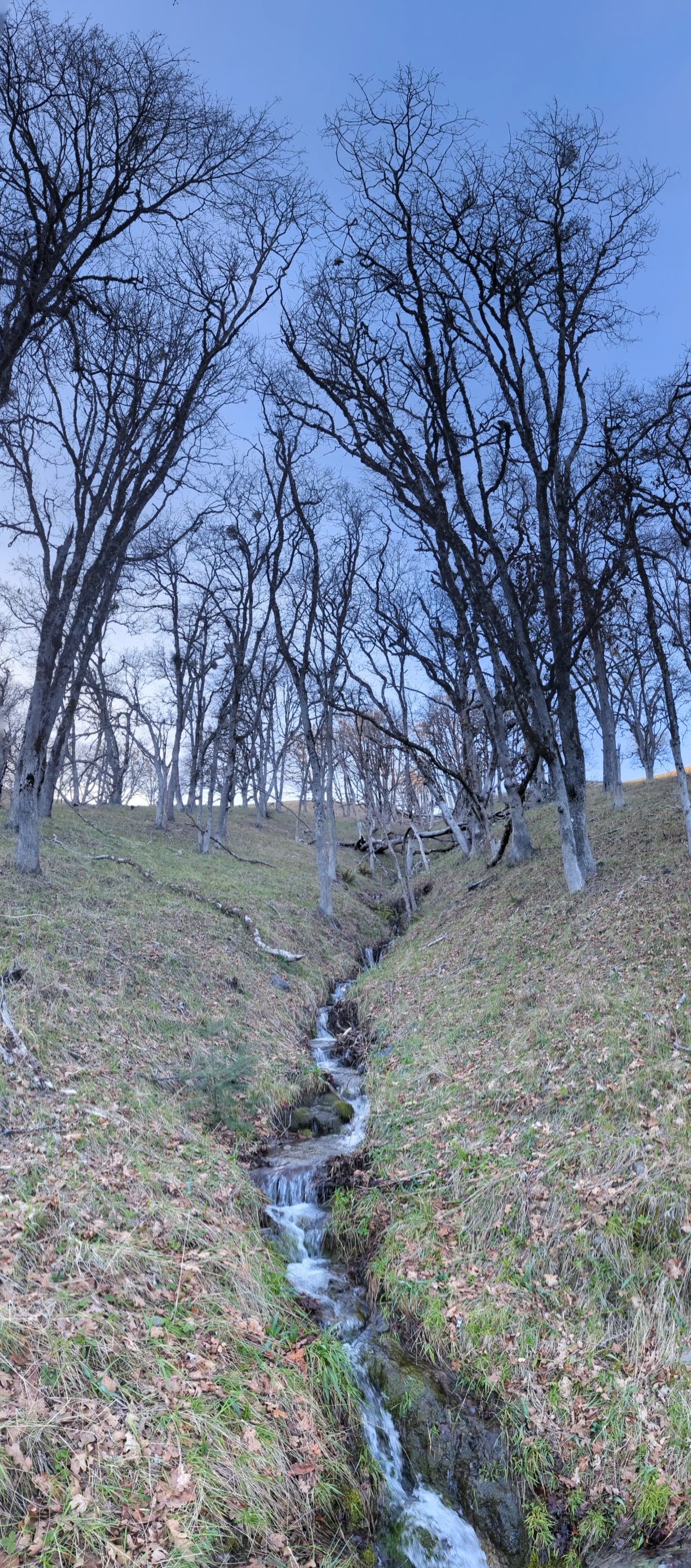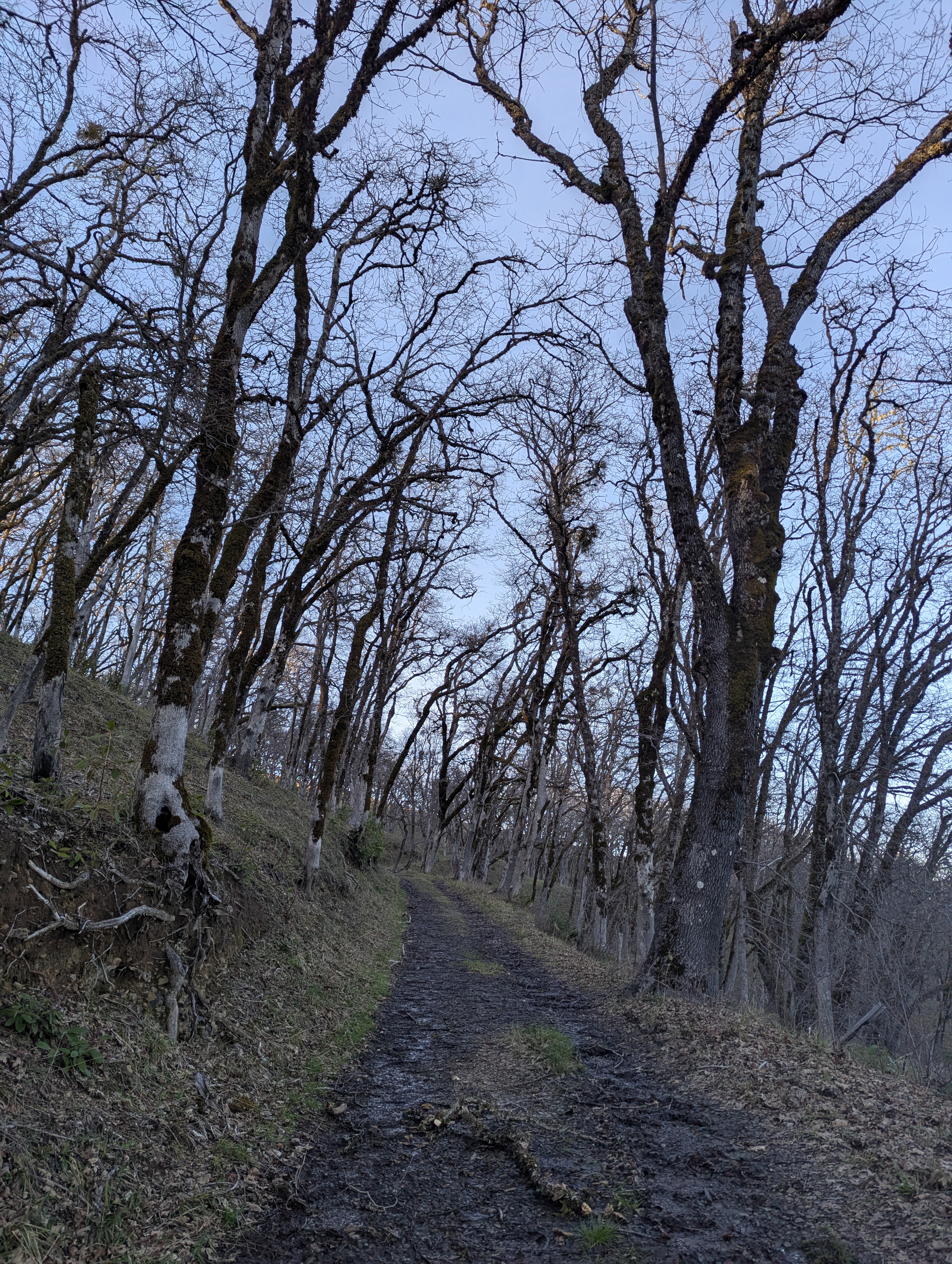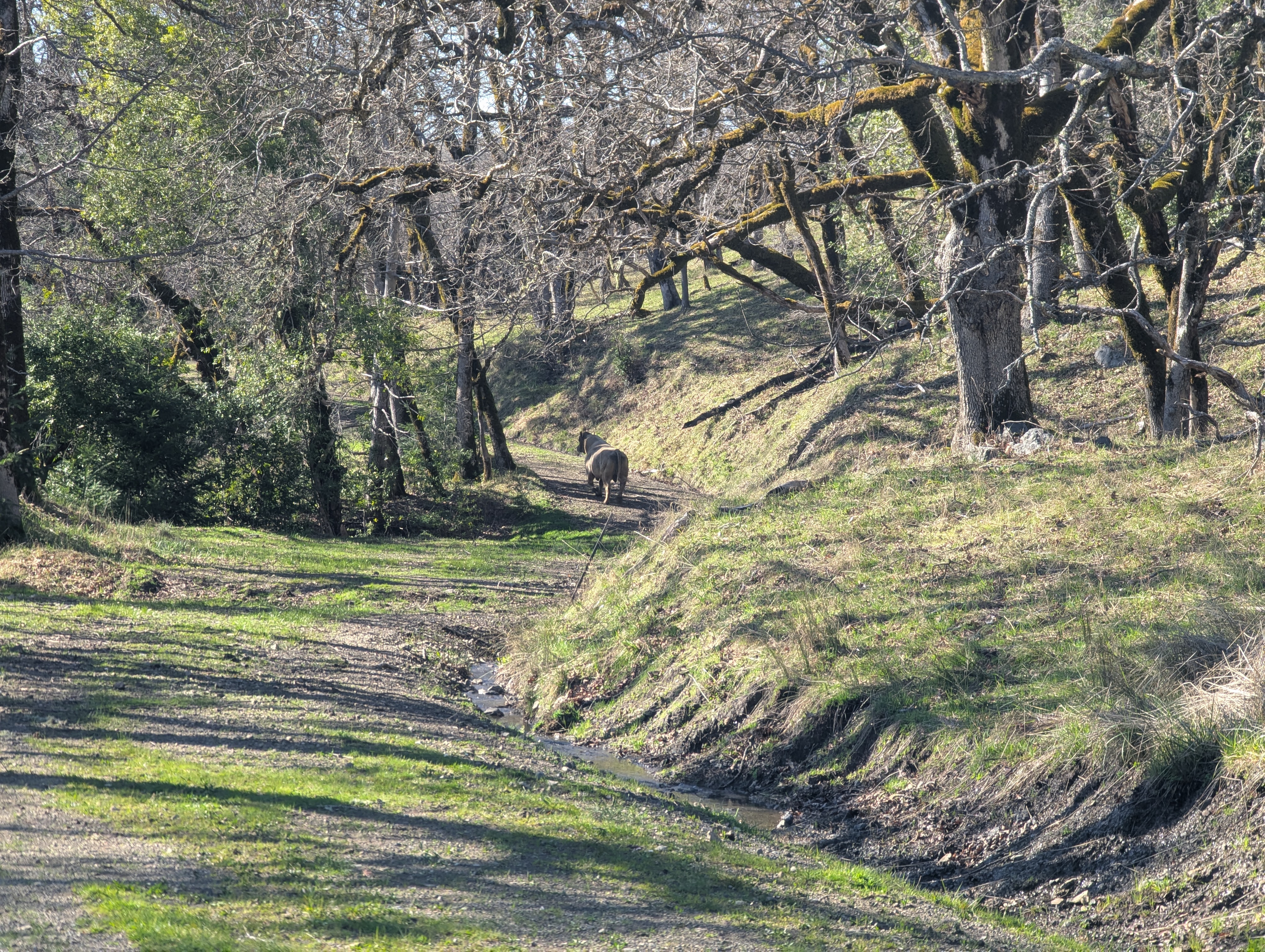It’s about 2:20pm and I’m ready for more hiking. I walk a ways and then return to my truck to make sure I locked it. I walk a ways and then return to my truck again because I realize that I’ve forgotten my trekking poles. A car rolls in and parks so close to my truck that I’m afraid they’re going to open their door into mine. Finally, on the third try I’m on my way. I follow a road downhill away from the small parking area. There is water flowing everywhere and the road is oozing with wetness. The patchy oak groves still are without their leaves. There are lots of signs to read. Boot tracks, dog prints, elk tracks and poop.