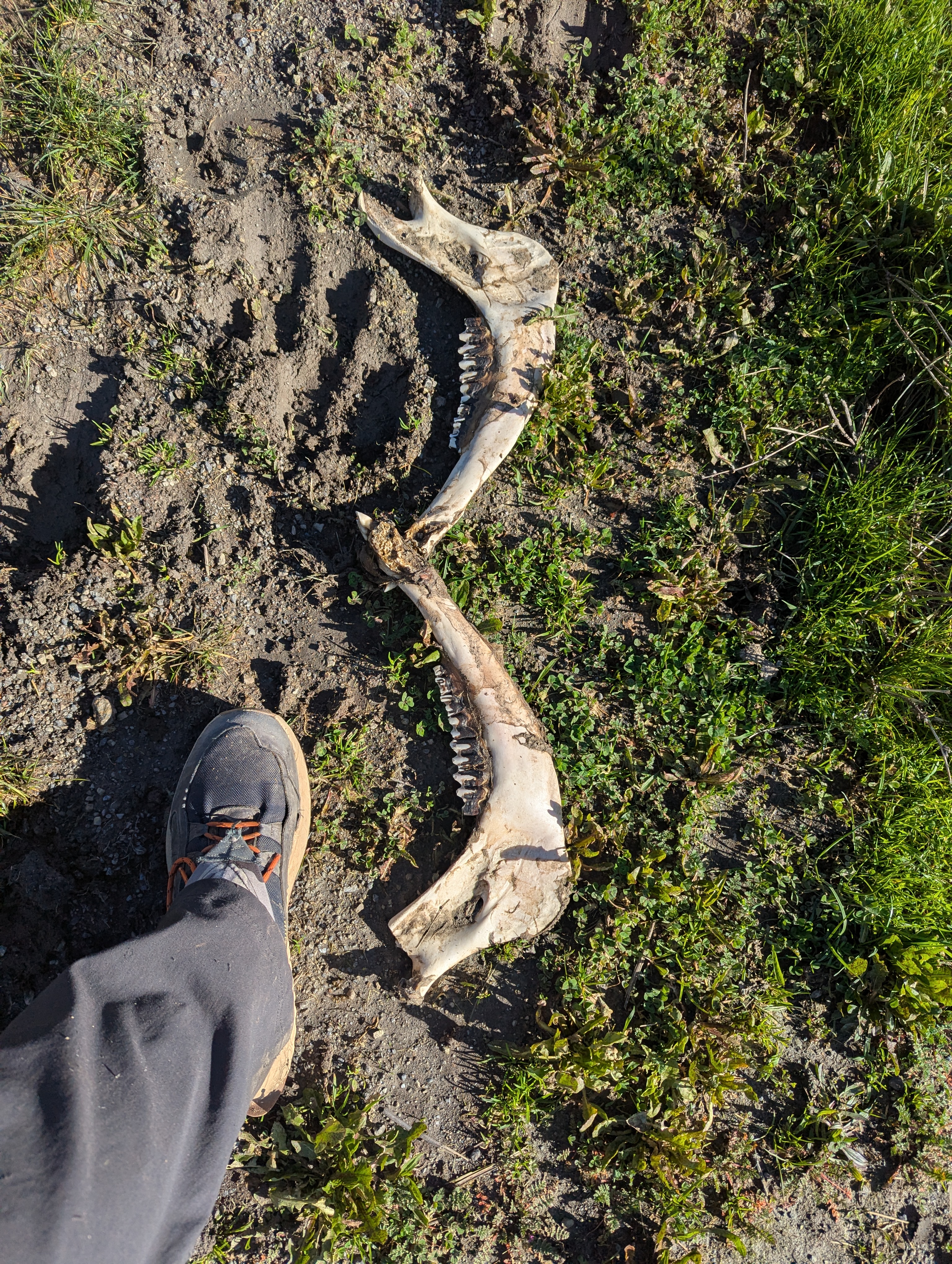I follow the road through thicker patches of oak forest as water pours down everywhere. It’s about 5pm when I pop out onto an open stretch of road where I find some cow bones. Well, that’s slightly unnerving. The hour is growing late and I don’t want to be on the menu of whatever might have killed this cow. Just downhill from me is the Coyote Creek Barn. Hmmm, lots of things named coyote in this area.