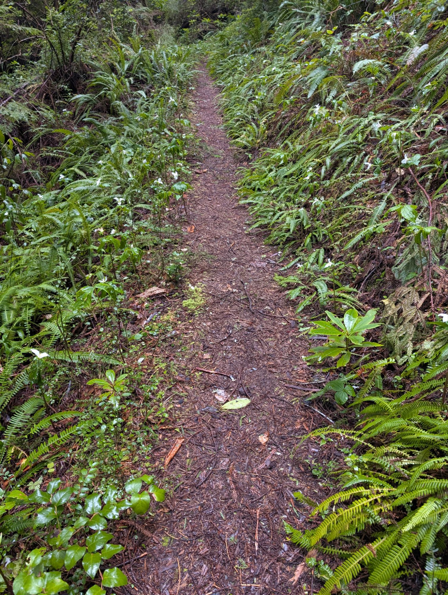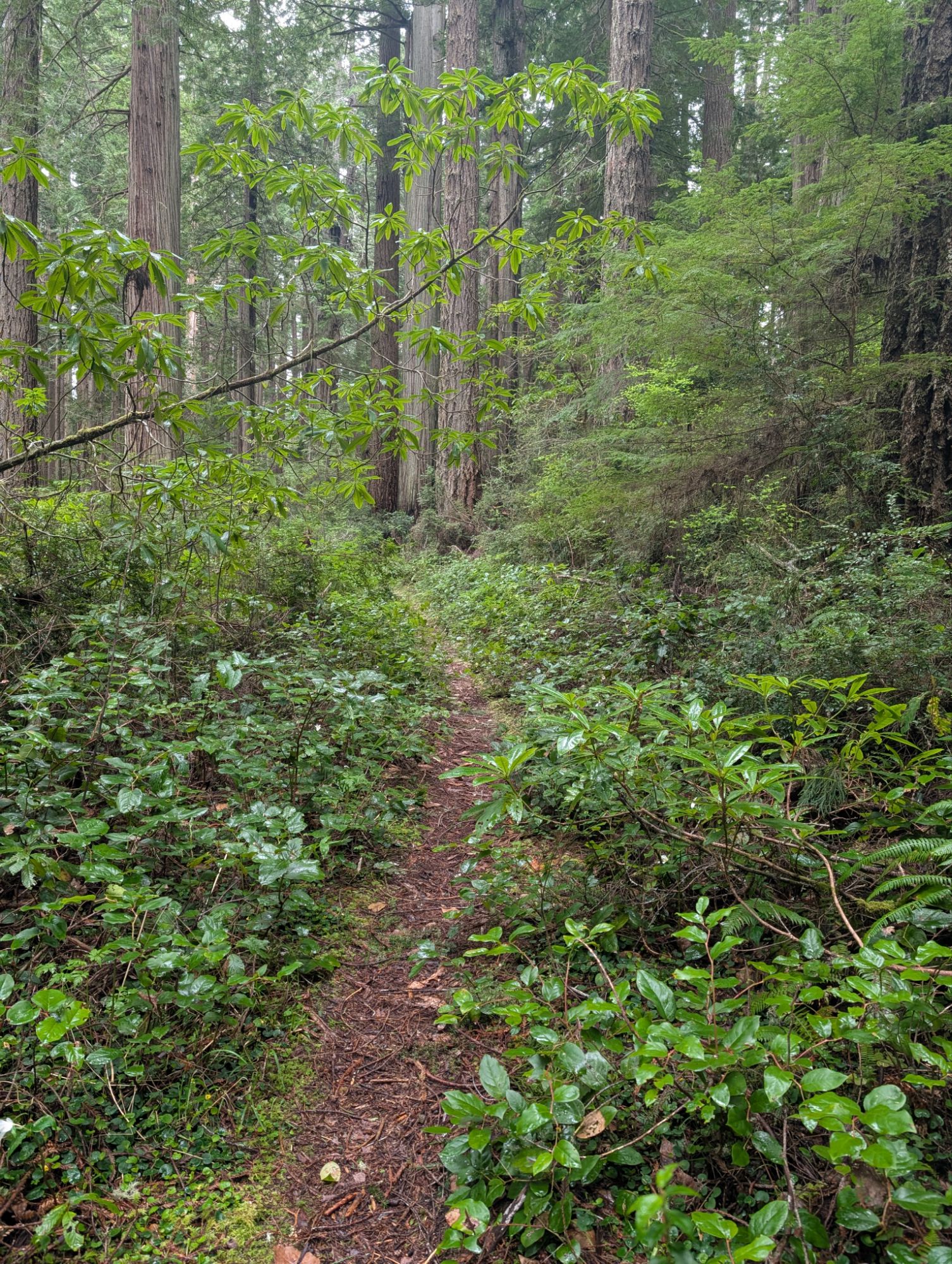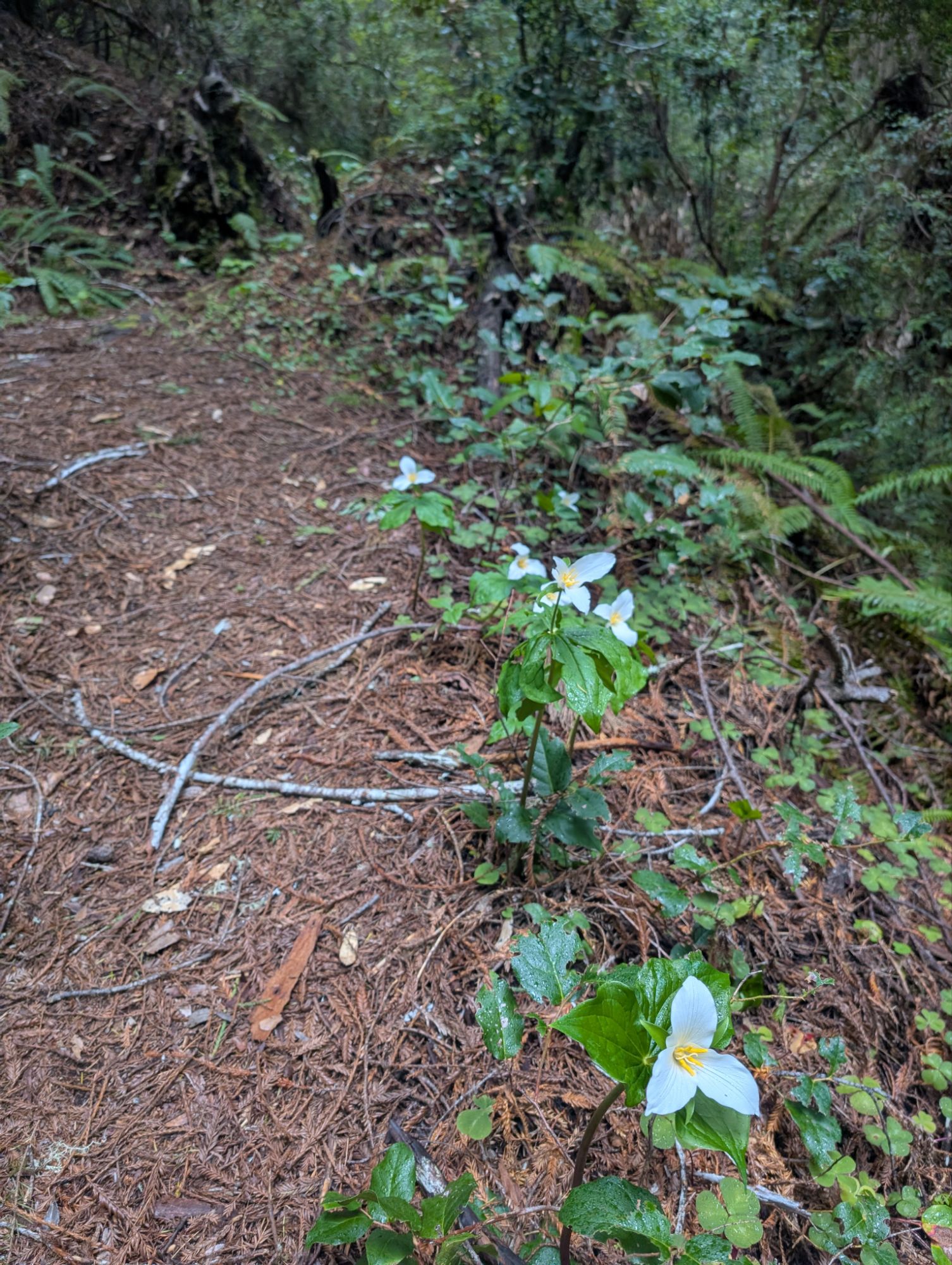 I grab my Inreach and phone but decide to leave behind my poles and umbrella. It’s 3 pm and I’m met by trillium as the trail starts climbing. The rain is still coming down gently as I pass old growth redwoods. The loop access trail climbs almost 100 feet over .7 miles and then I have to decide which direction to go.