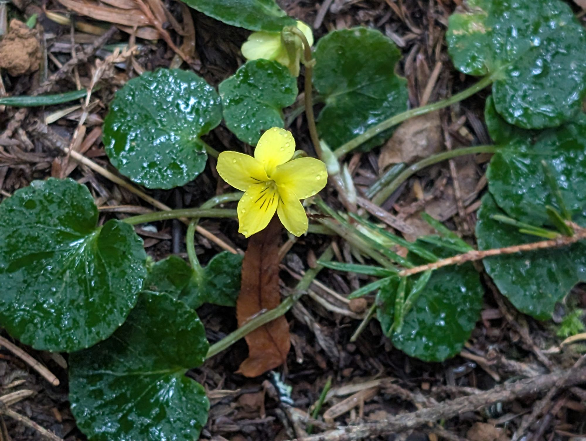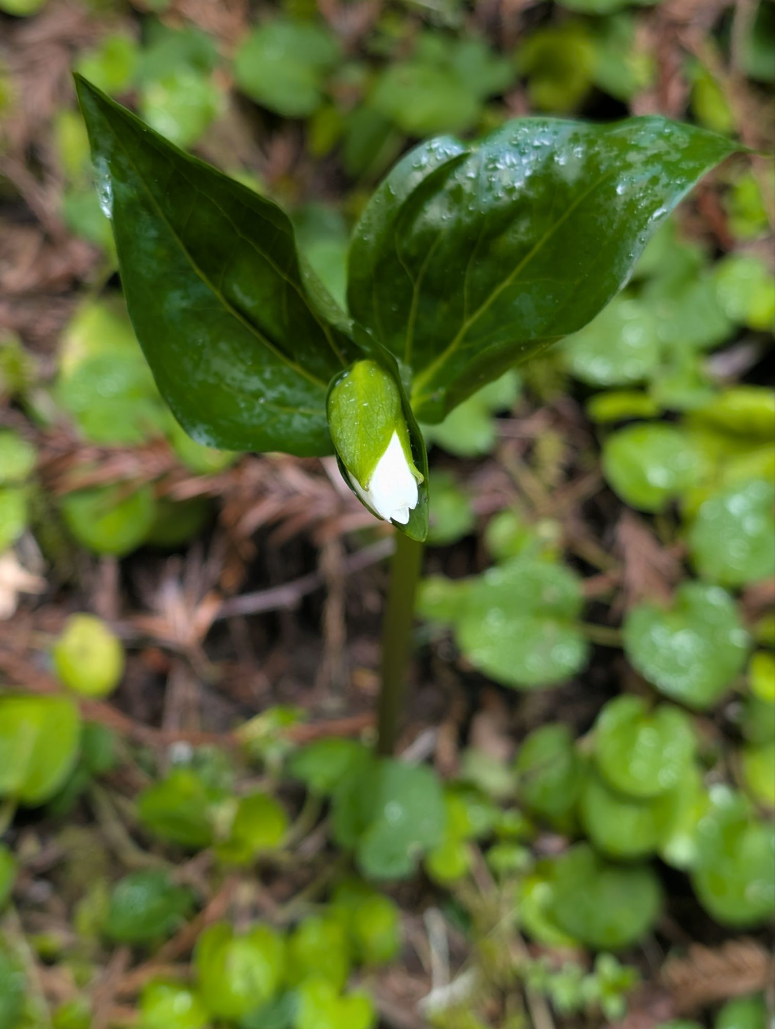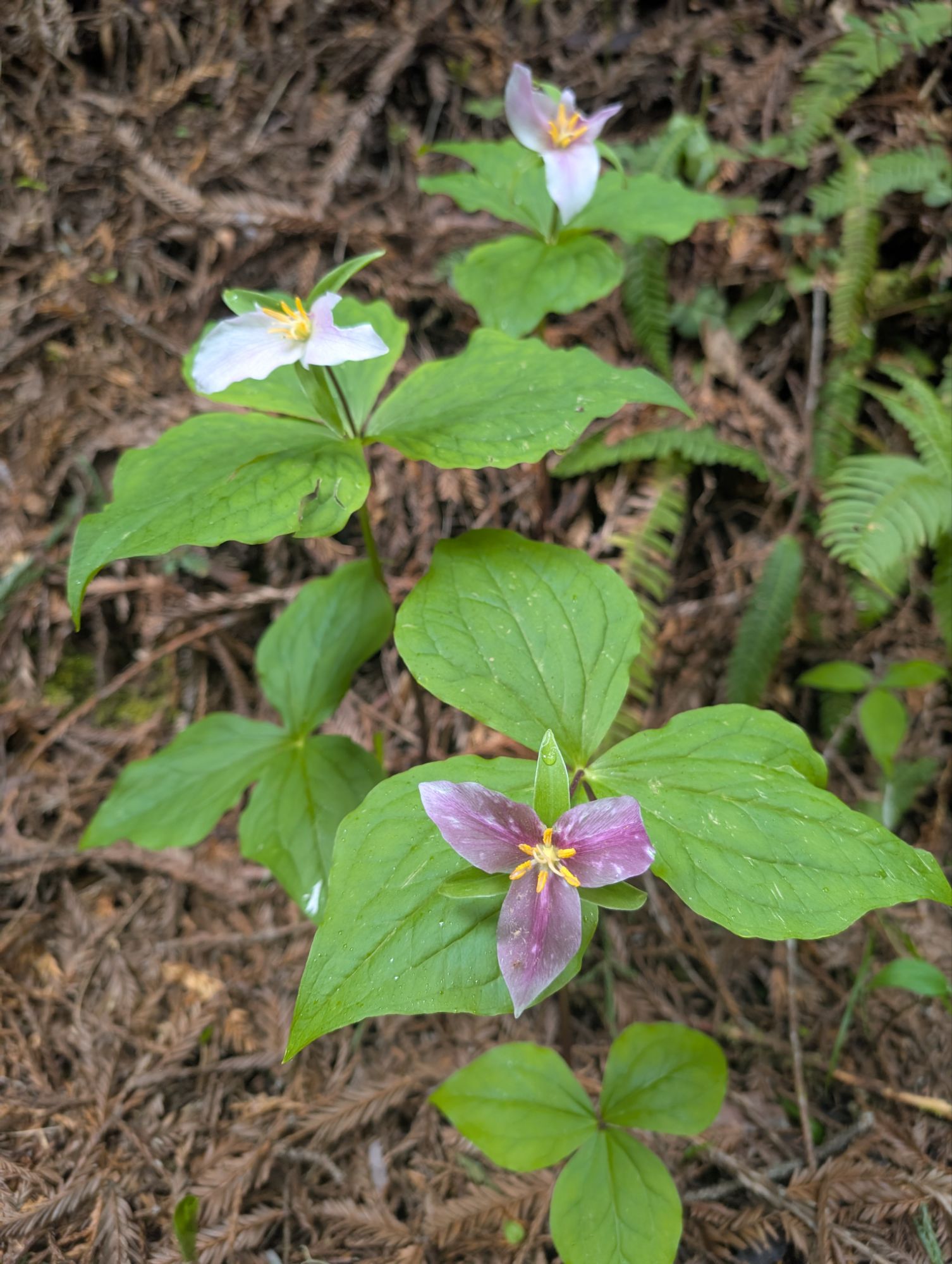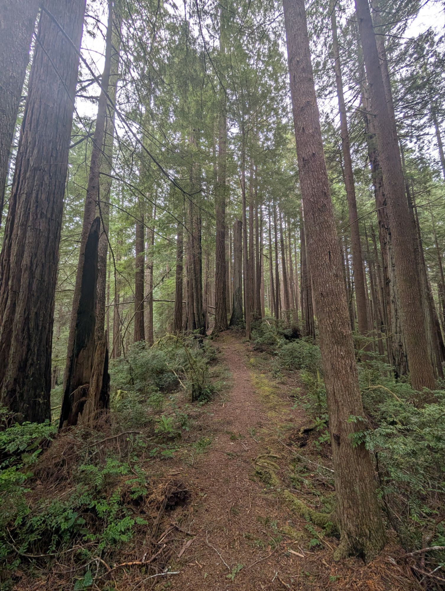 I grab my Inreach and phone but decide to leave behind my poles and umbrella. It’s 3 pm and I’m met by trillium as the trail starts climbing. The rain is still coming down gently as I pass old growth redwoods. The loop access trail climbs almost 100 feet over .7 miles and then I have to decide which direction to go.