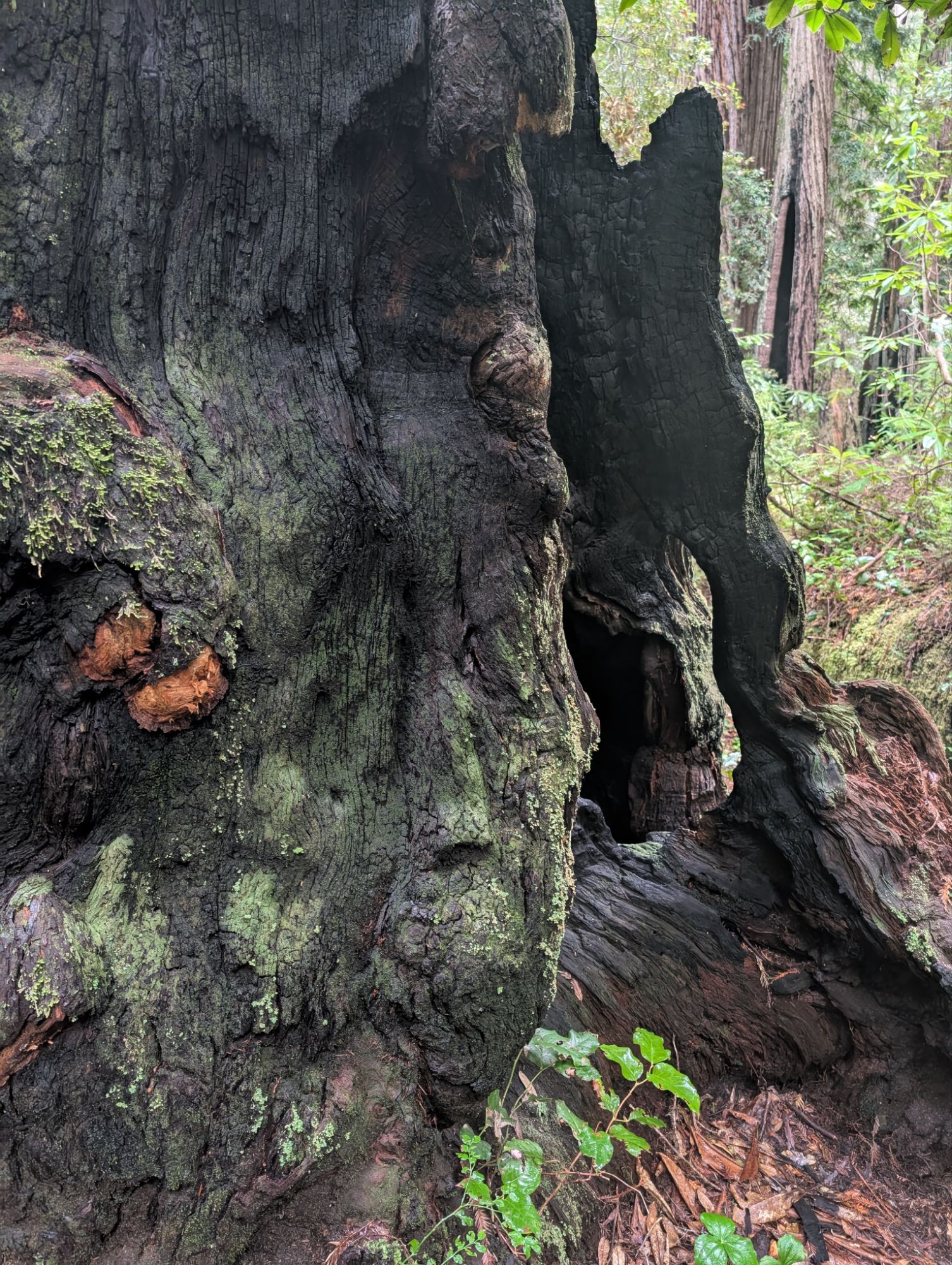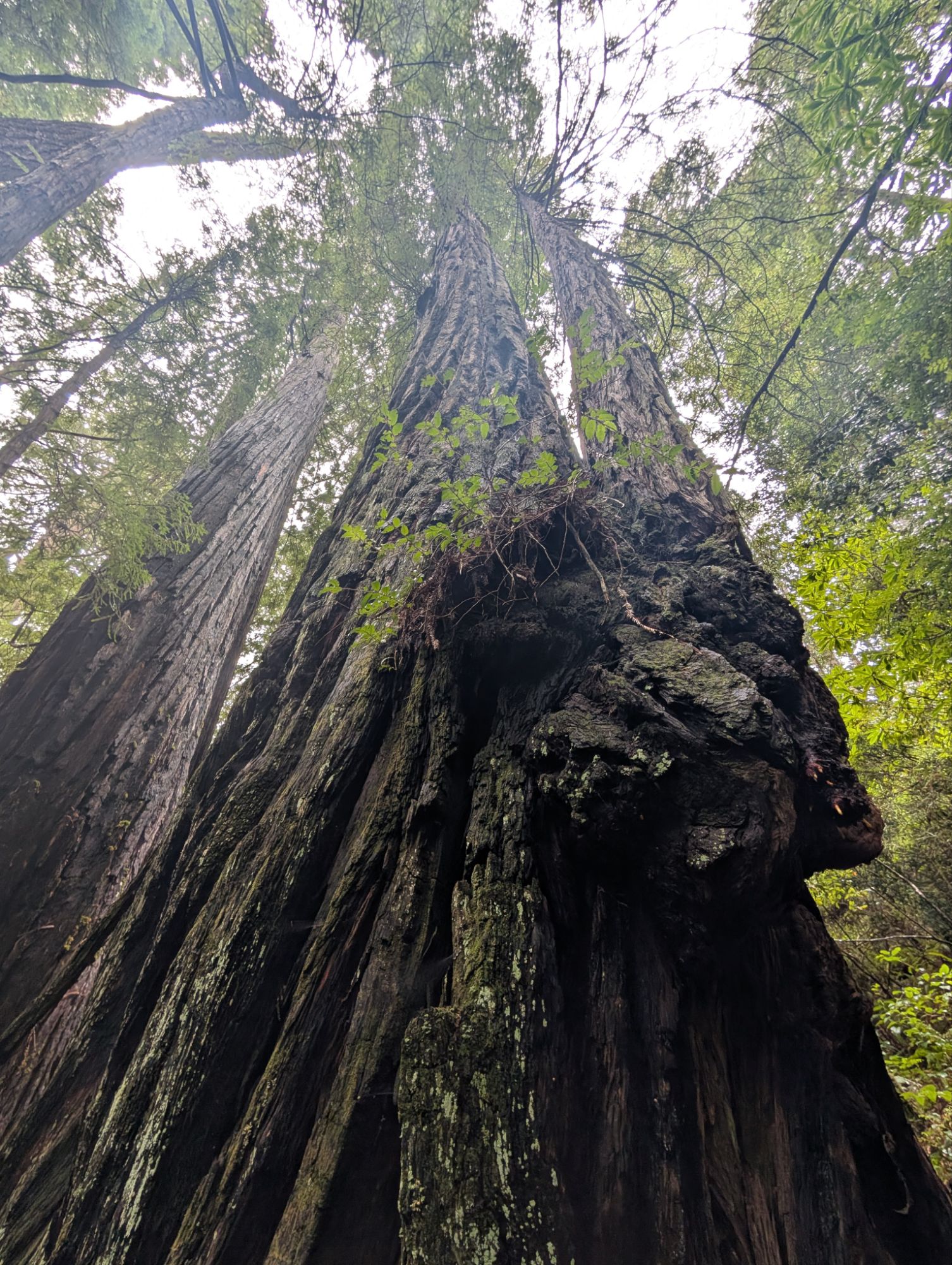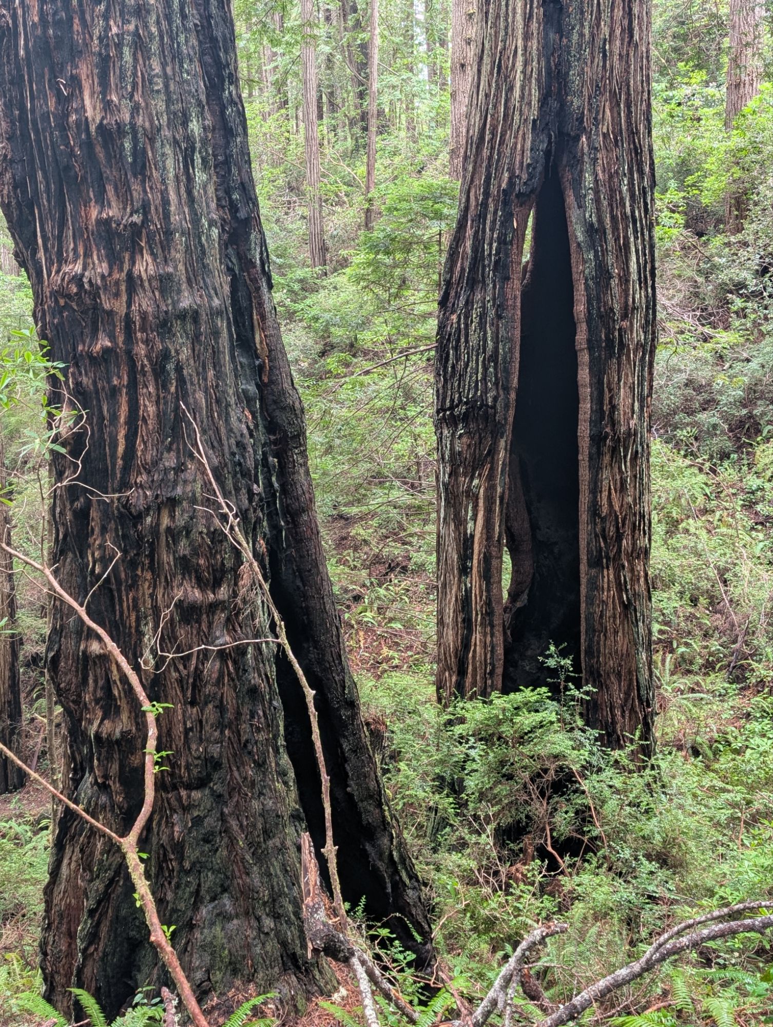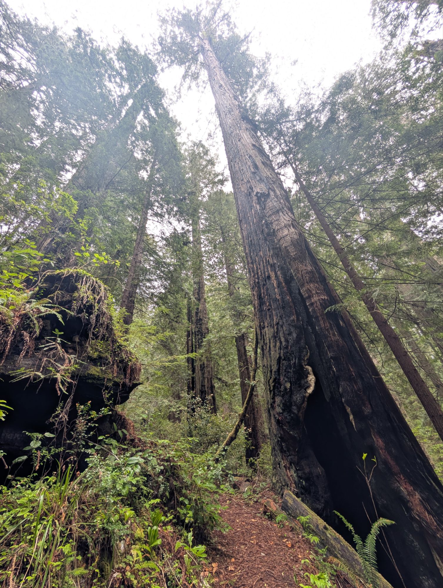I fork left, heading clockwise through the loop. The trail continues to climb and I pass incredible old growth redwoods with massive trunks. Trunks with fire scars and twisted, gnarled bark that tell the tales of time.