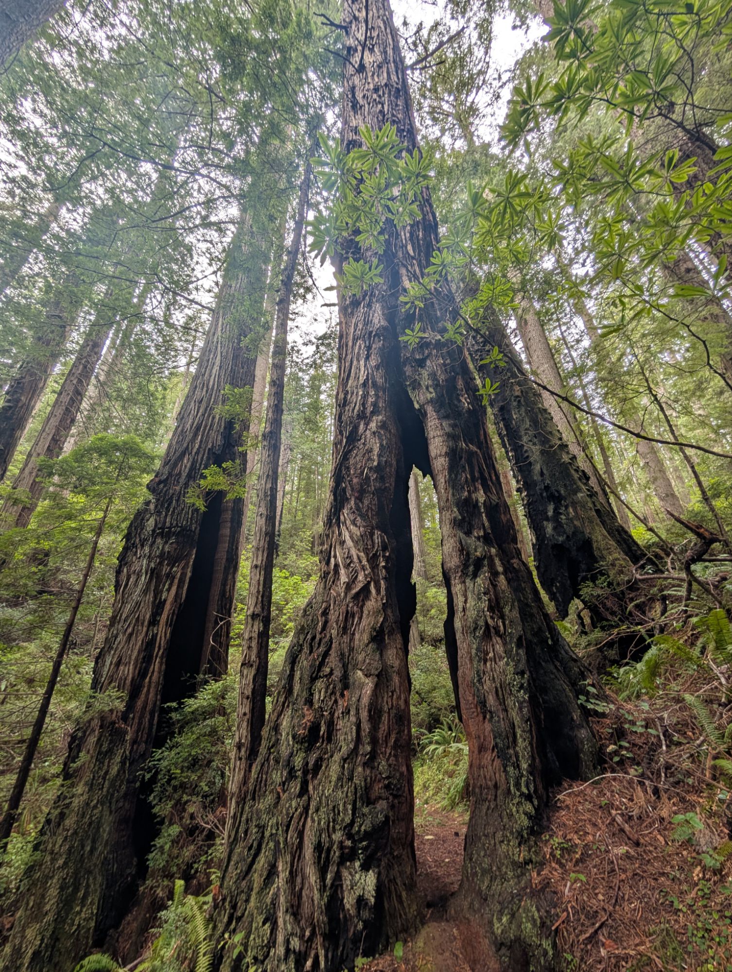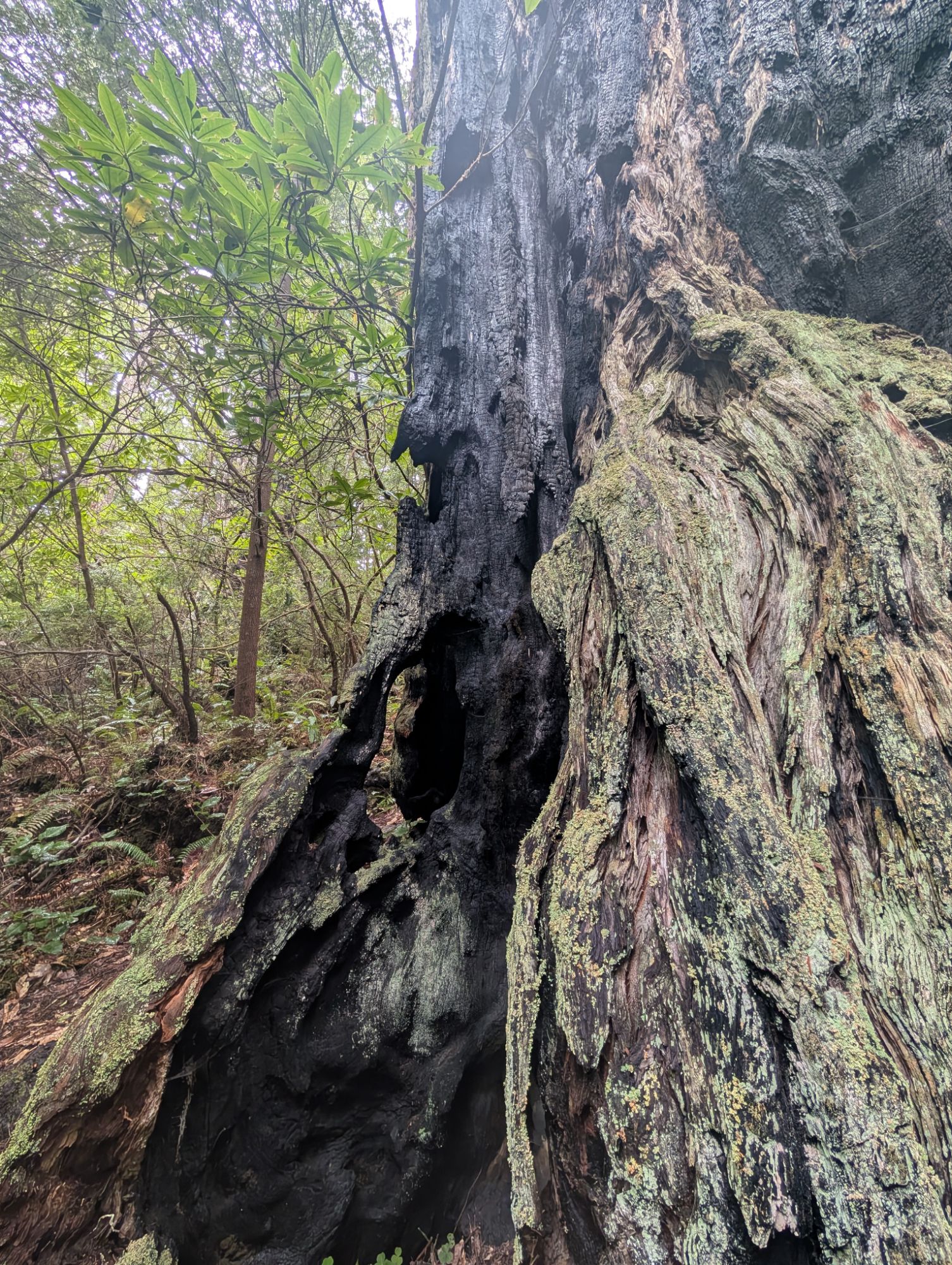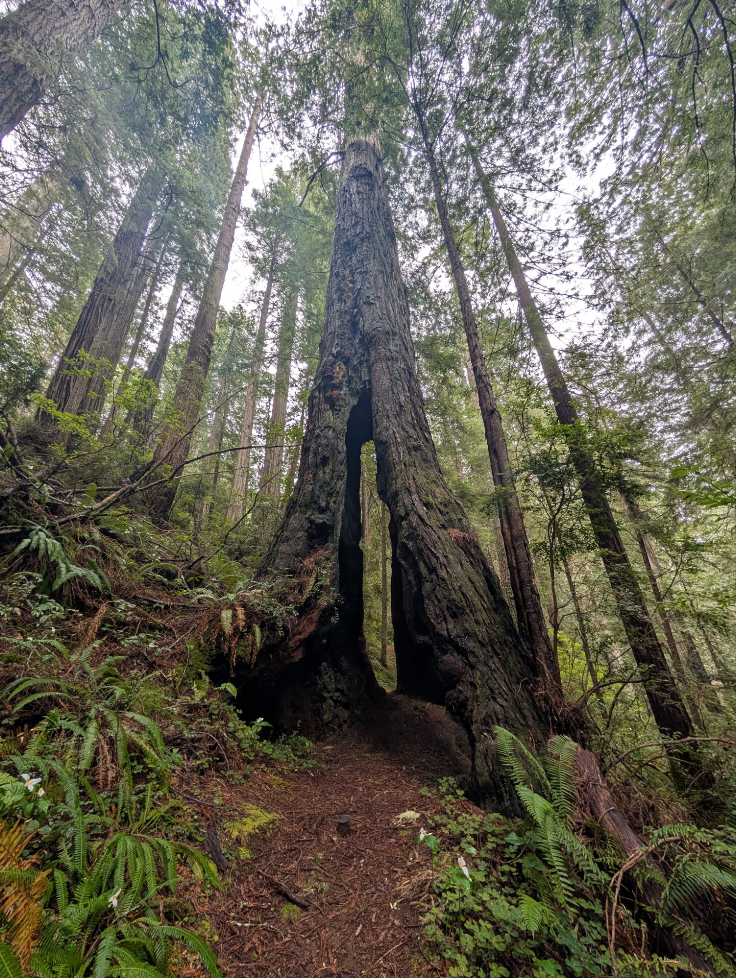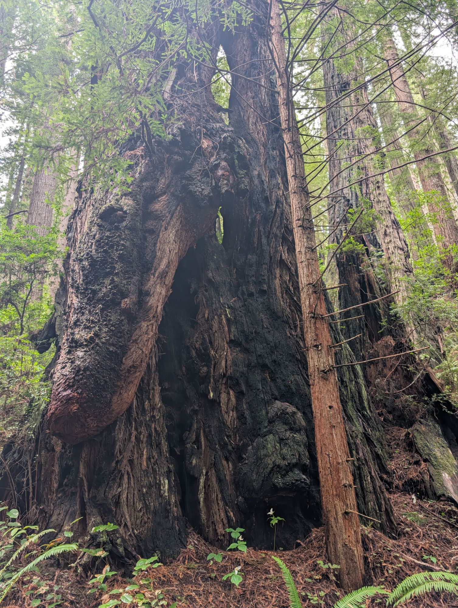 I fork left, heading clockwise through the loop. The trail continues to climb and I pass incredible old growth redwoods with massive trunks. Trunks with fire scars and twisted, gnarled bark that tell the tales of time.