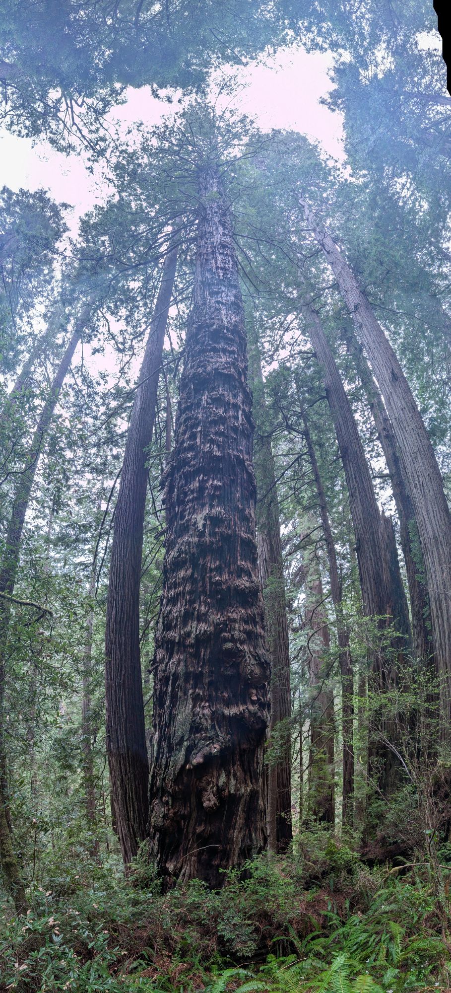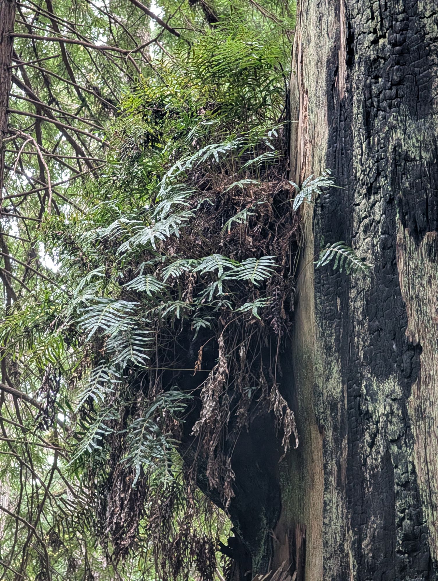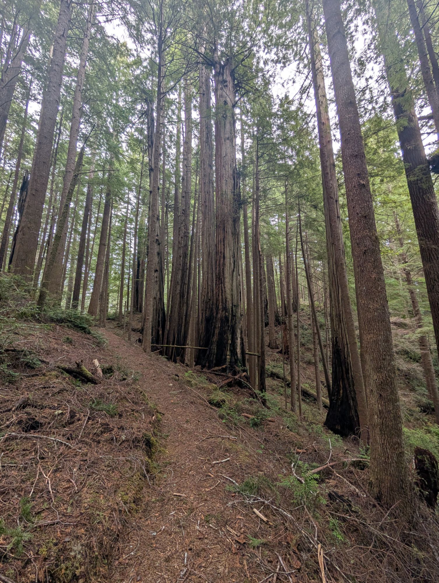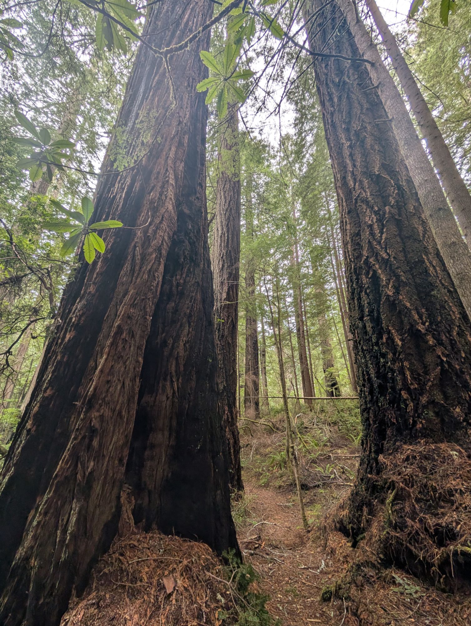 I fork left, heading clockwise through the loop. The trail continues to climb and I pass incredible old growth redwoods with massive trunks. Trunks with fire scars and twisted, gnarled bark that tell the tales of time.