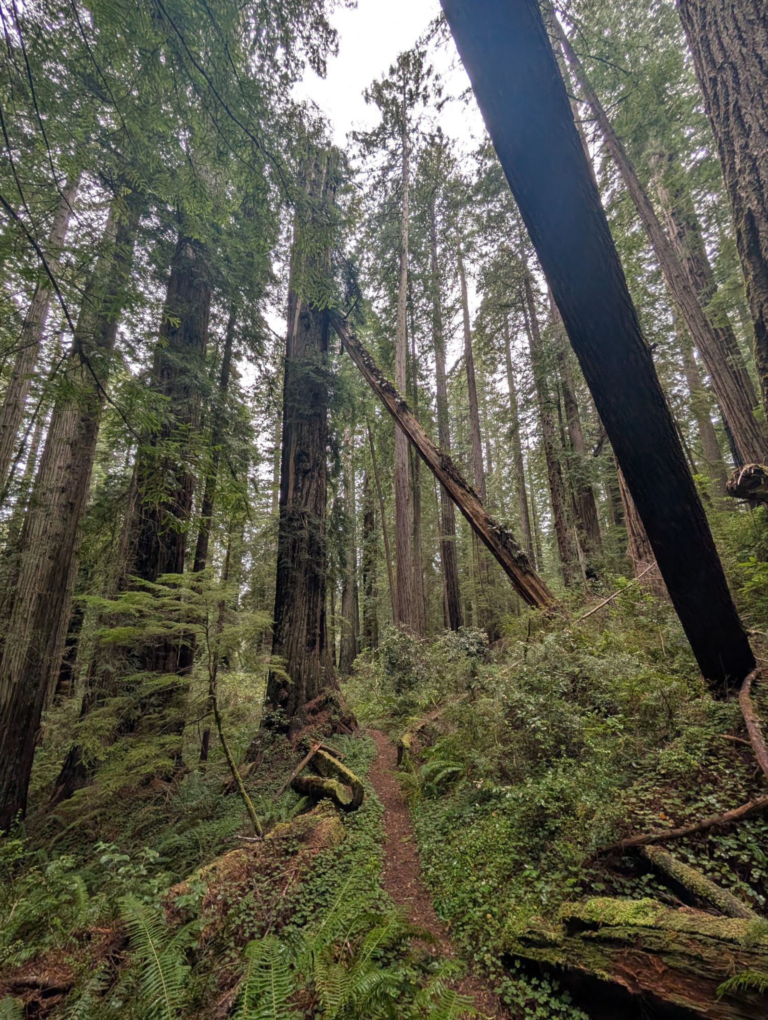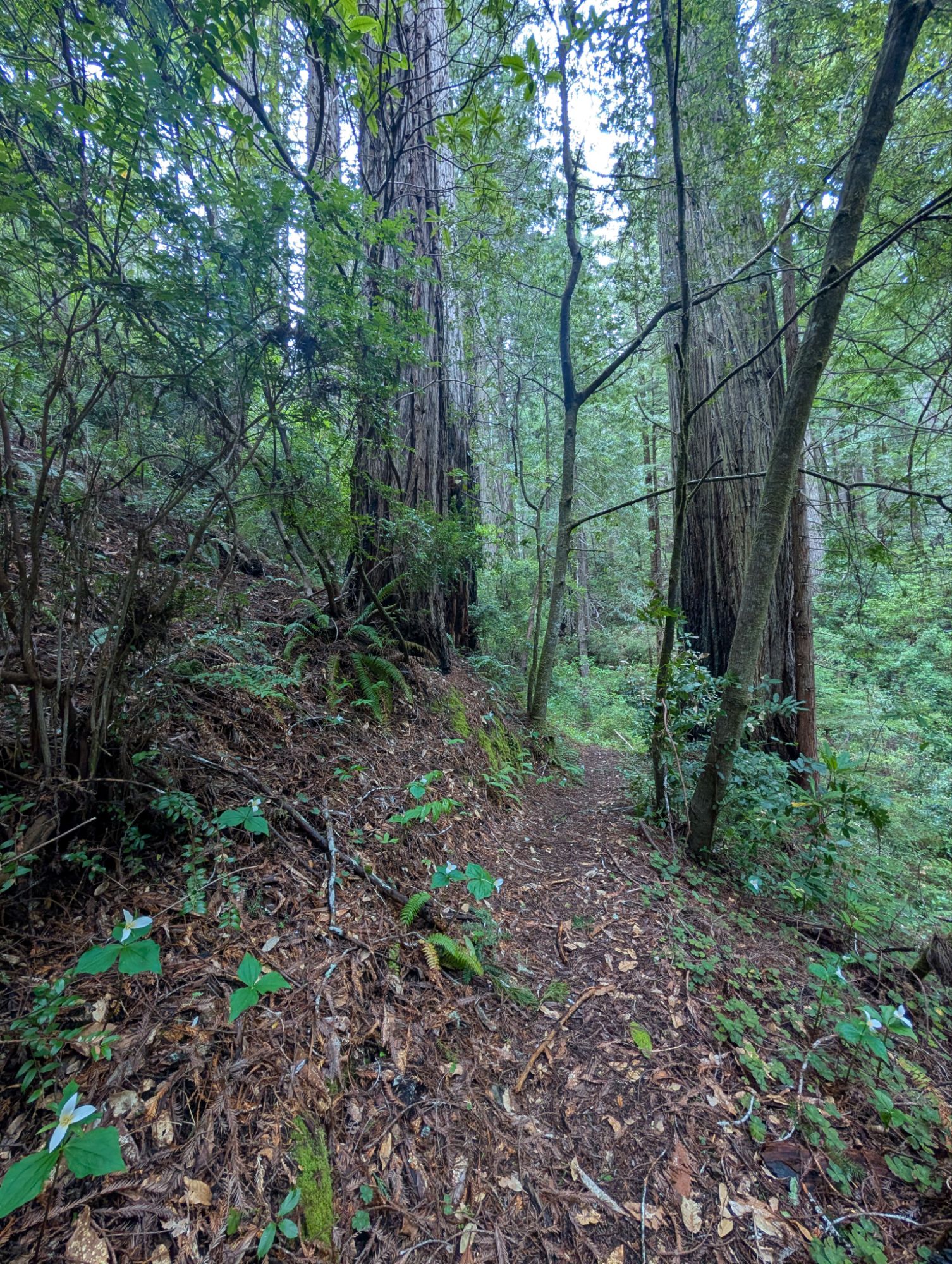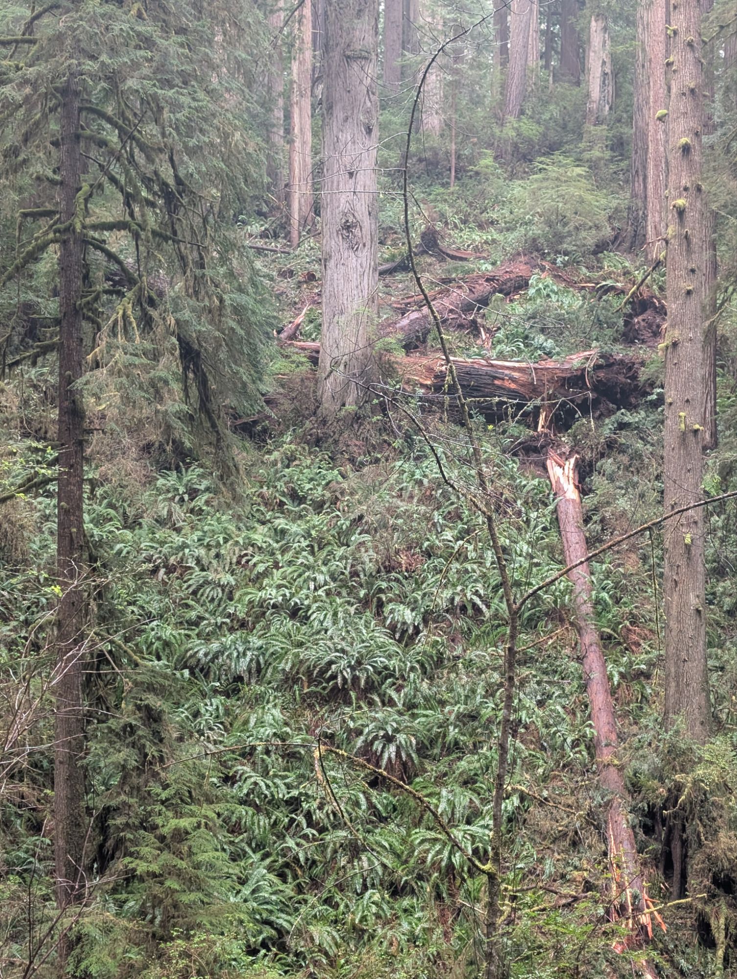 I come around a corner and find just about the biggest redwood mess I think I’ve ever seen. There are downed trees and sheared off branches everywhere and I can’t tell where the trail heads. I have this moment of worry that I might have to backtrack all the way through the loop. I look across the Hope Creek drainage and can see a switchbacking trail on the other side. Maybe I need to go down and connect to that. I start to follow what I think might be the way down but quickly pause to reassess. I look up the canyon and think I can see the cut of the trail in the hillside. So, I step back up to where I started and then move laterally through branches and then under a tree. I’m grateful to not be wearing my full backpack. Pick my way down and around a stump and then I miraculously see the trail ahead of me.