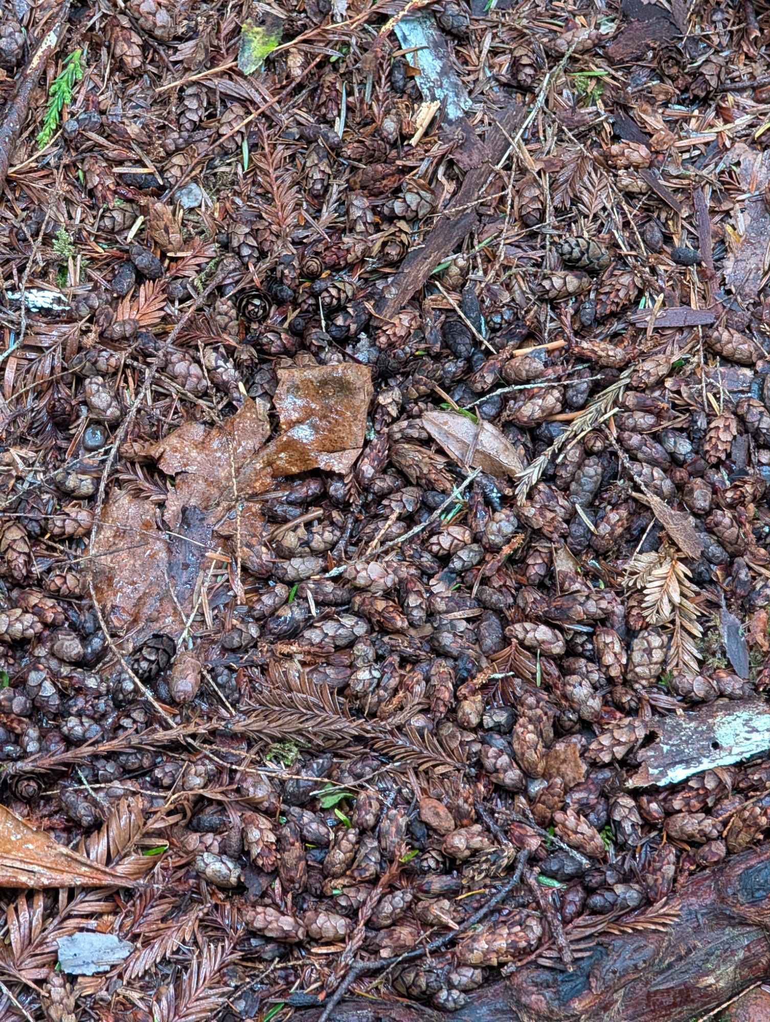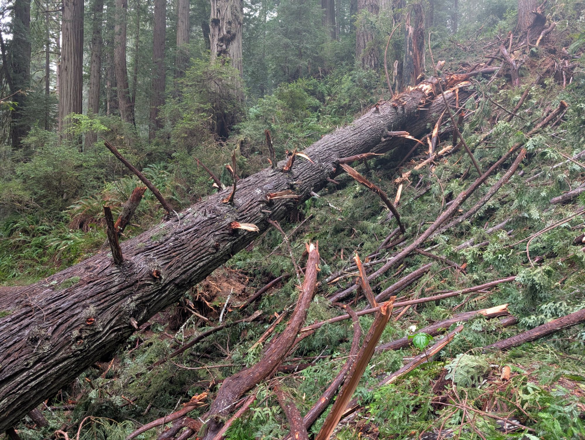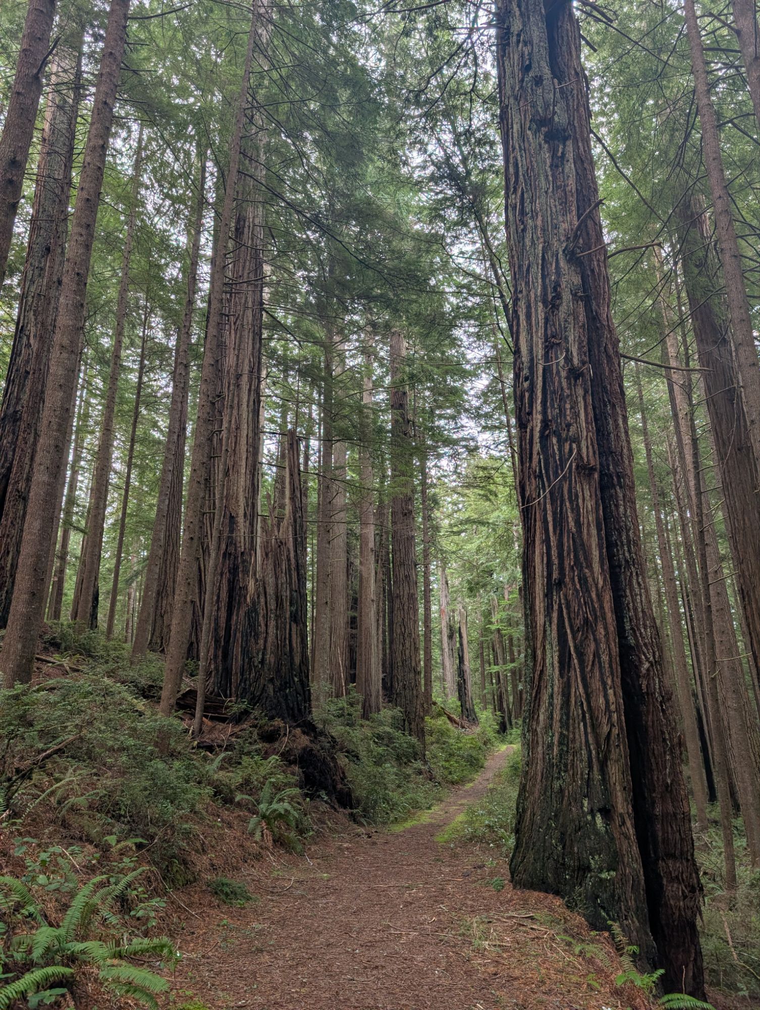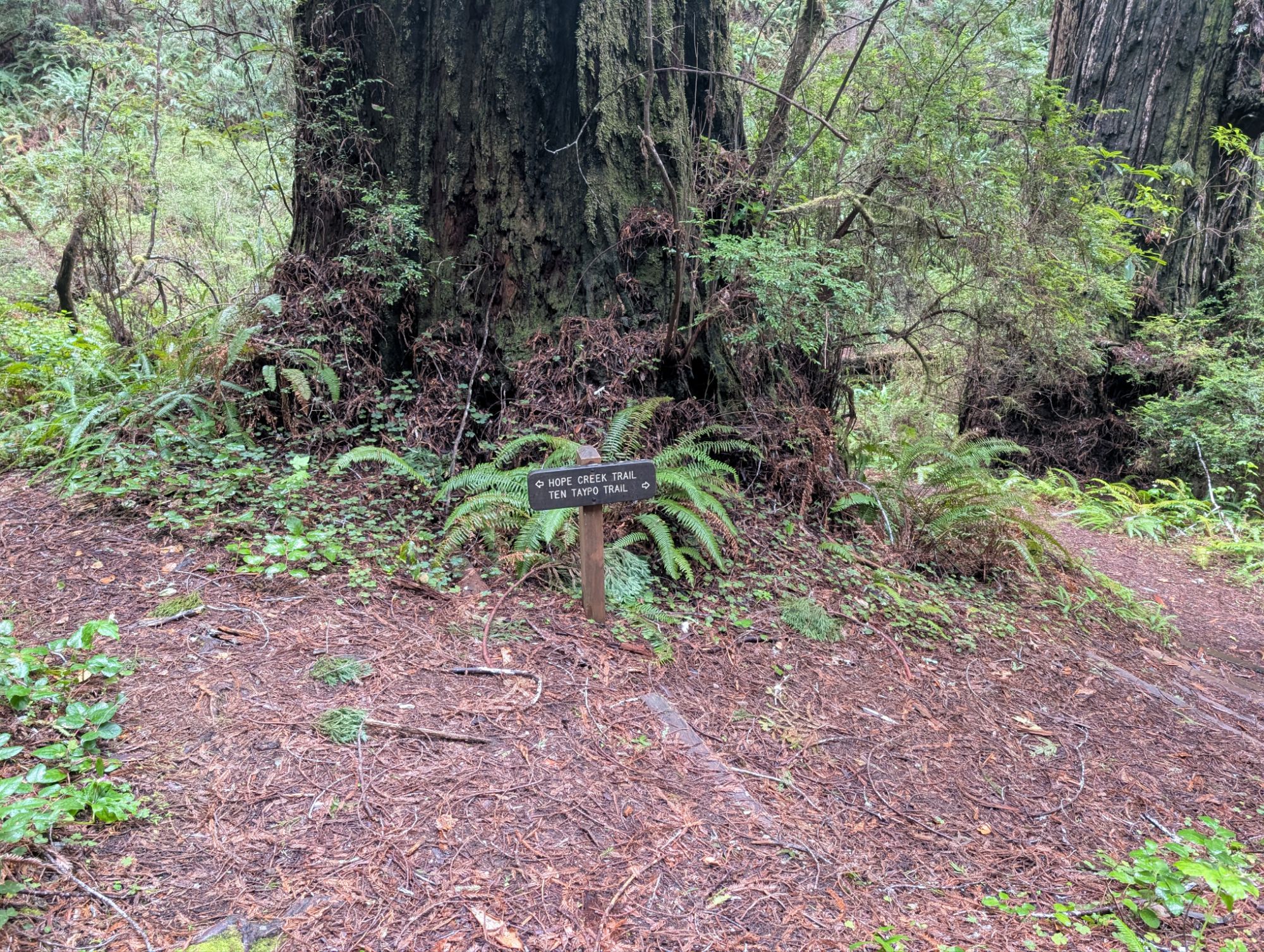 I come around a corner and find just about the biggest redwood mess I think I’ve ever seen. There are downed trees and sheared off branches everywhere and I can’t tell where the trail heads. I have this moment of worry that I might have to backtrack all the way through the loop. I look across the Hope Creek drainage and can see a switchbacking trail on the other side. Maybe I need to go down and connect to that. I start to follow what I think might be the way down but quickly pause to reassess. I look up the canyon and think I can see the cut of the trail in the hillside. So, I step back up to where I started and then move laterally through branches and then under a tree. I’m grateful to not be wearing my full backpack. Pick my way down and around a stump and then I miraculously see the trail ahead of me.