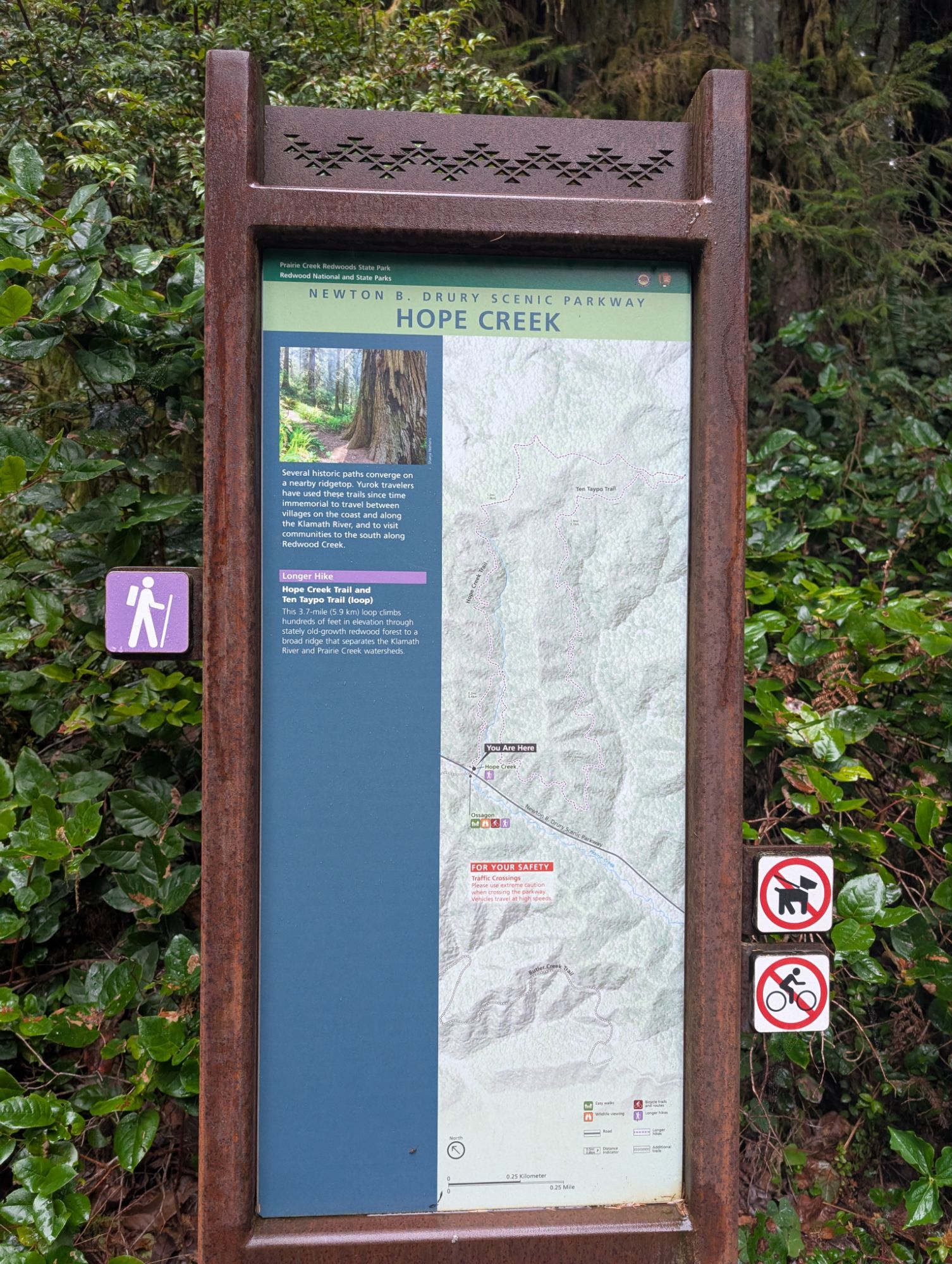 The trail meanders through the forest while it climbs another 300 feet to a ridge. I can suddenly hear the occasional hum of traffic from highway 101. This ridge line is unique for many reasons. It is the dividing line between the Klamath River and Prairie Creek watersheds. It is also the convergence of several historic paths. From the interpretive sign at the trailhead: ” Yurok travelers have used these trails since time immemorial to travel between villages on the coast and along the Klamath River, and to visit communities to the south along Redwood Creek.”