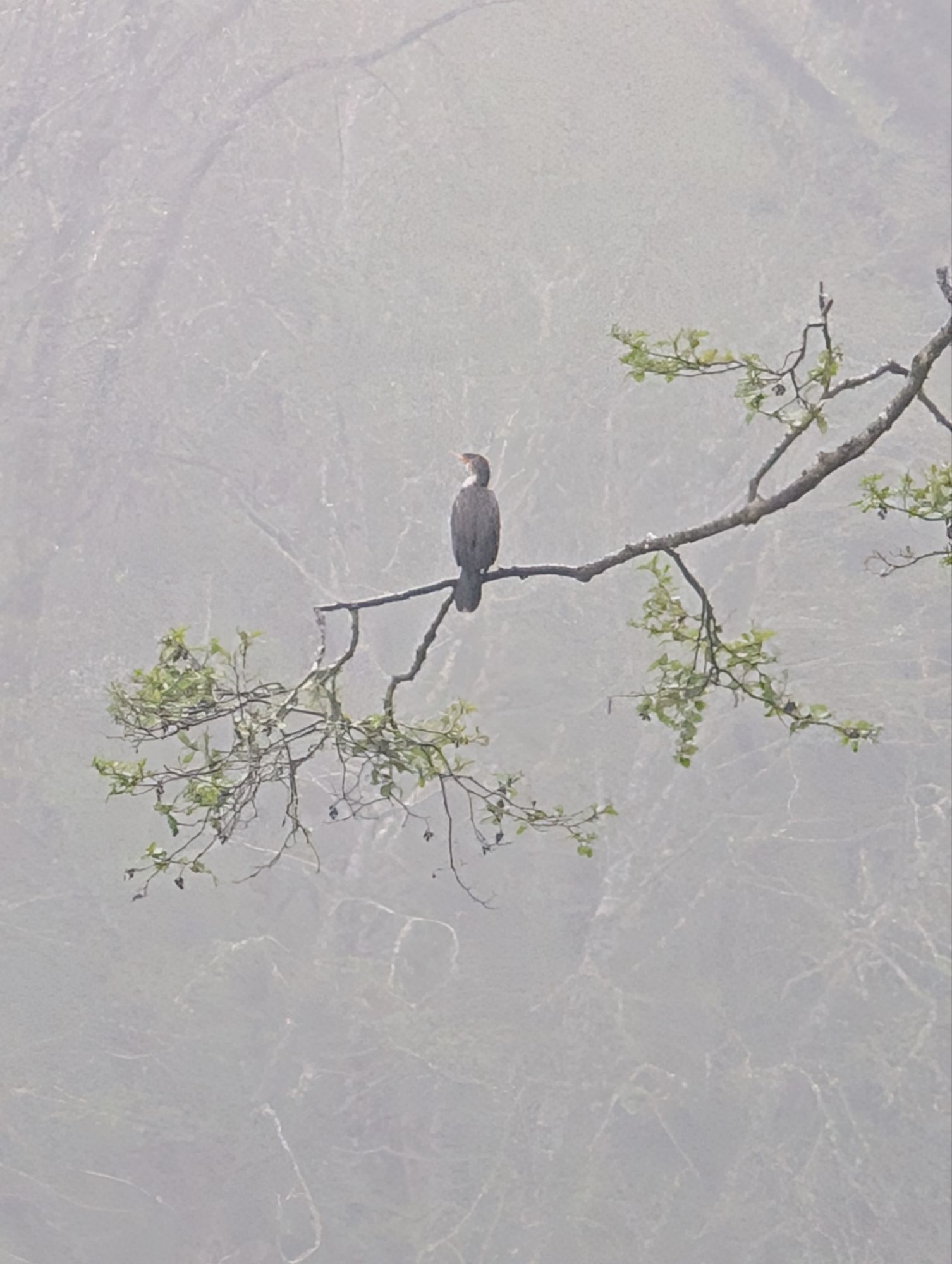 I take the first exit after crossing over the Klamath River and then turn onto Alder Camp Road. I drive into the High Bluff Overlook where there are no people and similarly, no view. I drive back out and continue on the Coastal Drive Loop. Even though I’ve decided to head home I make a deal with myself that I will stay the night if there are no cars at the Flint Ridge parking area. I go slowly on the dirt road and find that there are two parked cars. Looks like someone is trying to make camp inside their car. Even though the vistas are currently obscured, I can tell that this area is spectacular and deserves to be experienced in better weather. I’ll see if I can get back this weekend! The road loops back down to the south bank of the Klamath River. I stop at a pullout where I see a pair of giant birds high in the trees at the river’s edge. My pictures are not clear but they seem to be cormorants. Double-crested cormorant? But probably a Great cormorant!