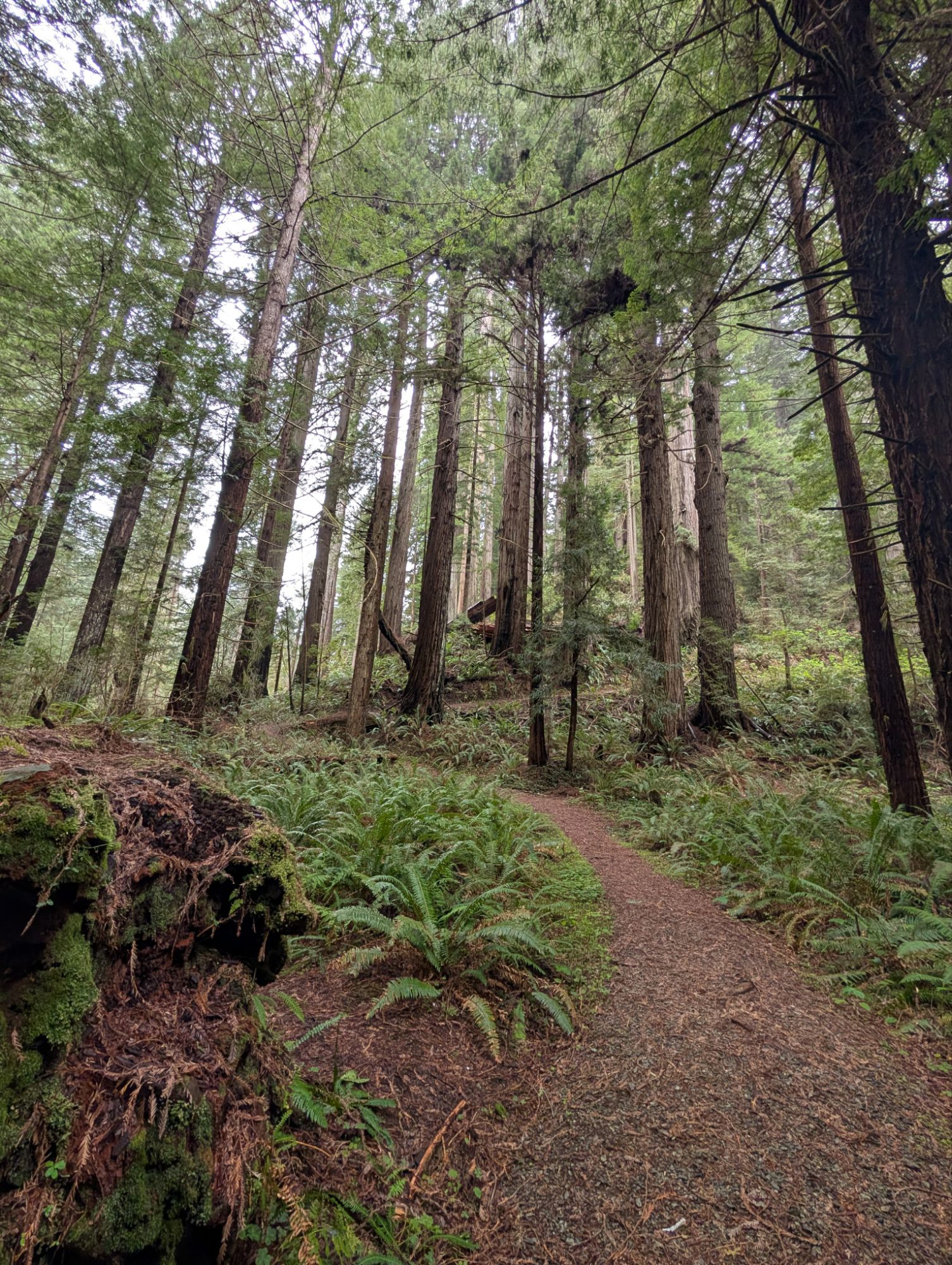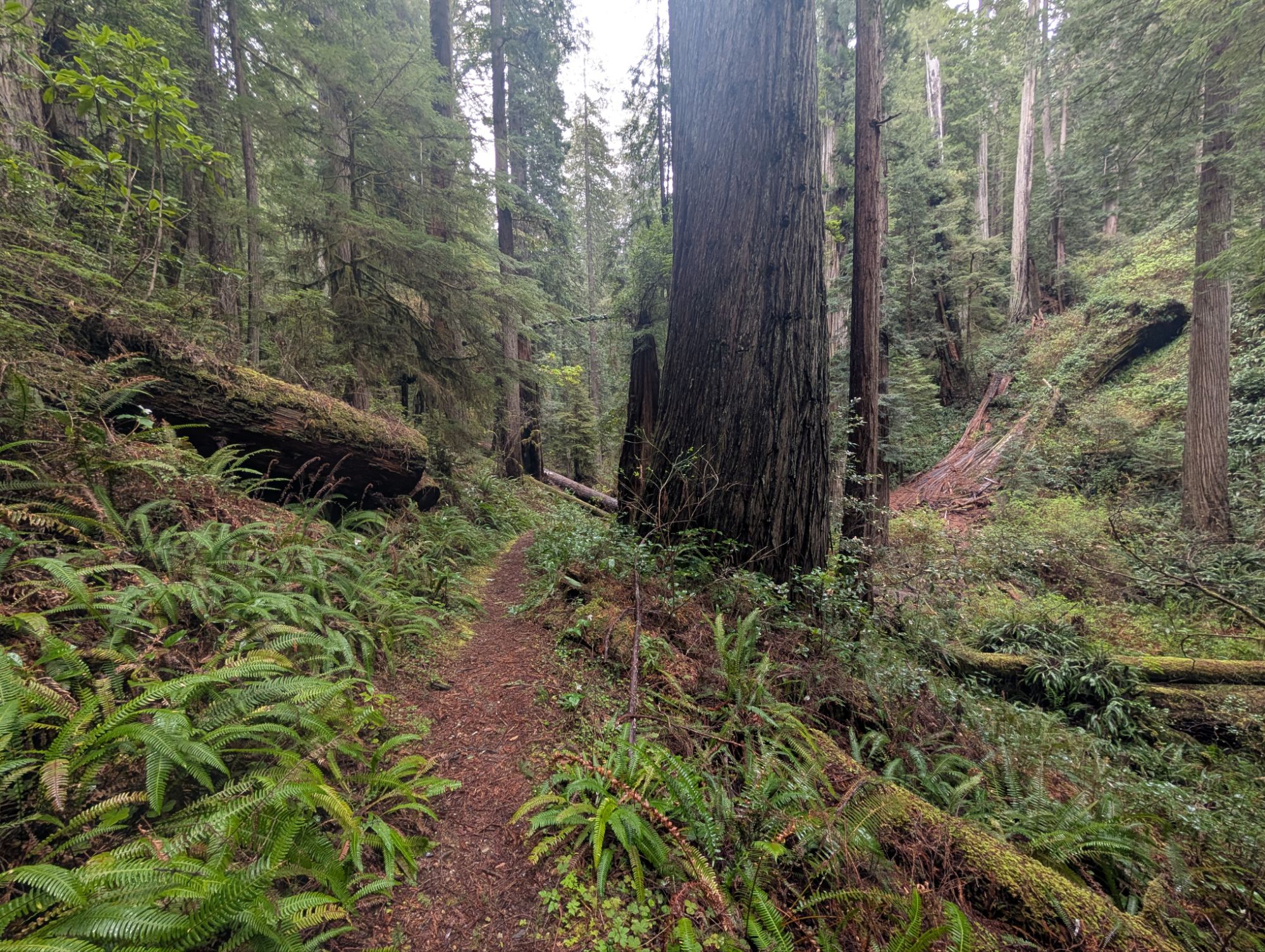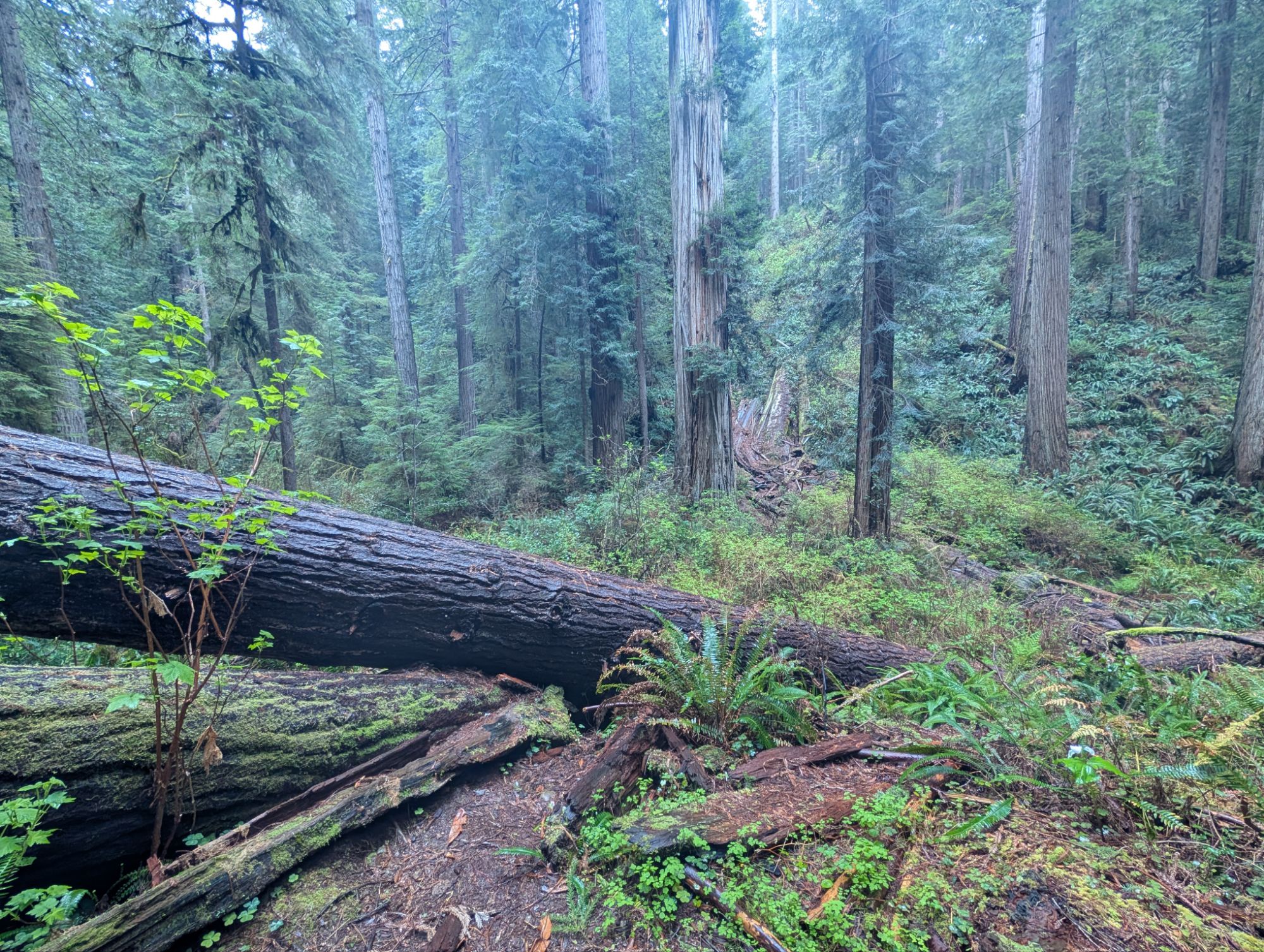 I don’t hike too much farther when I arrive at some downed redwoods blocking the trail. I can’t tell if this is actually the end of the trail so I decide to look around. I want to look over the trunk of a large redwood in front of me so I step down through some branches. As I maneuver down, I place my foot onto a small but wet branch and I immediately crash to the ground. Because my umbrella is in my left hand I fall awkwardly and my left shoulder feels like something really bad has happened. My garmin watch starts beeping at me because it knows that I’ve been in an accident. I’m not sure what would happen if I weren’t able to cancel the alert. Would someone come rescue me? Regardless, I have my Inreach if I truly have an emergency. I lay there awhile waiting for the pain to subside. I crawl to my feet and look over the redwood. I don’t see any trail. I climb back up to the main trail where there’s a faint path that goes uphill along another downed redwood. I reach its end and look around. I can’t see any sign of trails past this wall of redwoods. I turn around and start my way back to the trailhead. This trail really is lovely but between the tick and me falling, I’m ready to get the heck out of here. I get back to my truck and take my missed dose of morning meds and some vitamin I.