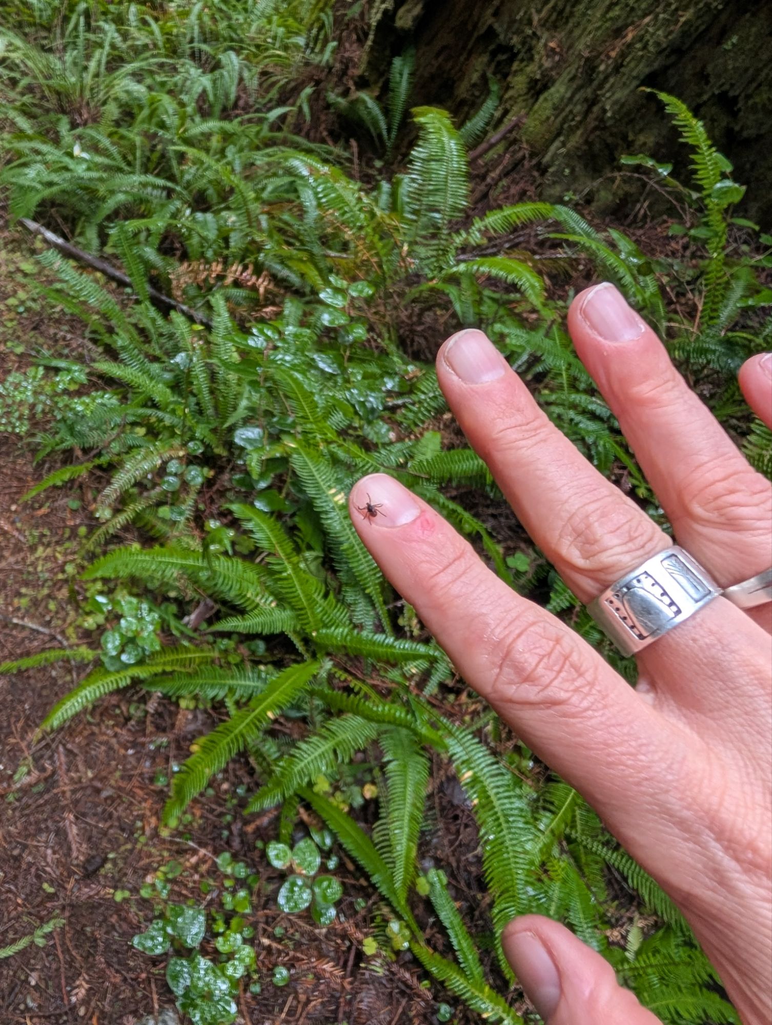 As I hike along, it feels like something is pinching me near my neck/chest. I adjust my shirt several times thinking that it must be poking me. When that doesn’t solve the problem, I reach my hand in and feel around. Is that a mole or could it be a tick? I can’t actually see the top of my chest so I take a selfie to investigate further. Sure enough, I have a tick that is absolutely chomping down on me. I probably picked it up back on the Skunk Cabbage Trail. I do my best to twist out the tick which I can’t actually see. Luckily, without too much trouble it comes loose. I manage to get a picture of it but the sucker is making fast tracks across my hand. So, here’s your friendly reminder that if you’re hiking in the springtime, make sure you check for ticks. This is the first tick I’ve ever gotten on me while doing my Humboldt Hiking.