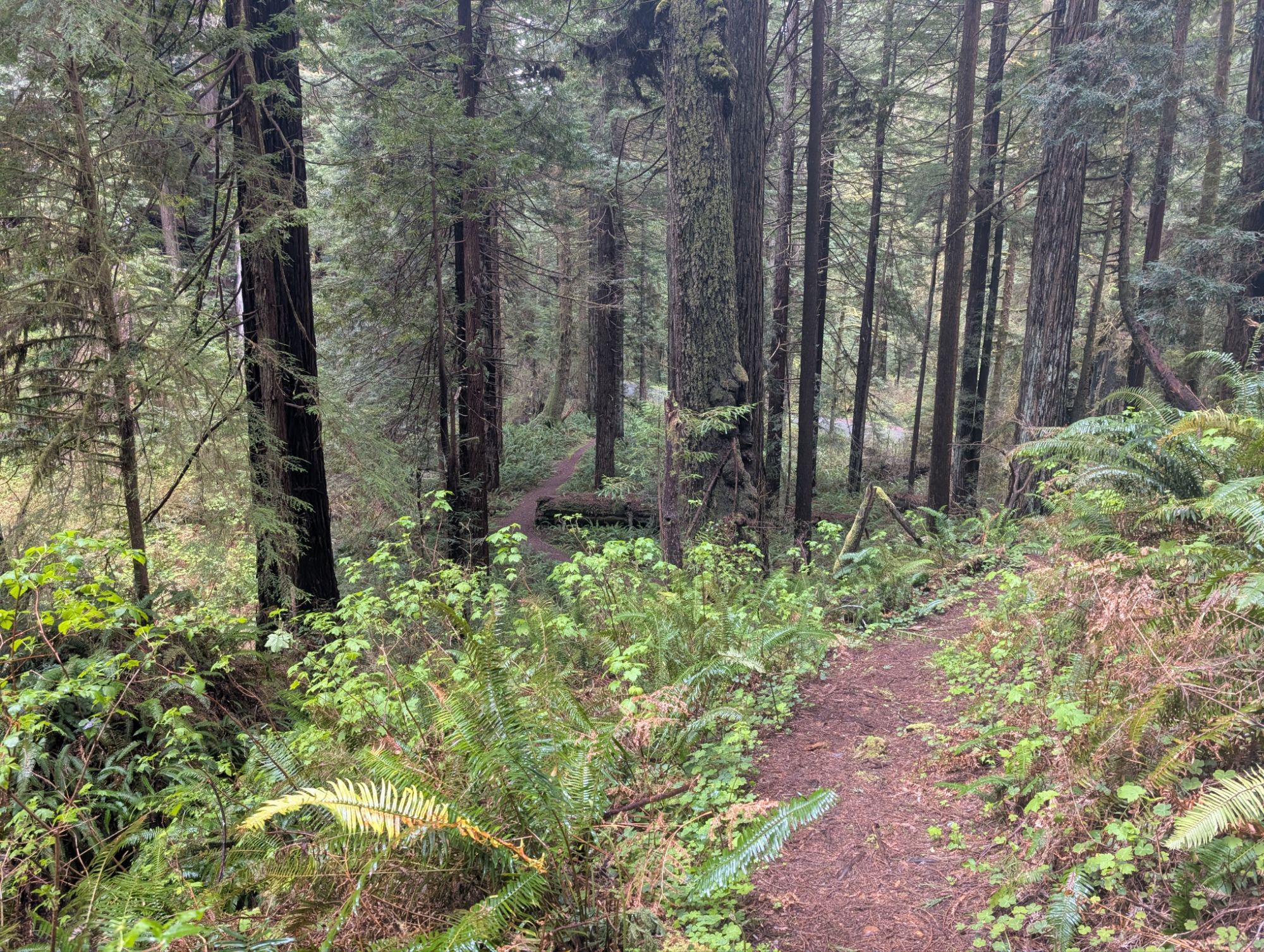 This short trail is a real gem, and given the limited parking at the trailhead, it’s likely that you can have it all to yourself. This could be a wonderful destination for your out-of-town friends who want a short hike but unique walk away from the crowds. There are beautiful redwoods on both sides of the canyon and the audible Sweet Creek adds to the ambiance. There might have been diminished traffic on Drury Parkway due to the rain, but I did not hear any road traffic when farther up the canyon.