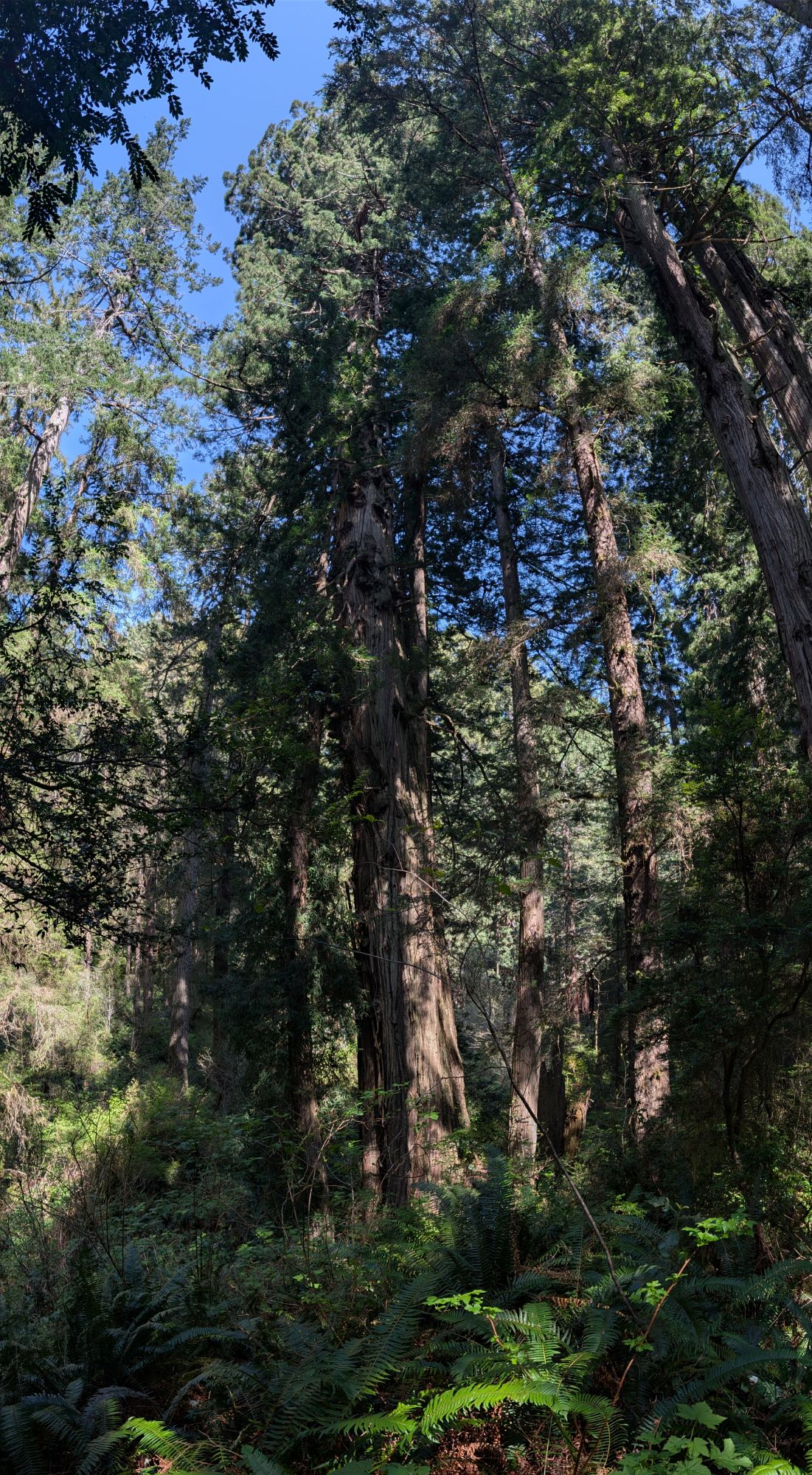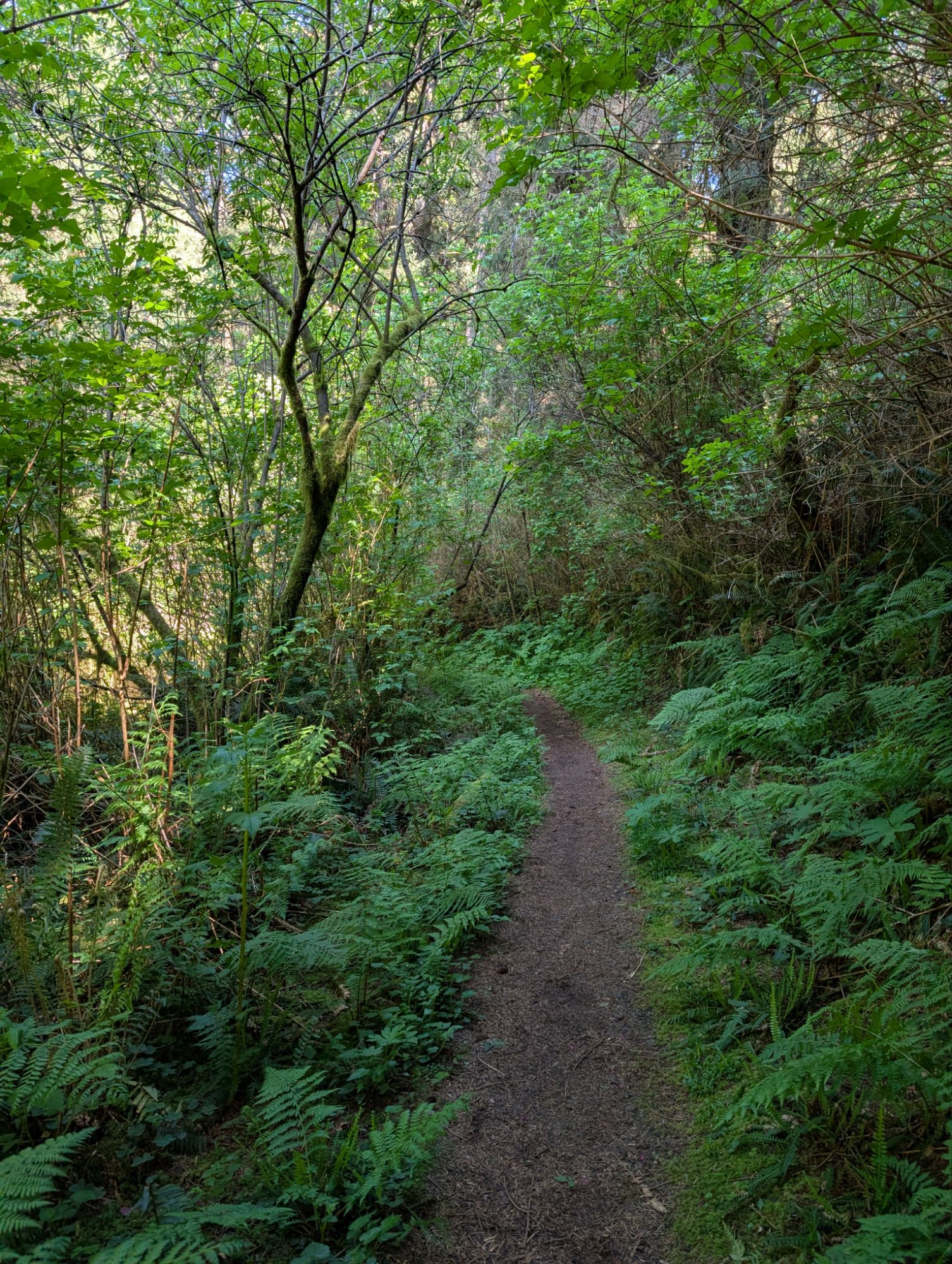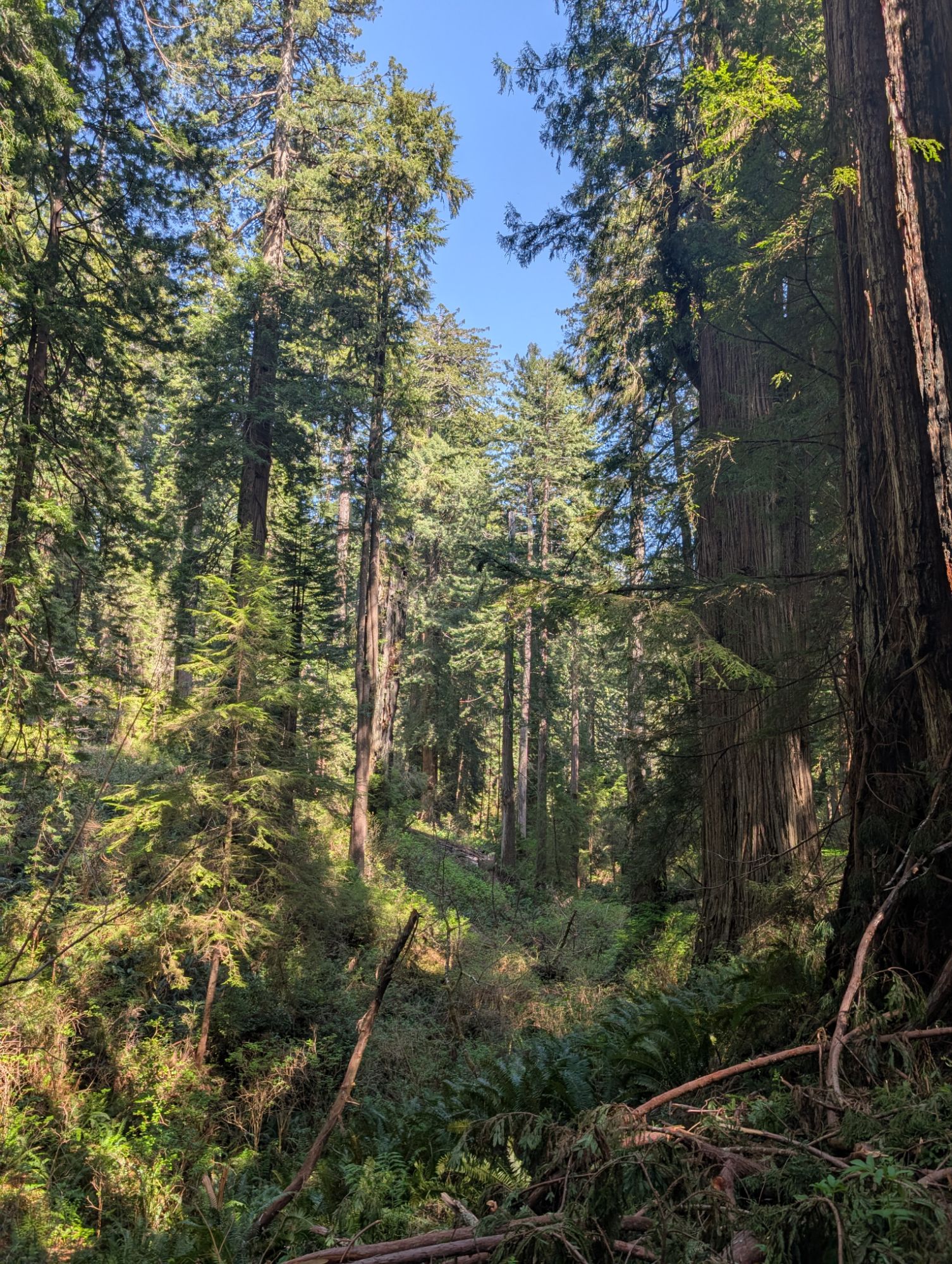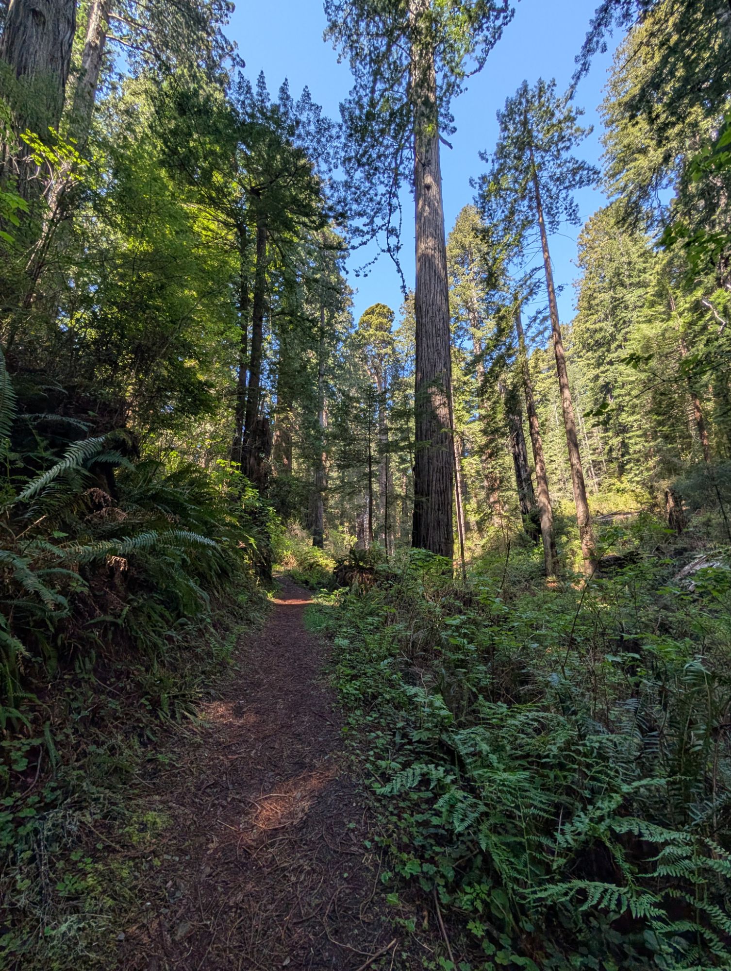 It’s noon as I start to hike through large old growth redwoods. The trail climbs gradually to a ridge before starting the 1.5 mile descent to the Pacific. The redwoods give way to sitka spruce and red alders.