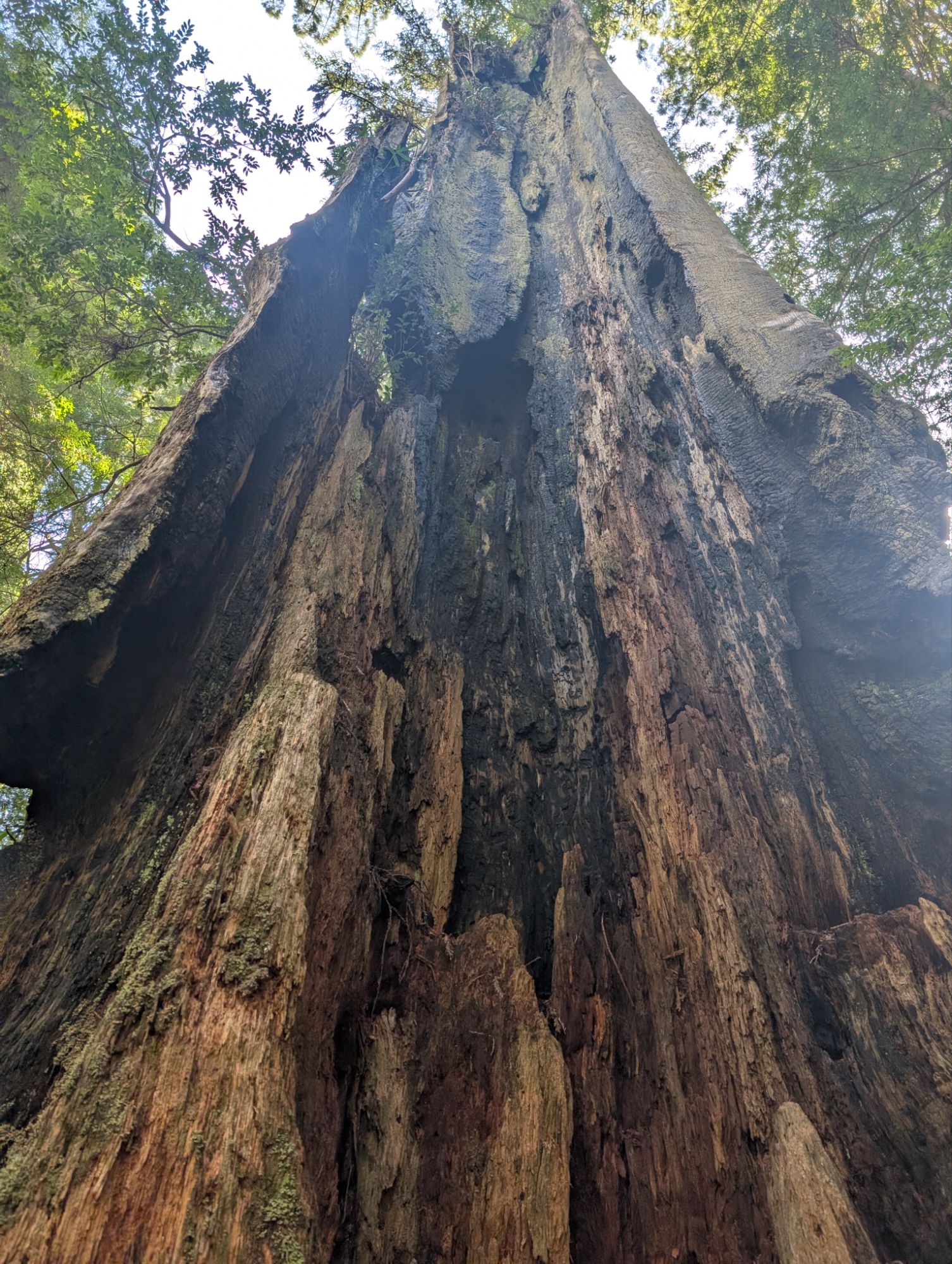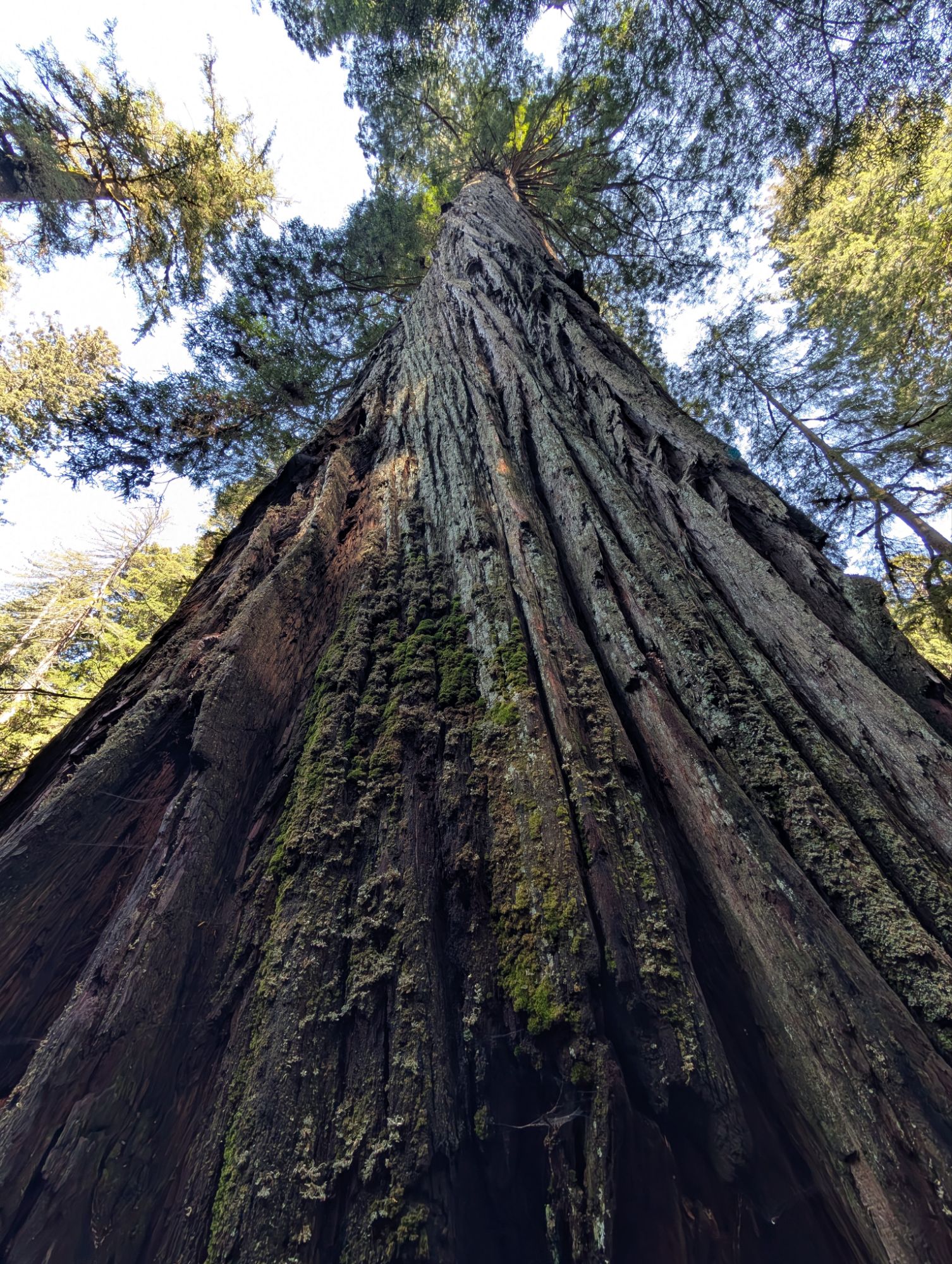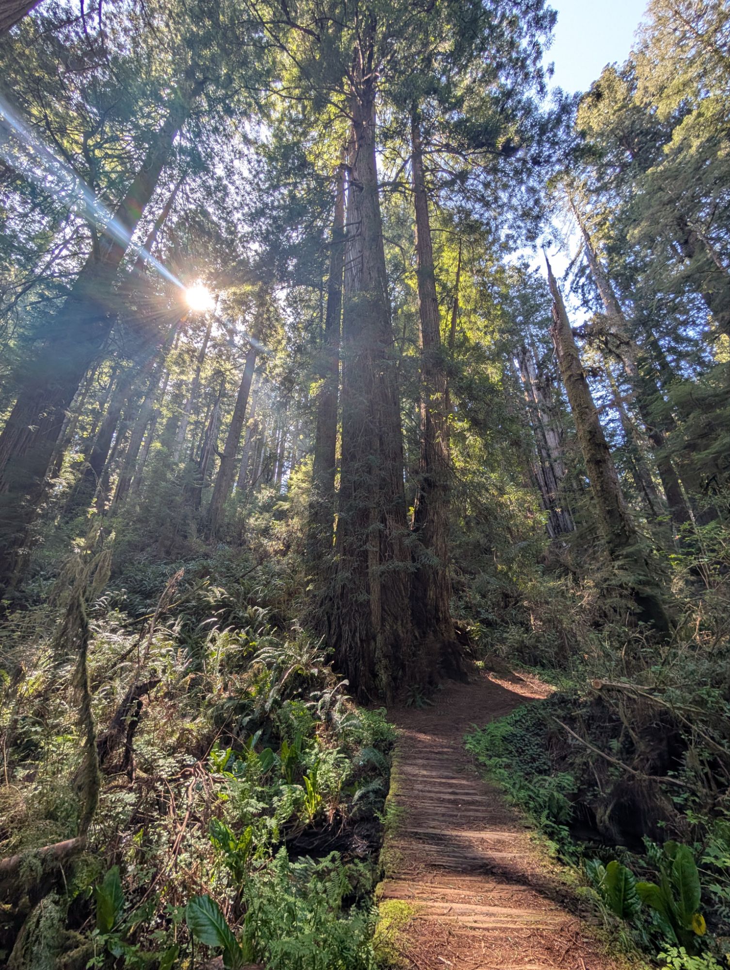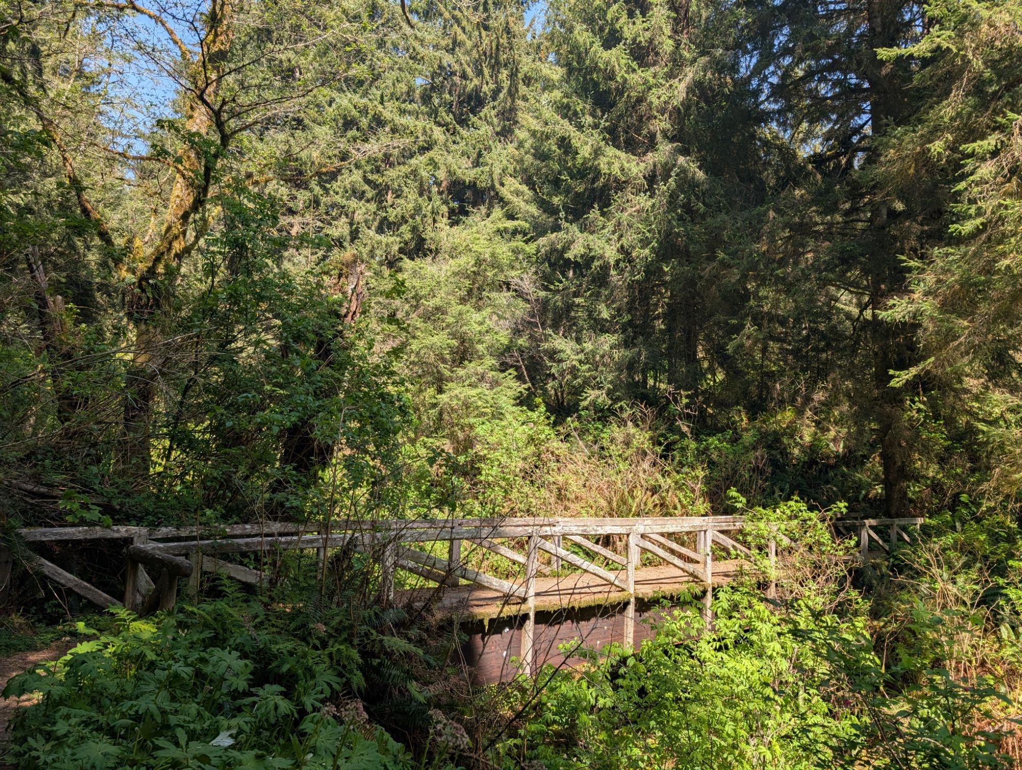 It’s noon as I start to hike through large old growth redwoods. The trail climbs gradually to a ridge before starting the 1.5 mile descent to the Pacific. The redwoods give way to sitka spruce and red alders.
