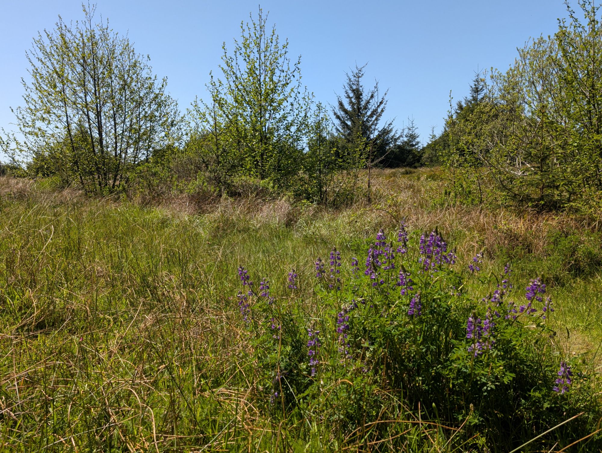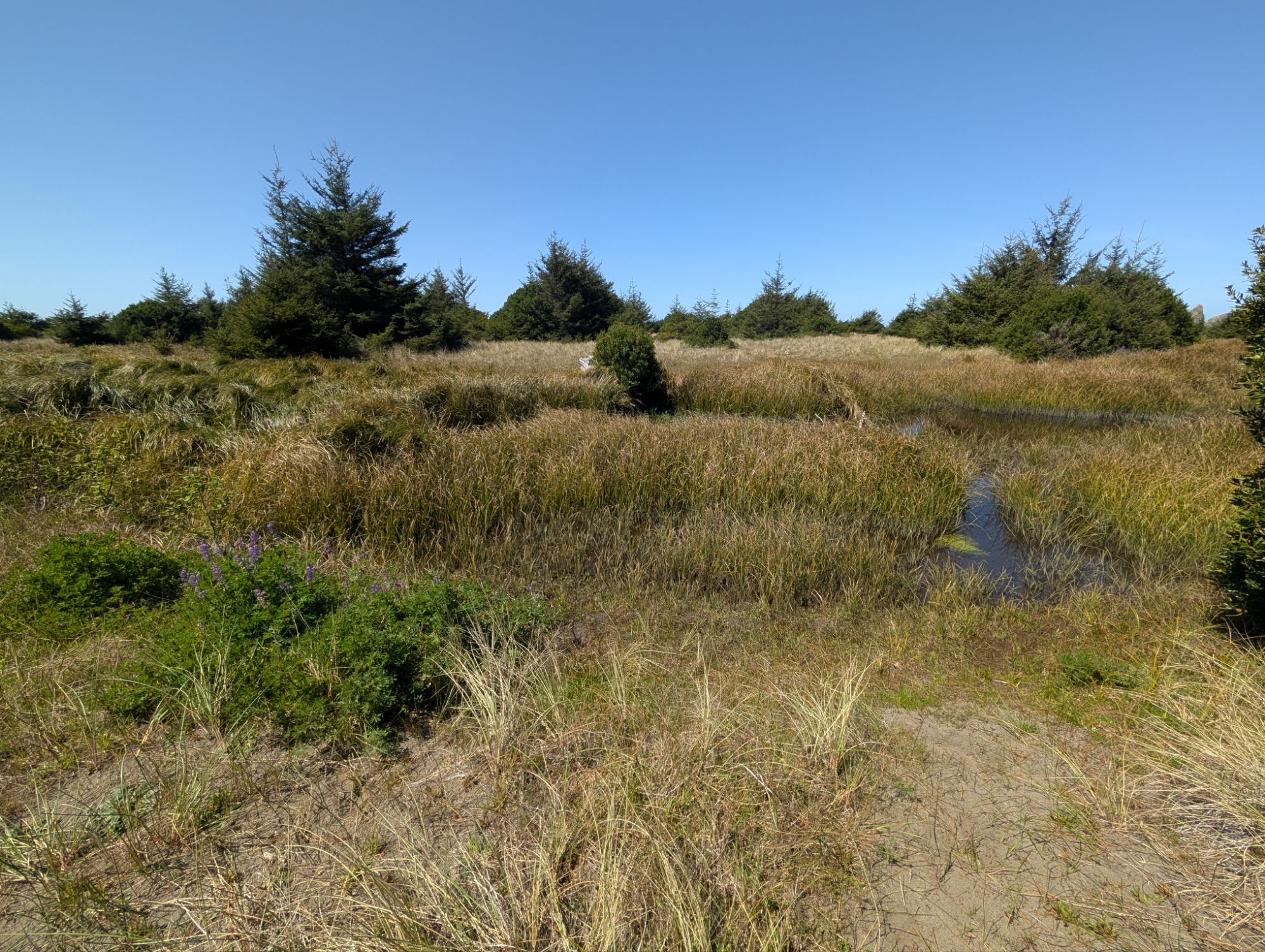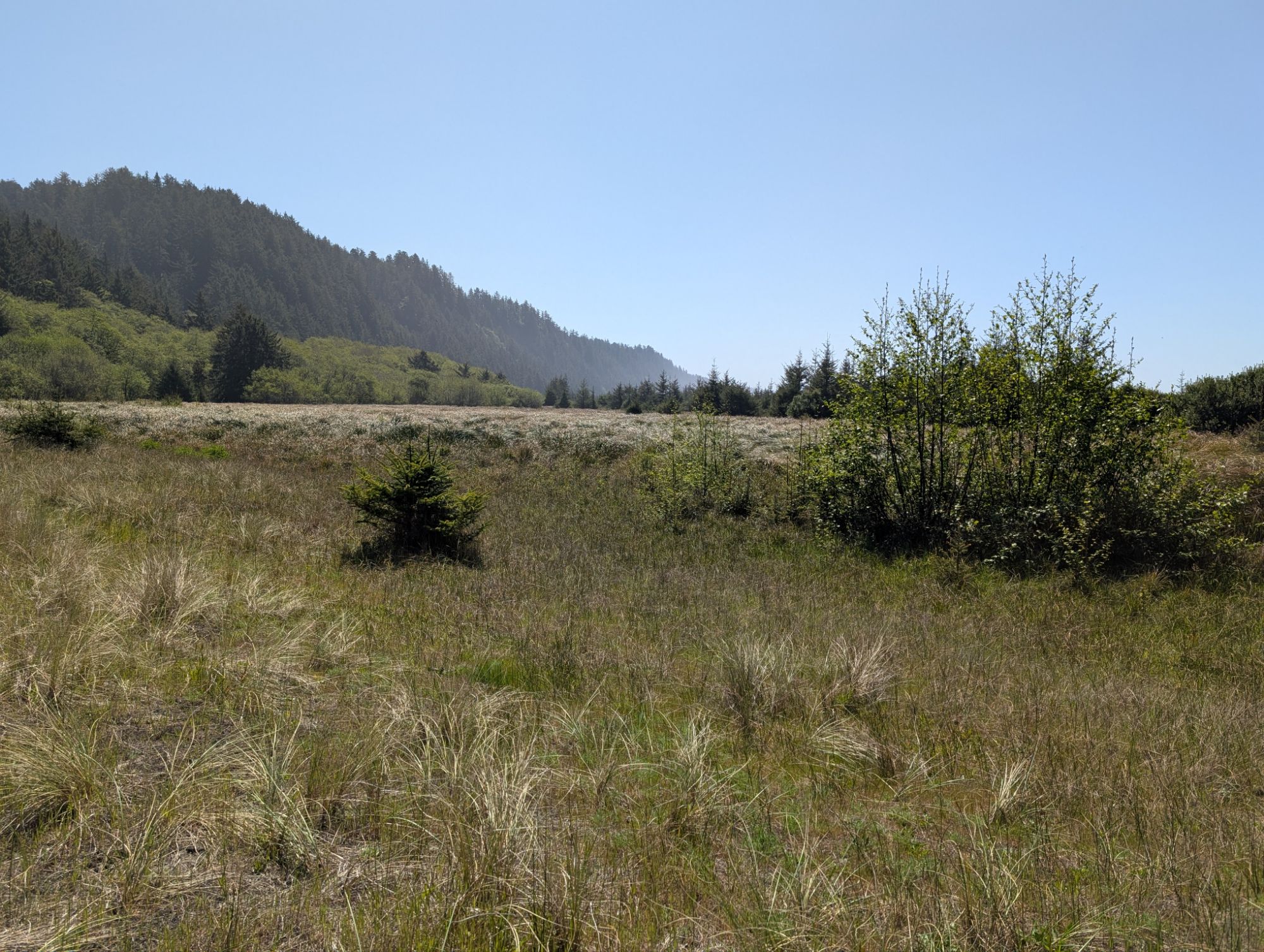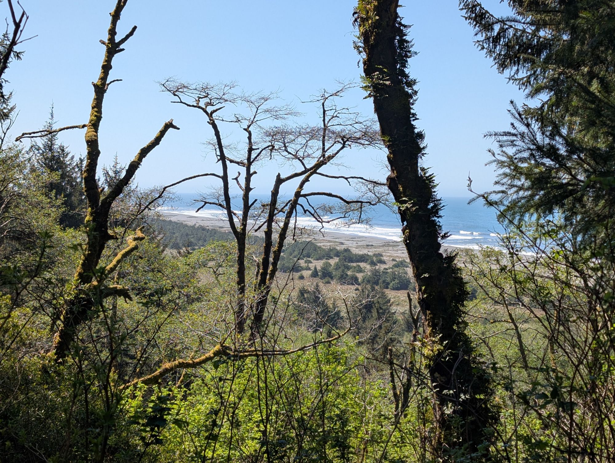 Near the bottom there’s actually a tsunami hazard sign, which is the first one I’ve ever seen on any trail that approaches the ocean. There are several large sitkas to climb through before emerging into the boggy bottoms. The audible Ossagon Creek flows down and to the South.