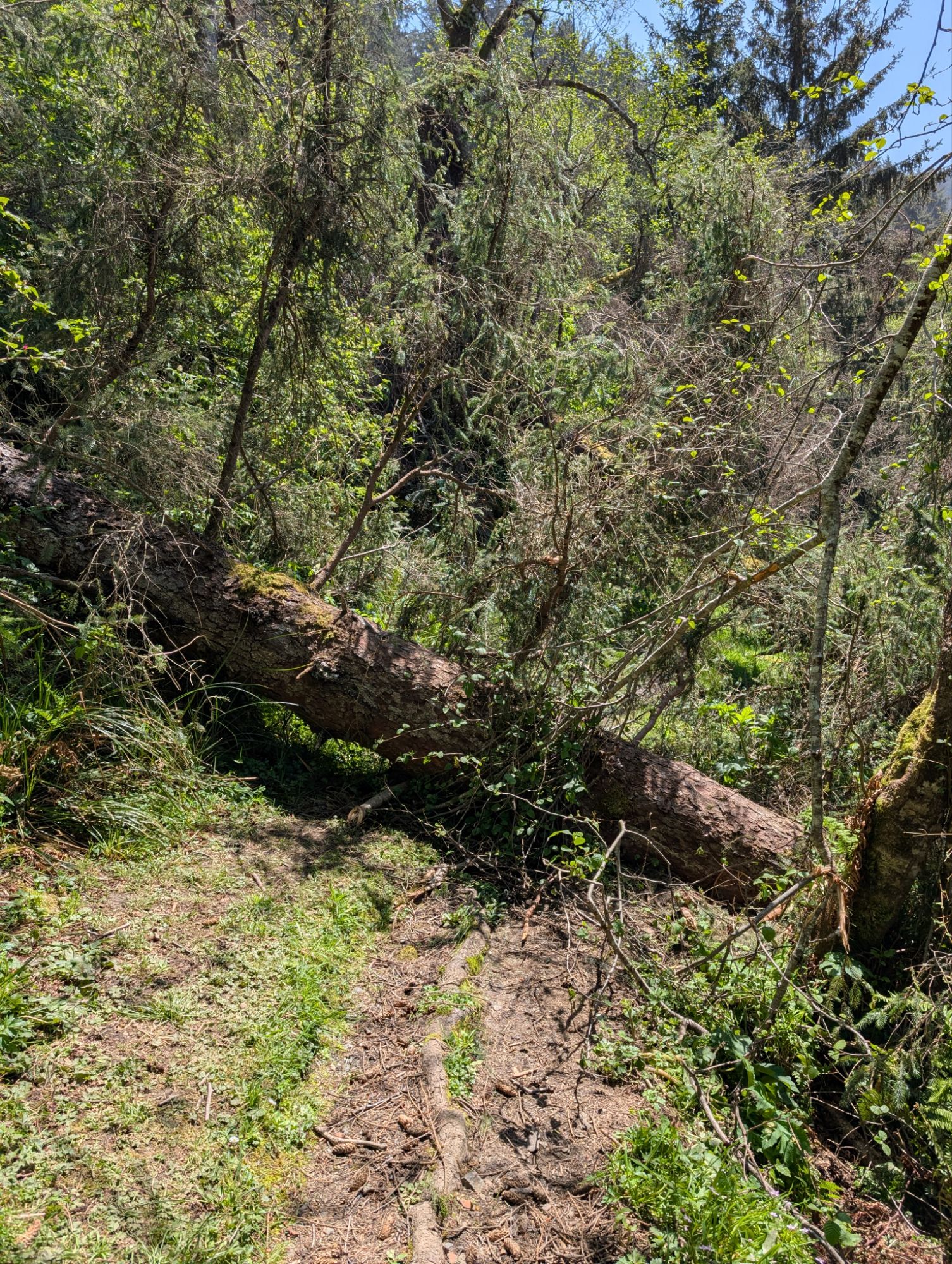 There’s a group of five hikers that pass me while I’m on my phone. I come up on the bog crossing and have to wait for them as they maneuver without poles. I try to go slow but then I have to wait for them all to get through the downed trees. I catch up with them again at a section of the trail that’s an absolute mud pit. One of them heads through while another signals for me to pass them. They’re standing on the best path but I jump into the mud and push through.