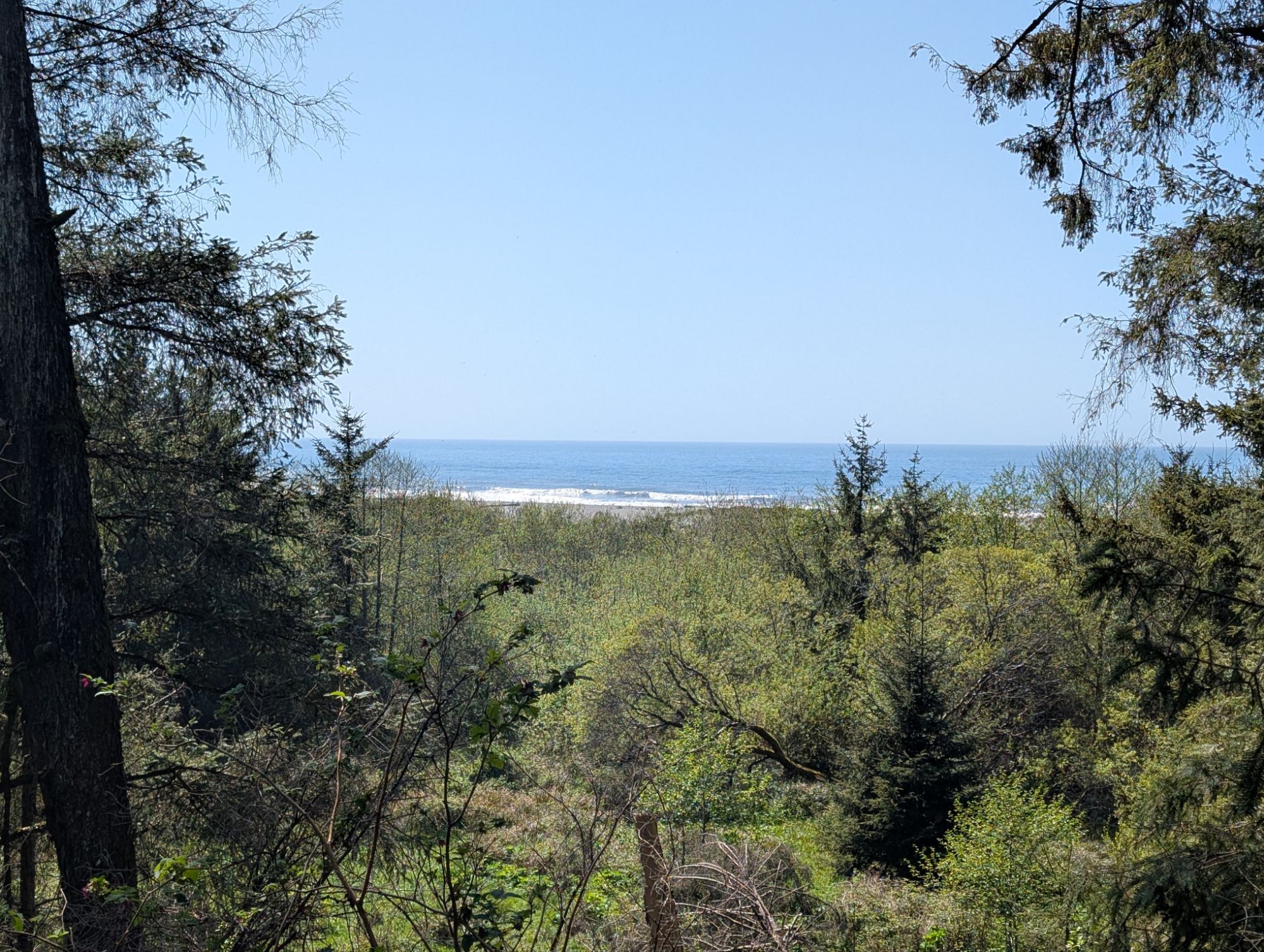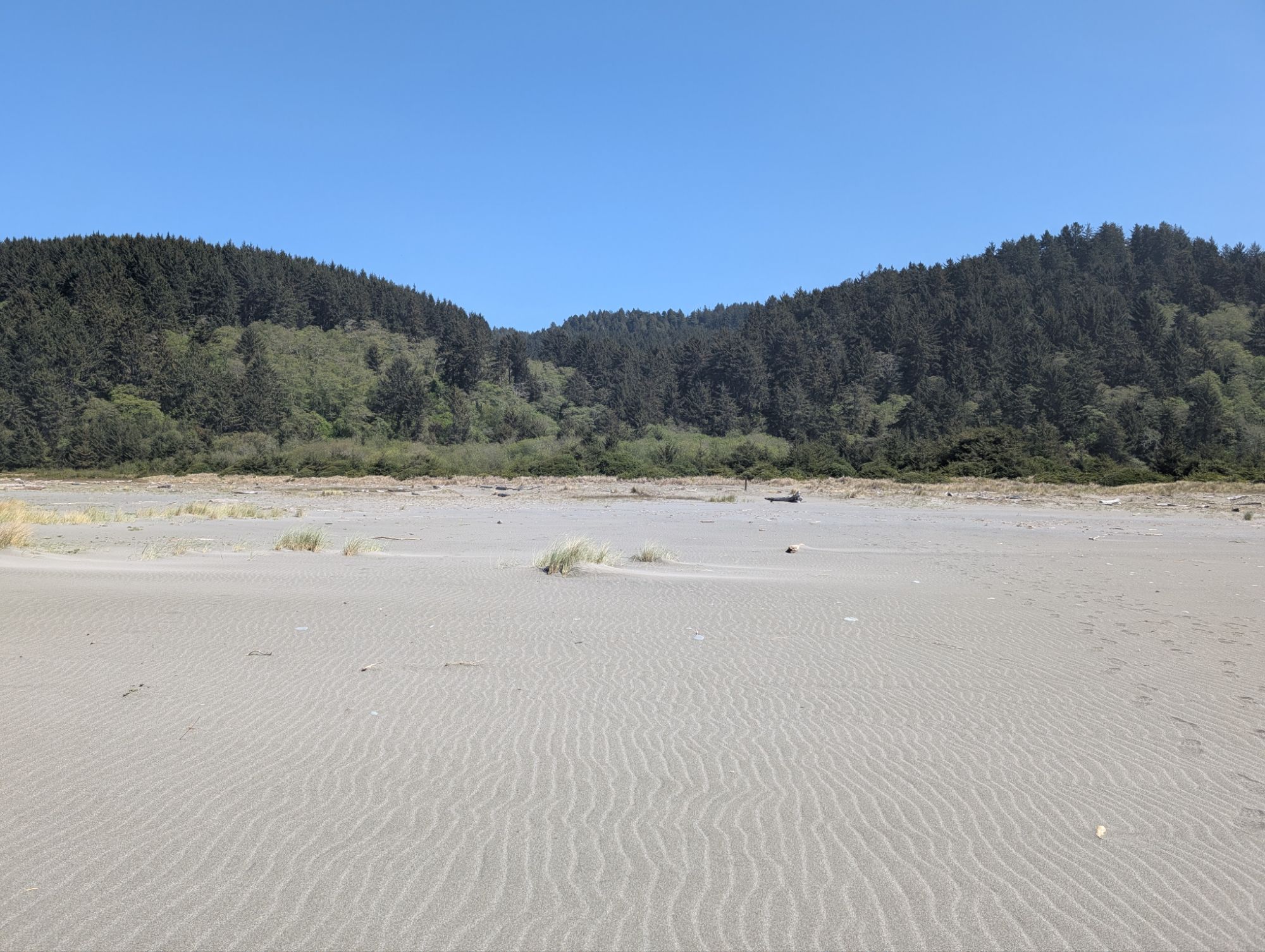 The trail peters out as I reach the edge of the bog. I see some elk butts off in the distance. I search around and then follow some elk tracks that head out to the ocean. I wonder why they come all the way out here. It’s about 1:45 pm and I find a sandy ledge to sit on for a short break. The beach seems to stretch on forever in either direction. I take off my hat and get some sun on my face. Well, if I can’t connect to the West Ridge Trail this is going to be a much shorter hike. I could hike to the South or I could hike to the North but maybe that’s a plan for another day. I turn off airplane mode and find that there’s cell service out here at the ocean’s edge.