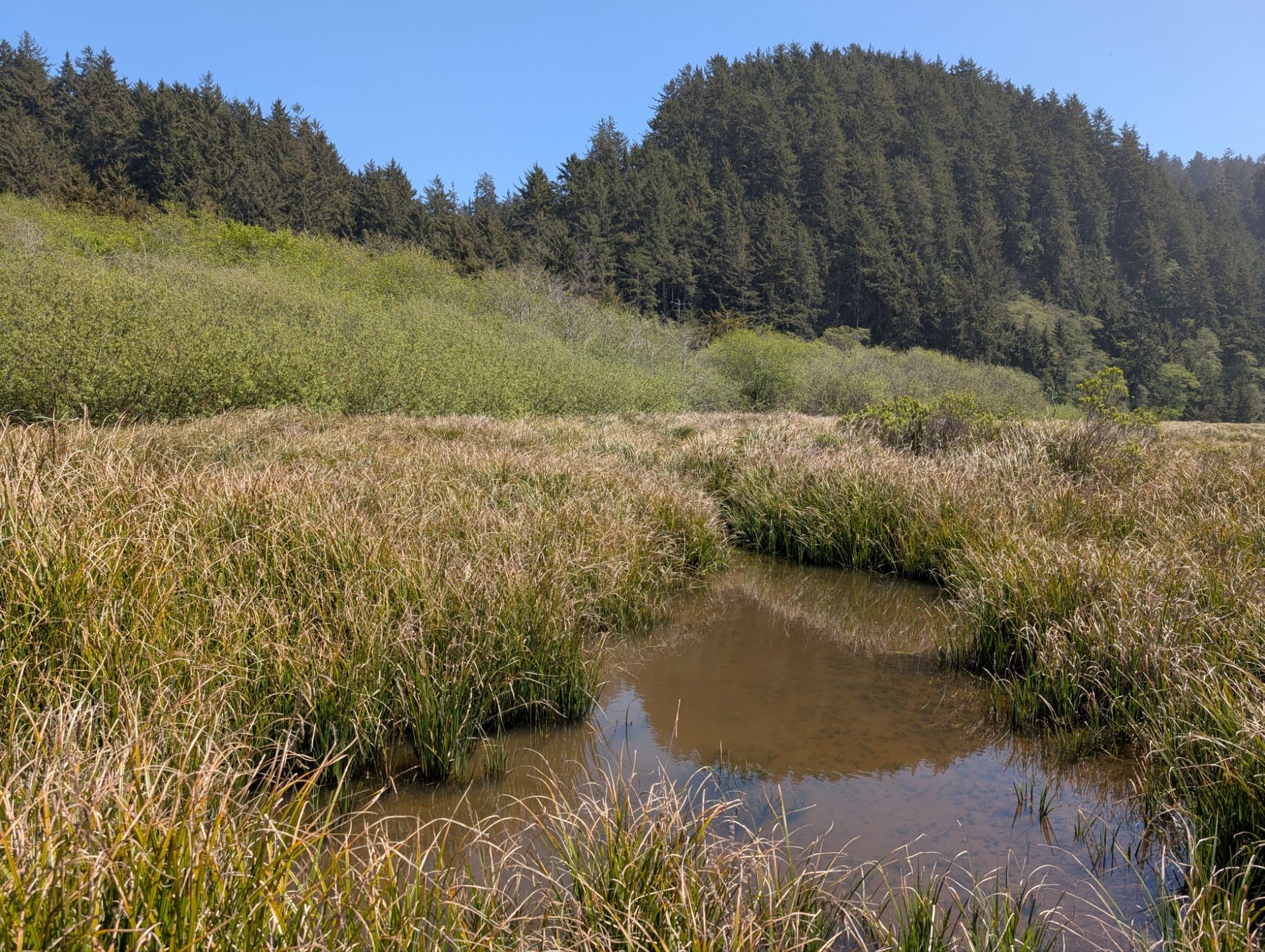 I shoulder my pack once again and head back to the bog. I try all possible options but there is no getting across to the Butler Creek drainage where I need to connect to the West Ridge Trail. Am I missing some magical bridge? Oh California Coastal Trail where are you? I learned my lesson about bogs in January and wouldn’t want to end up deep in a watery hole. So close, and yet so far.
