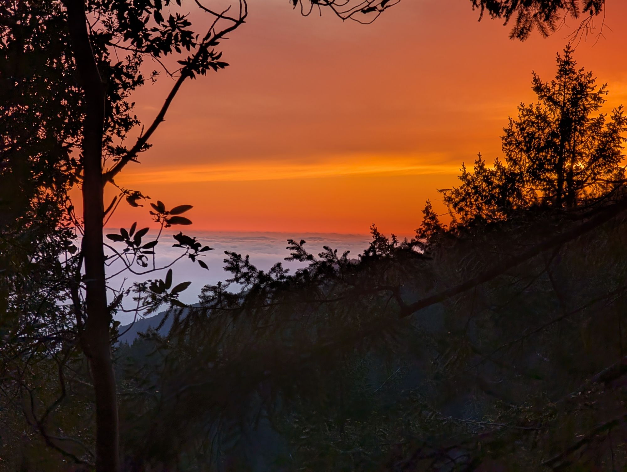 About 15 minutes later, I can tell that the sky is going sunset orange but my view is mostly blocked by trees. I happen upon a little window where I can see the golden heavens brightening the tops of the fog layer.