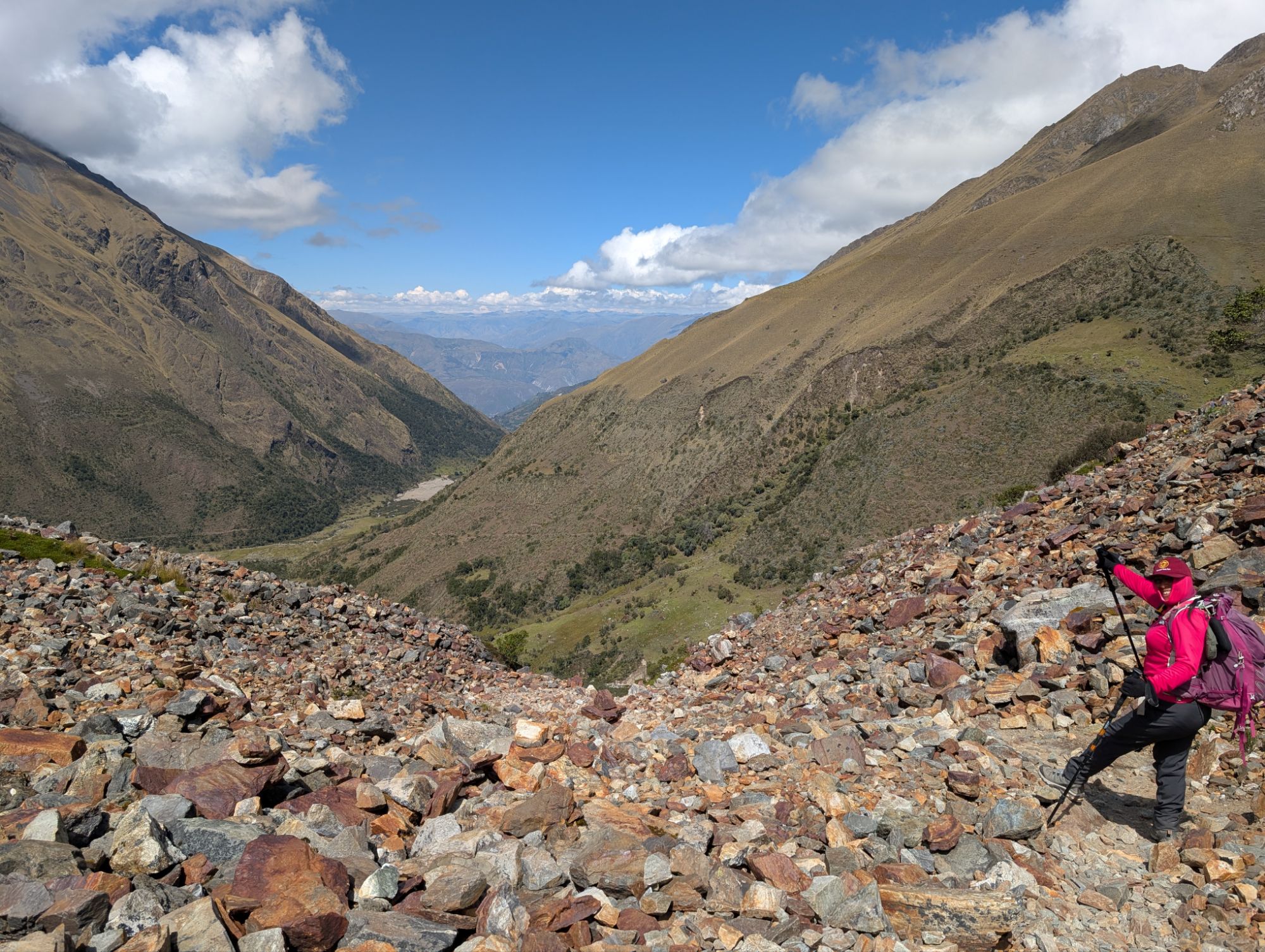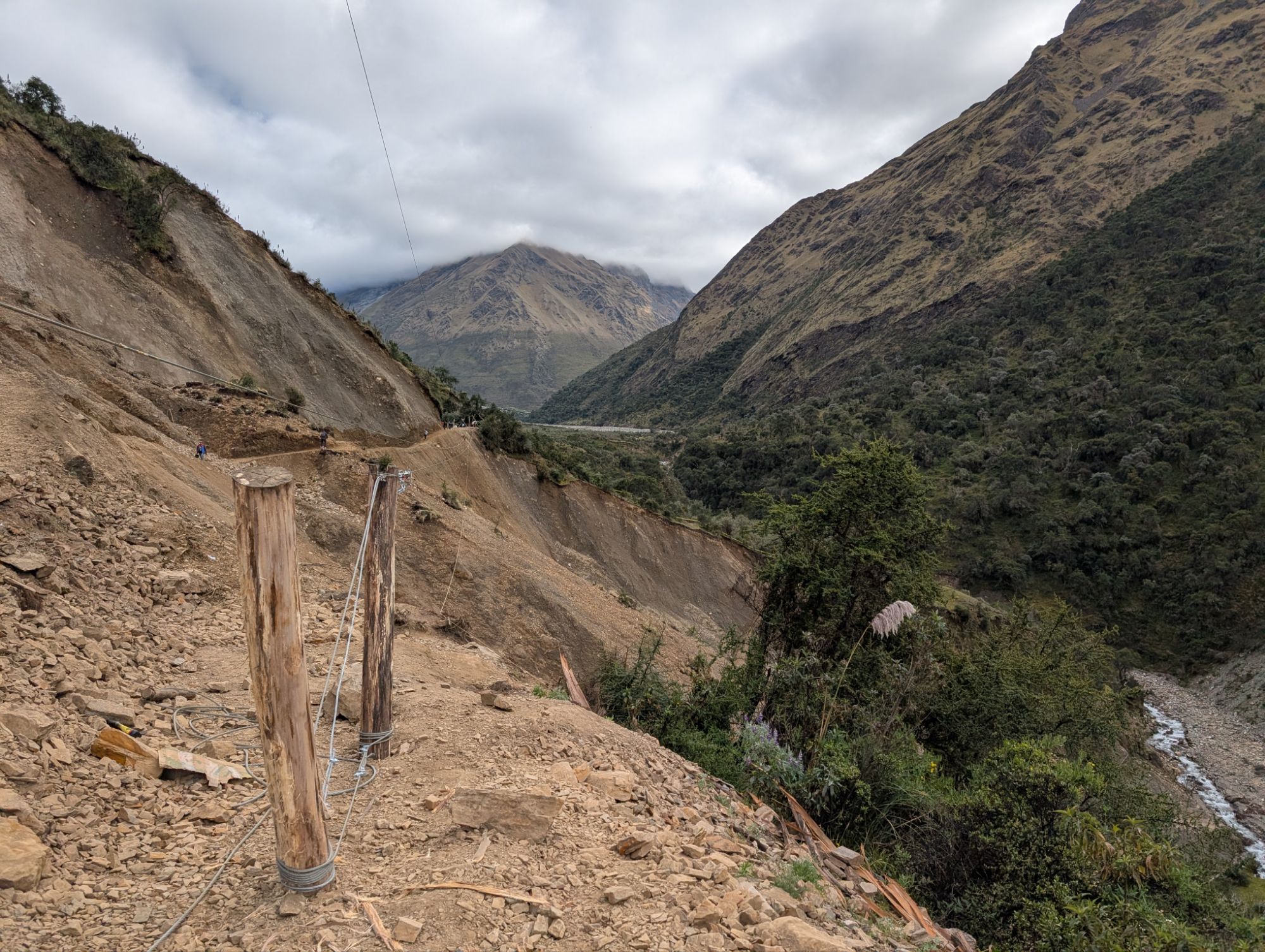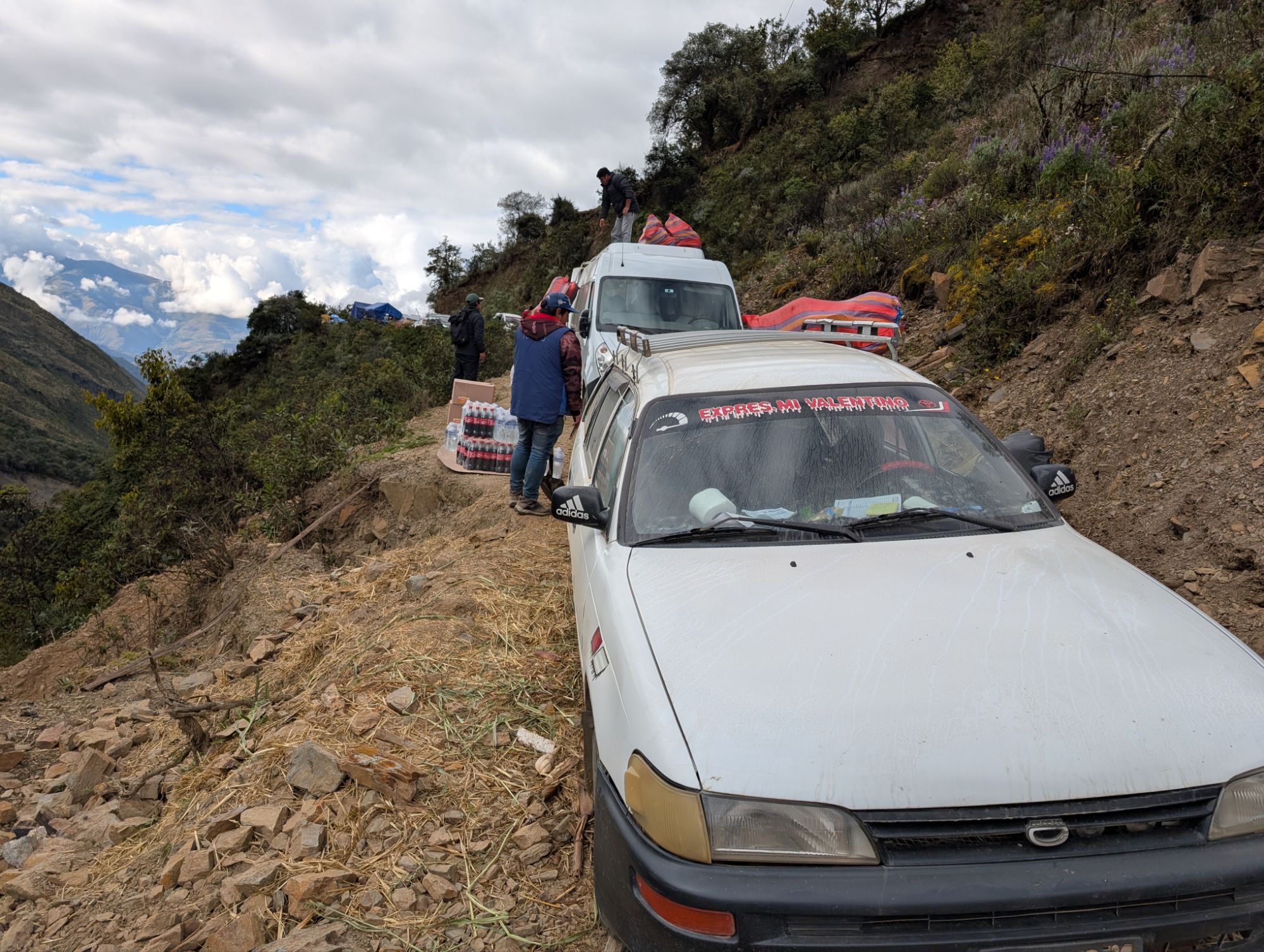 We drive until we reach a sea of white vans at the end of the road. We start piling gear out onto the ground. I give the driver a tip and a few items from by bag lunch that I can’t eat. Turns out that it’s the end because the road washed out a few months ago. There’s a thin level trail for people and the animal trail dips down into the canyon. Elizabeth and crew call out and search for Oscar, our horseman. ¿Dónde está Óscar? Vans are unloading gear as fast as they can to make room for the next. There’s tons of people and commotion, mostly tourists here for a day hike to Humantay Lake. As we gather ourselves, the groups of tourists stream by us. At just over 12,000 ft., some people are visibly having a tough time. I already met the cook Joel yesterday and I meet our new porter Juvenal as we stand waiting. We all grab as much of our gear as we can and shuttle it across the washout. With a fuel can wedged between his head and shoulder, Juvenal makes two trips.