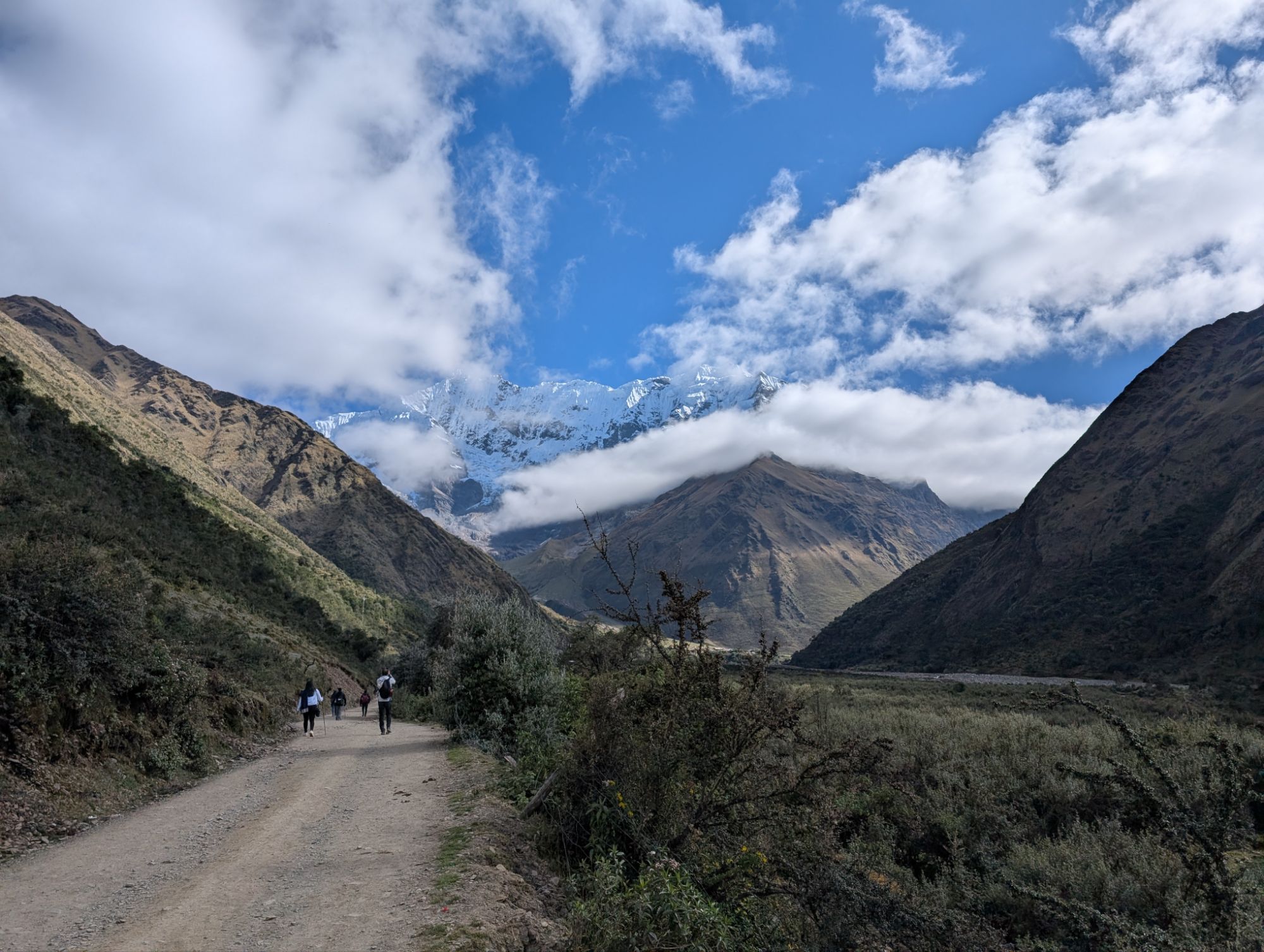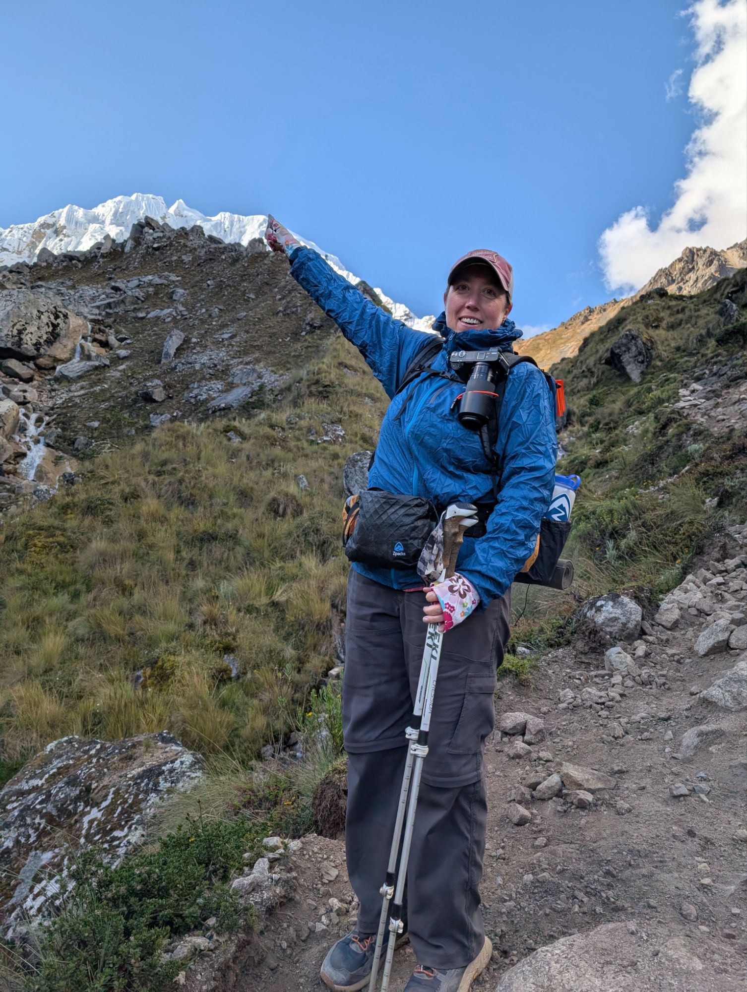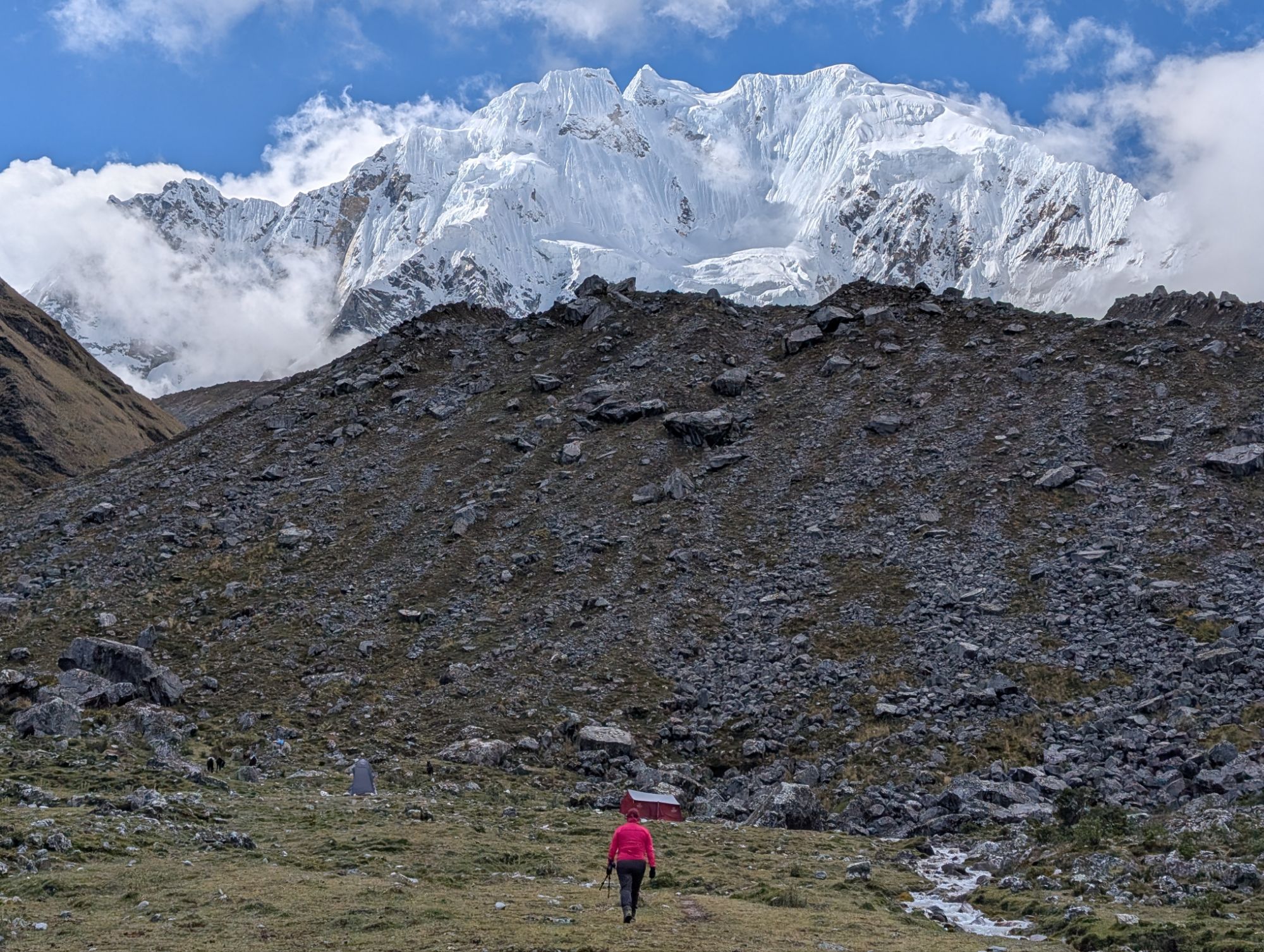 Progress feels desperately slow as the elevation weighs on me and we take lots of photo ops with Apu Salkantay. Clouds pass by briefly as we climb up along the right side of a lateral moraine. Only a half hour later, the whole team zips by making quick tracks.