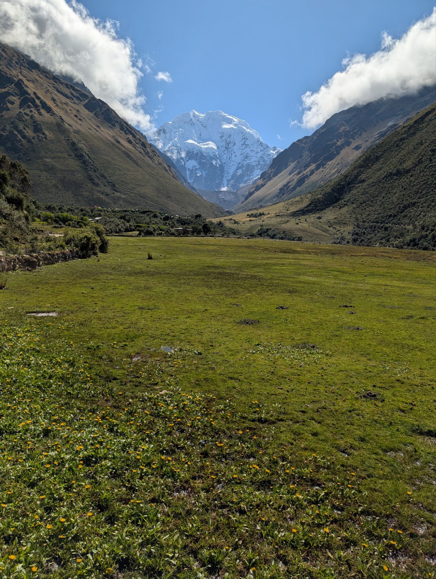 We point ourselves directly at Apu Salkantay and start climbing. I move upward very slowly, although steadily, while admiring flowers and views in all directions. We pass a grazing group of horses and llamas. We ascend for about 1.5 hours before arriving at out lunch spot at 2:15 pm.