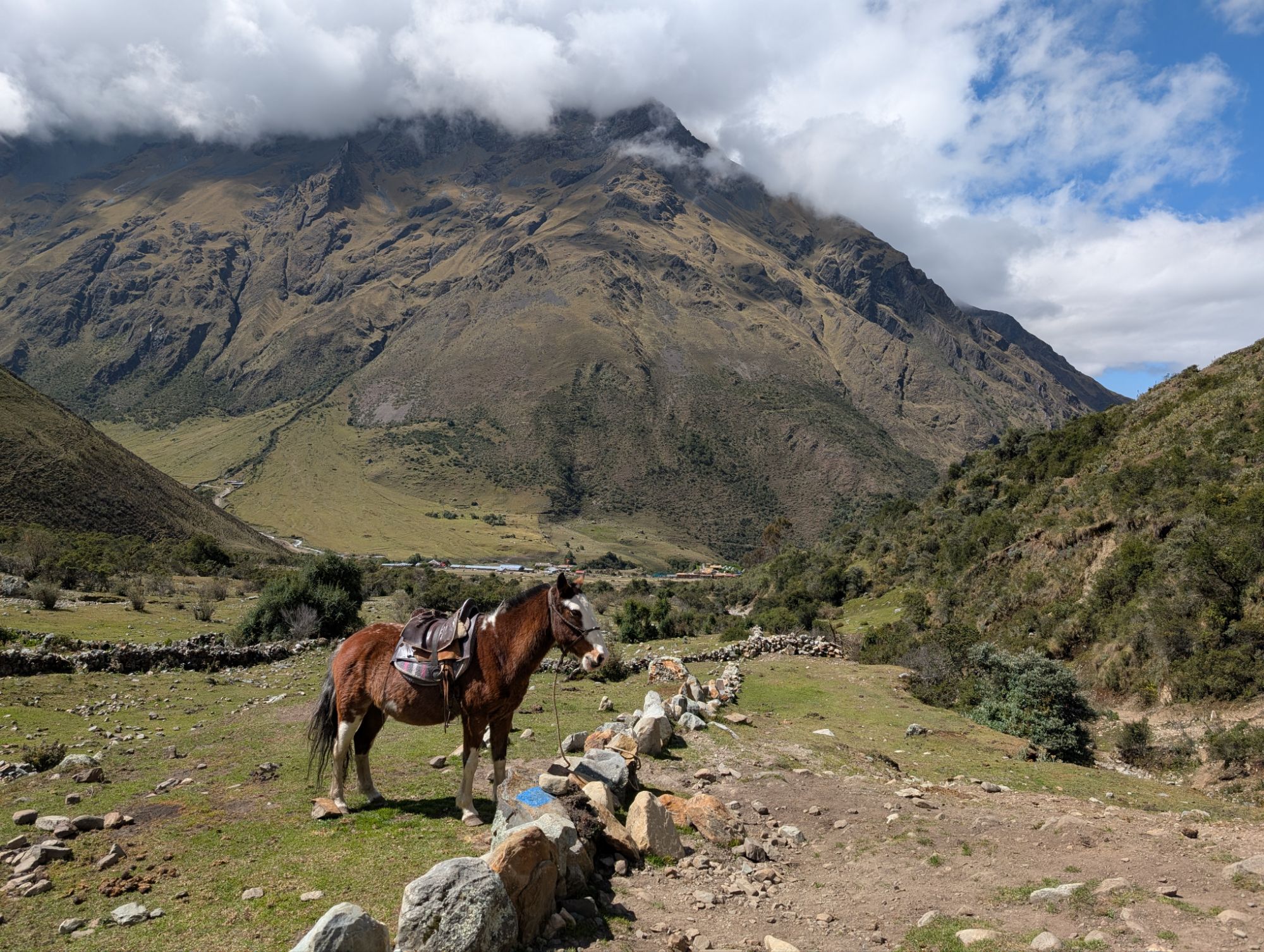 We hike at least a half mile before veering off the main road into a yard/open pasture area. The Mountain Gods Peru team launches into full action to prepare breakfast. They set up a table and chairs and prepare oatmeal, coffee, scrambled eggs, toasted bread with all the fixings, tomatoes (for Elizabeth). Oscar and his horses arrive and he starts preparing them to carry all the gear. As I make my final preparations for hiking, I find the baño where I pay 2 soles or .56 cents USD.