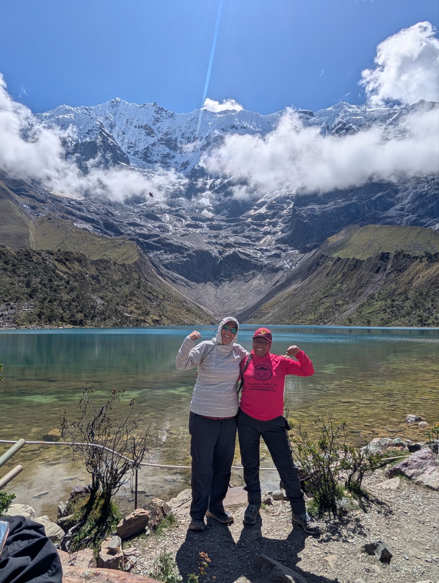 The edges of Laguna de Humantay, sitting at an elevation of 13,780 ft., are crowded with dudes posing with their shirts off. LOL, nothing like a shirt off to frame your accomplishment. We do the requisite photos and fend off the tourists glancing by. Elizabeth does not hesitate to command people out of the picture and to take our picture too!