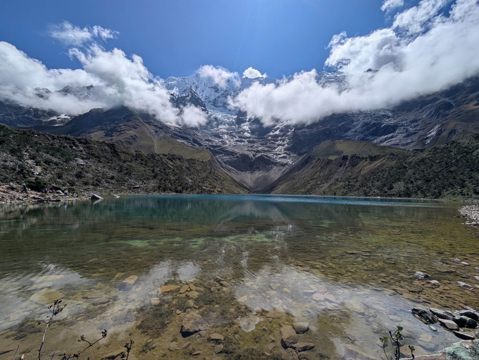 The clouds hang high around Montana Humantay as the sun continues to bear down. We climb up to a rocky ledge and the vivid glacial lake color pops.