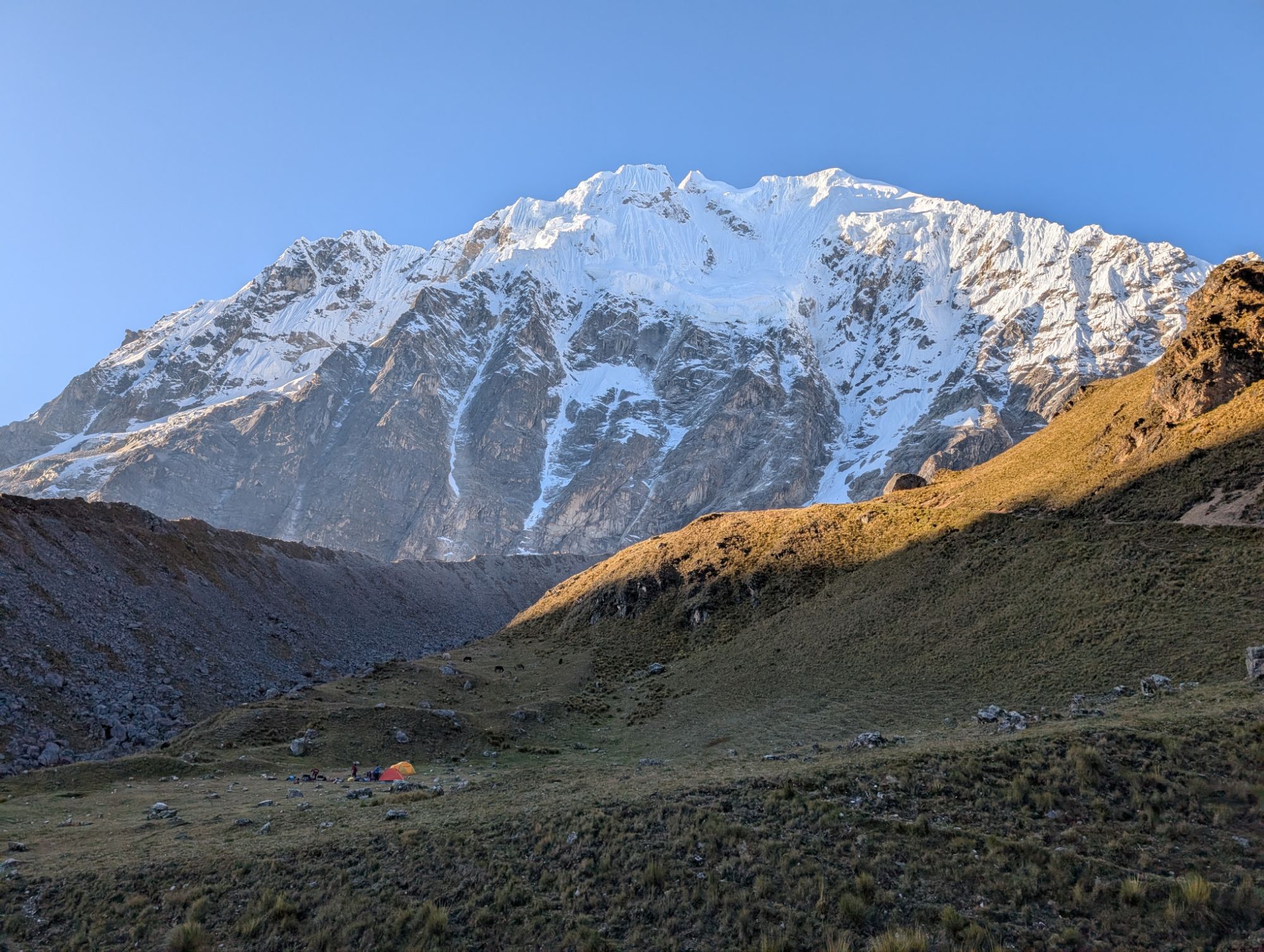 Oscar approaches us at about 2 pm and offers me a ride or to take my gear. Not only do I not need the assistance but getting on a horse seems like a good way to hurt myself. Instead of me, Oscar’s girlfriend rides the horse back to camp. It’s just another 15 minutes before we arrive at the terminus of one of Salkantay’s moraines for lunch.