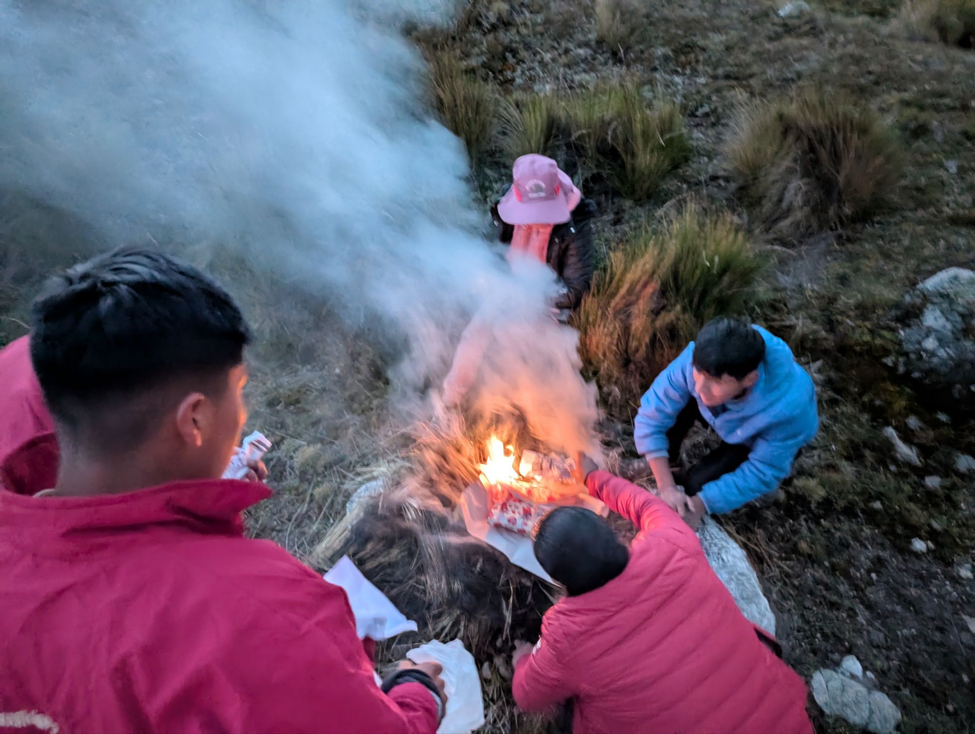 Elizabeth carefully moves the offering over to the fire and places it in the center. Burning grass is placed on top and along the sides of the offering. The left over paper from the packets is also added. It glows brightly and I can feel the heat as Elizabeth speaks in Quechua. All our prayers and offerings and blessings and intentions are carried and communicated to Earth Mother Pachamama. May we all have a safe and blessed trek and honor our connection to all things.
