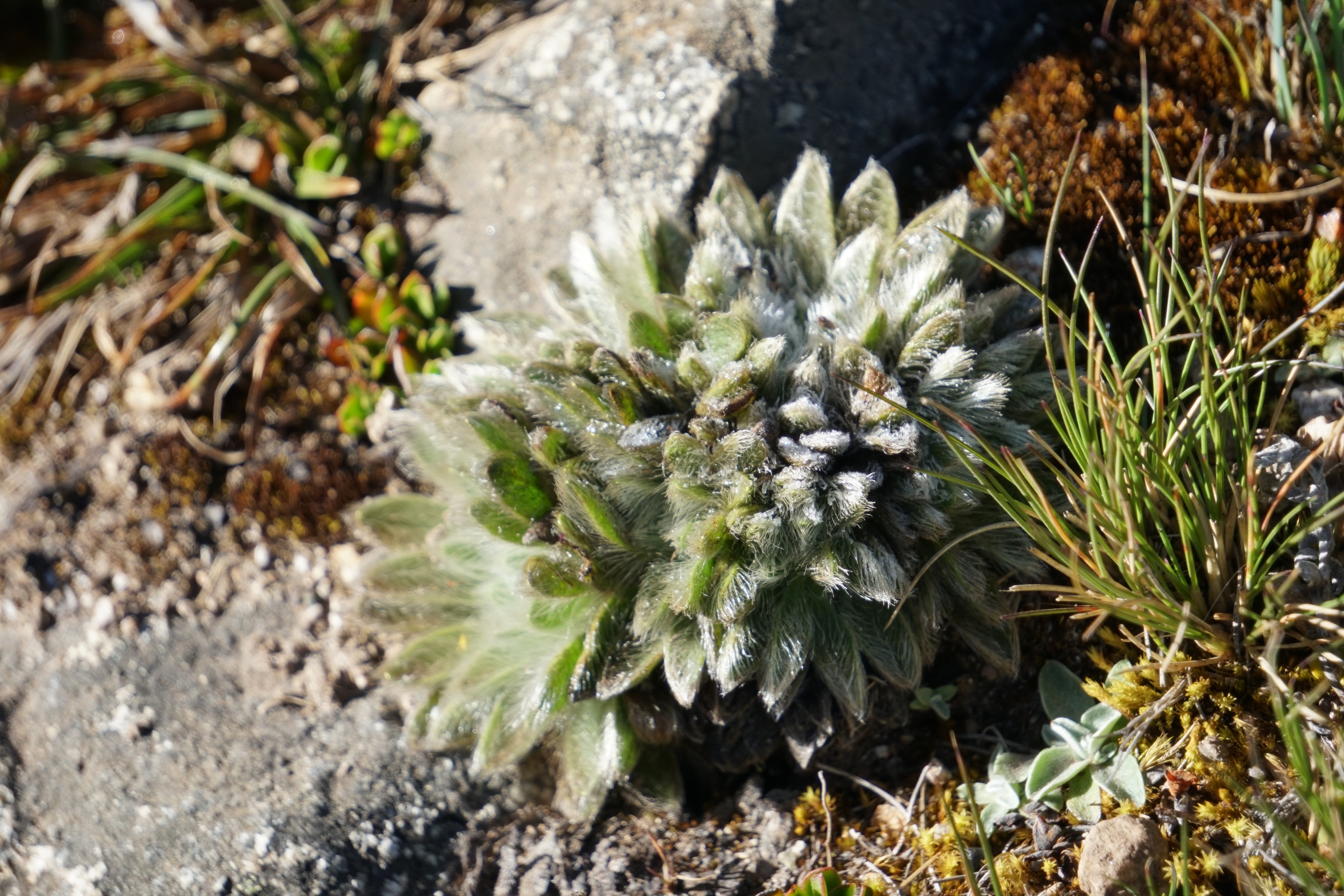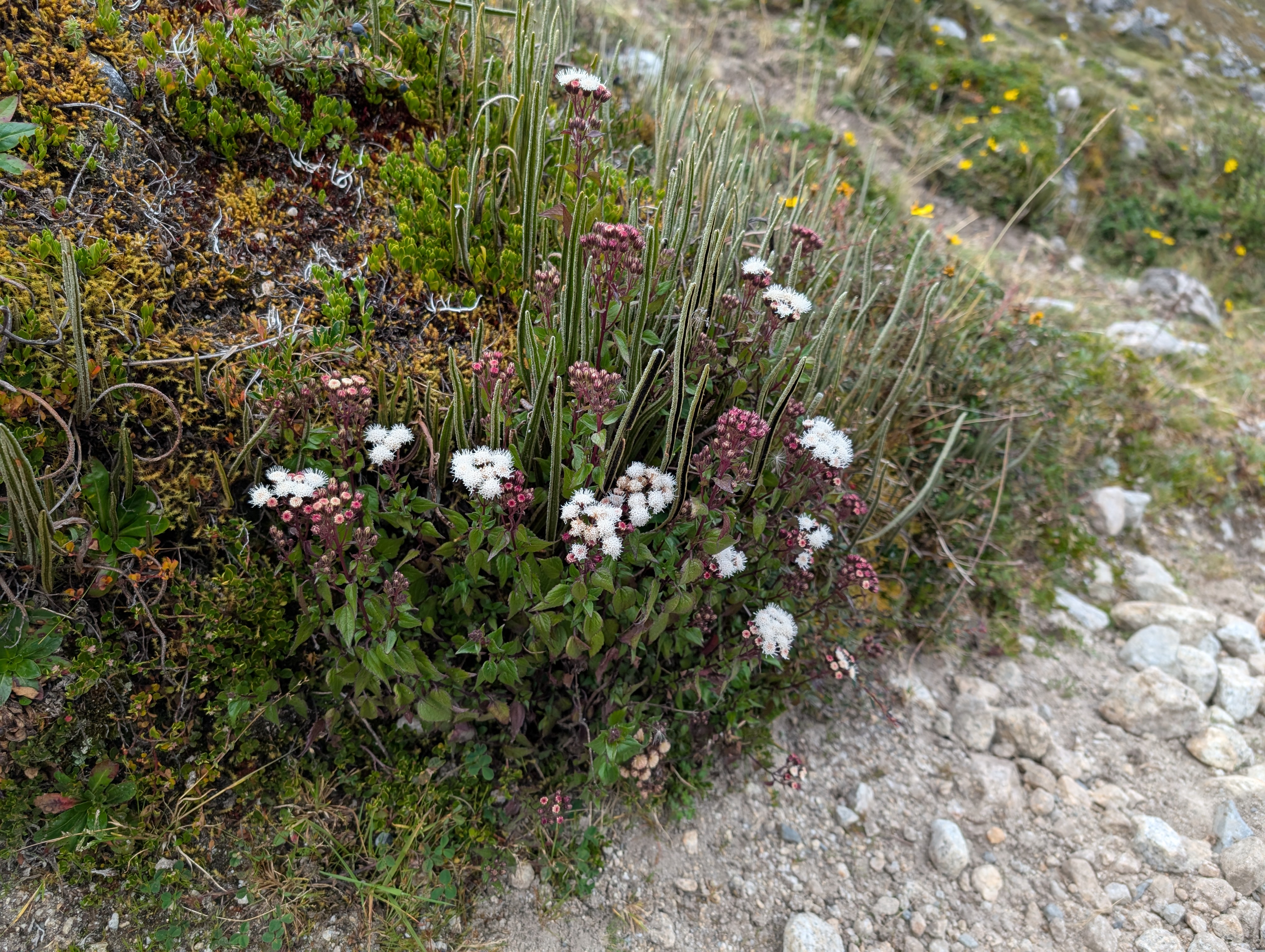 There’s a couple horses near Incachiriaska Pass that aren’t part of our team and their owner is nowhere in sight. The sun turns their manes into lines of liquid gold. Just below the last switchback is this high-altitude plant which ironically is known by two different genus names Senecio and Culcitium. It has these wonderful furry and spongy leaves that I just want to reach out and pet. Unfortunately, the flower stalks are not yet open.