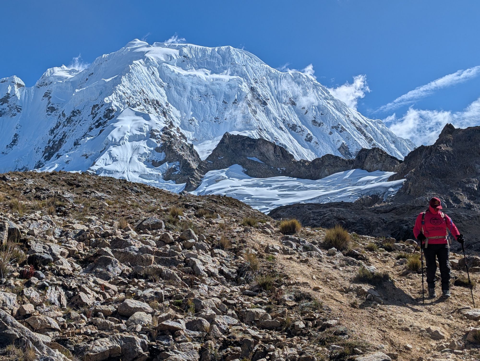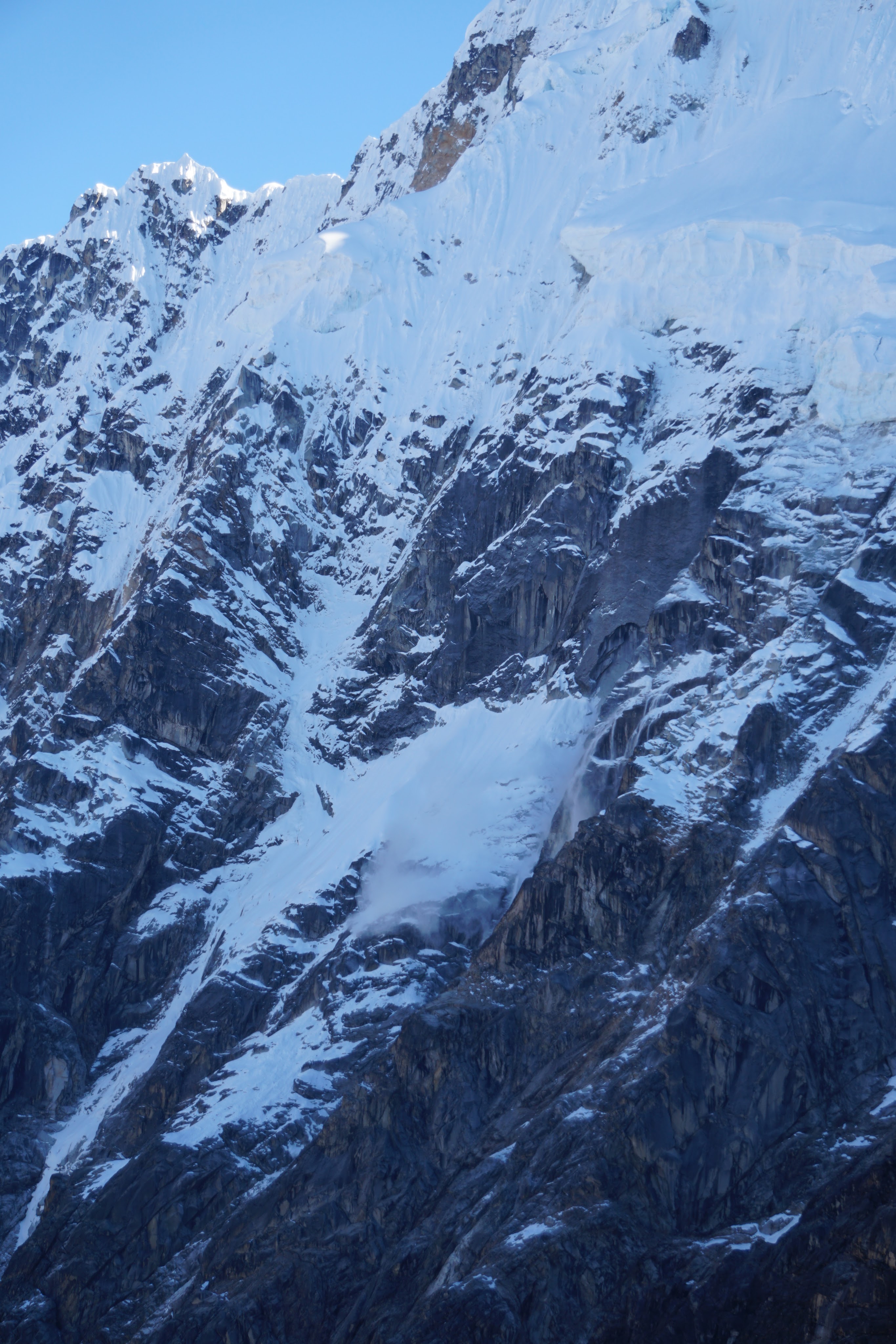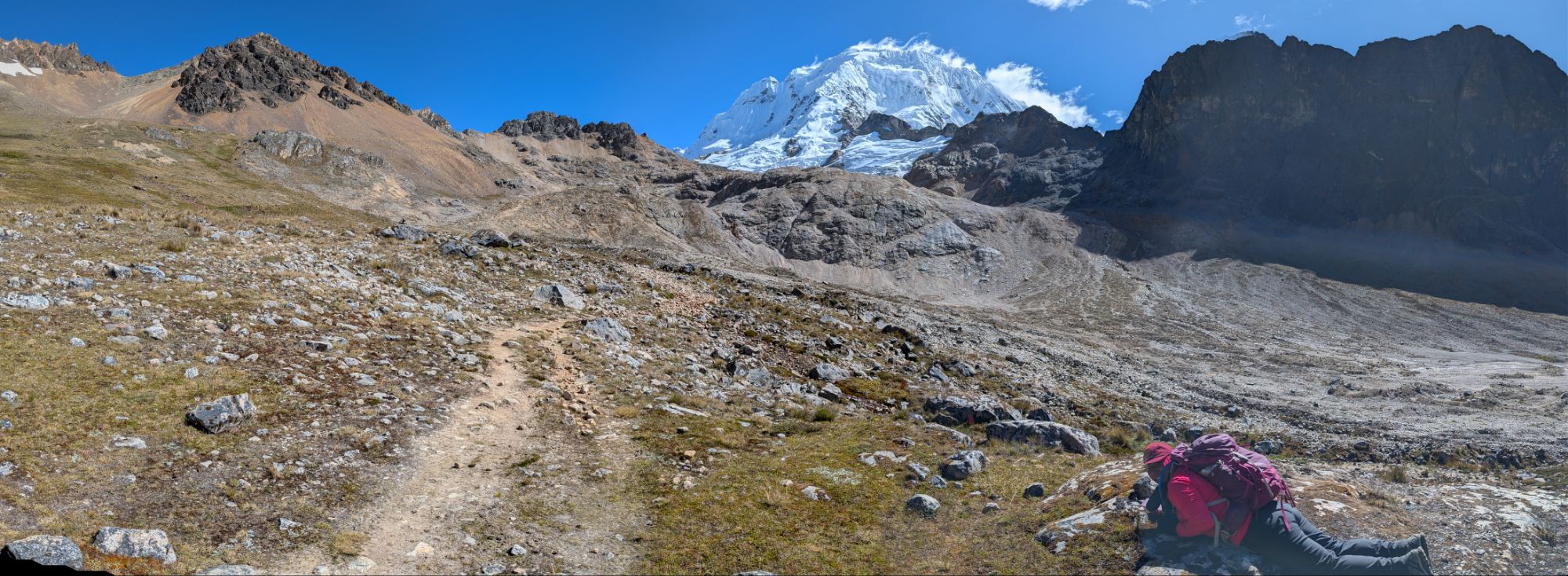 My upward progress is slow but steady. About 8:30 am, I look back and can see the little dots of our team ascending behind us. Now note my position compared to the lateral moraines and Humantay. The sun slowly reaches over the 20,574 foot crest of Apu Salkantay and makes her turquoise glacial-meltwater lakes really pop. I stand admiring the scenery while also catching my breath. I hear a loud noise and see an small ice cloud billow up as ice slides down the face of Salkantay.
