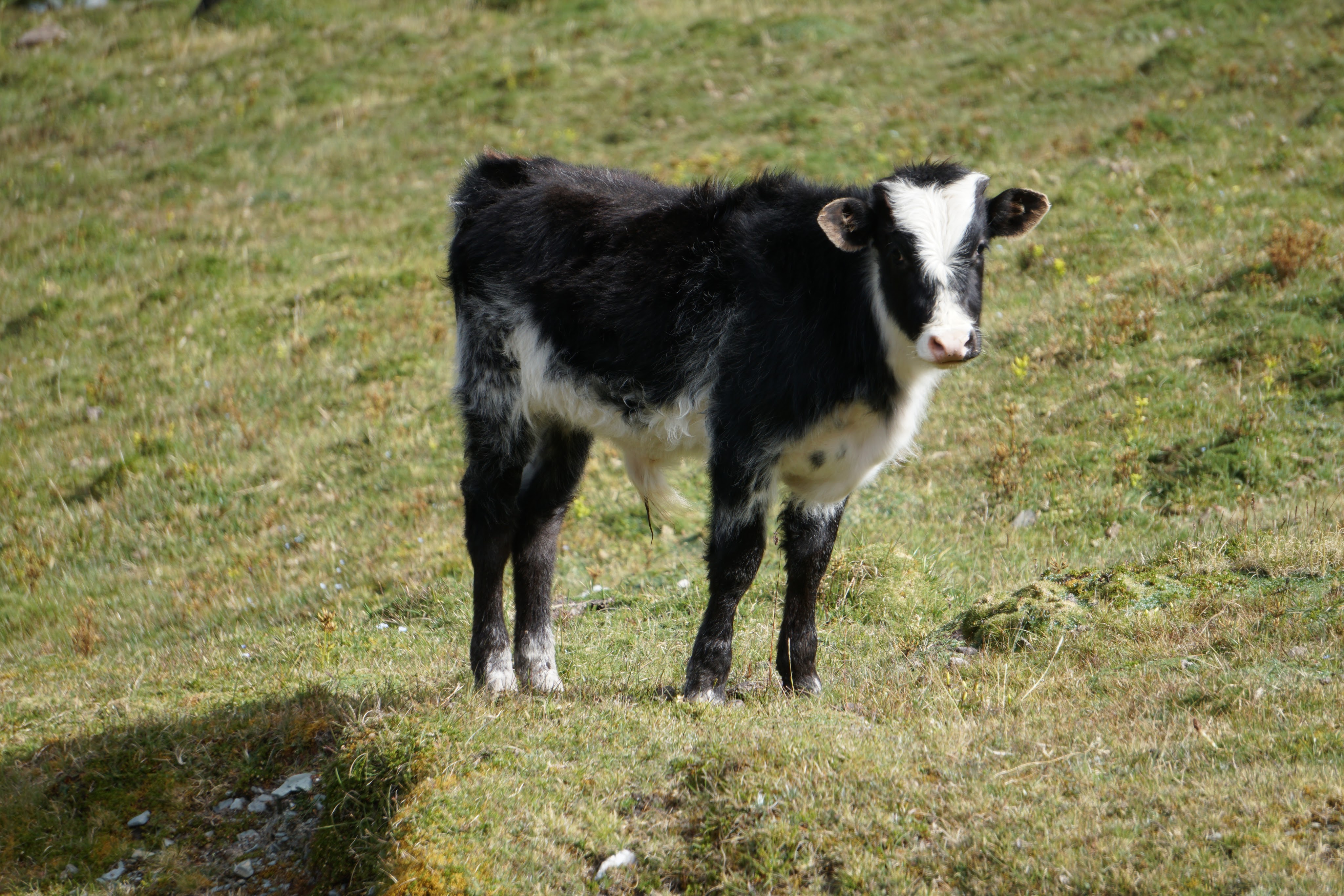 The trail traces past erratics, an animal enclosure made out of rocks and a lovely outcrop of white Ageratina or Eupatorium?, Baccharis, peat moss, and Elaphoglossum ferns. We pass through a group of scattered cows who cautiously note our passage. A black and white calf almost seems like it wants to come over and say hi.