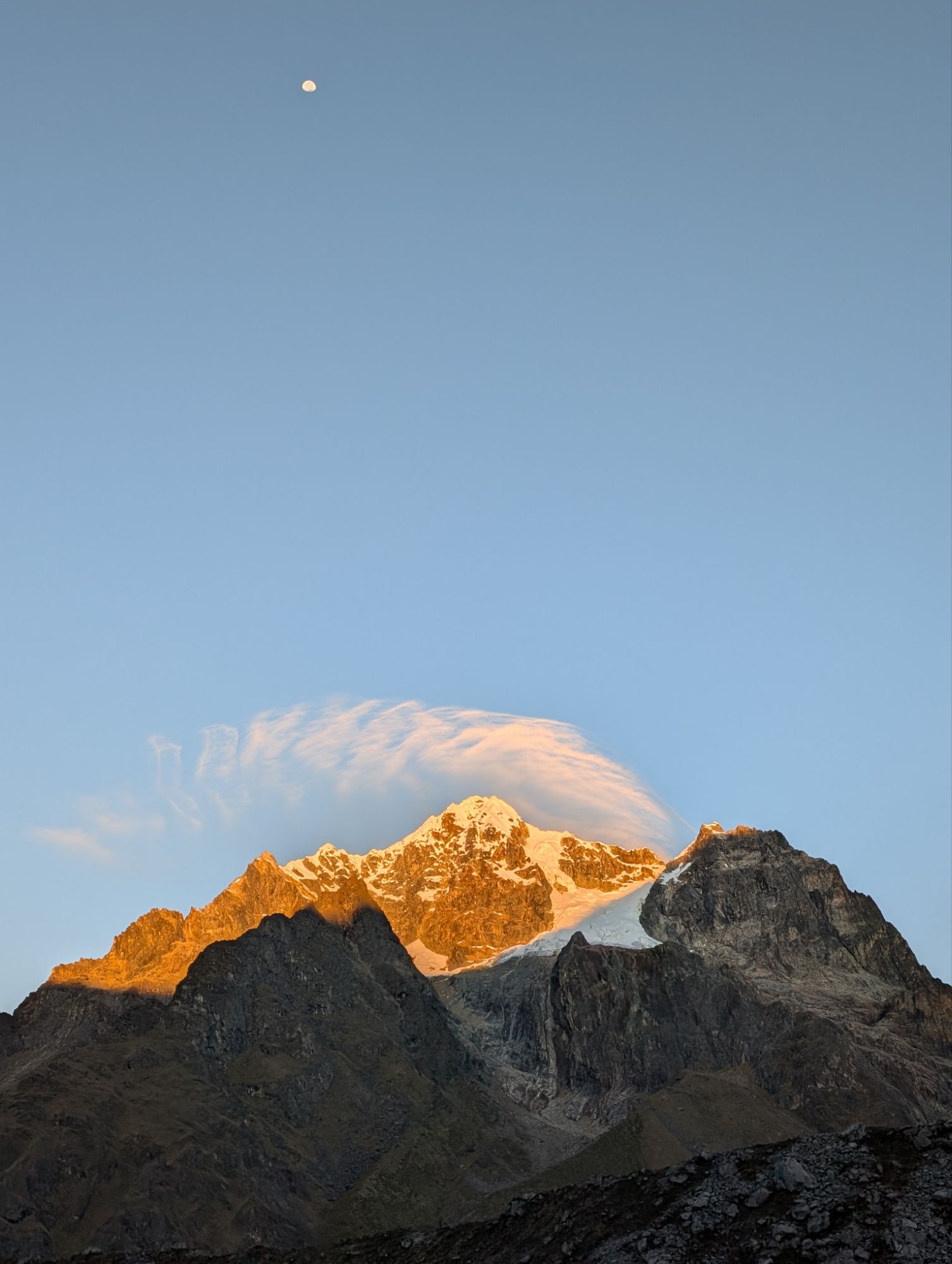 There’s a tiny area in the wispy clouds over Apu Salkantay that briefly flickers the faintest rainbow. And the moon shines brightly over Humantay. I’m ready several minutes before Elizabeth and I wait until the last second to take off a warm layer.