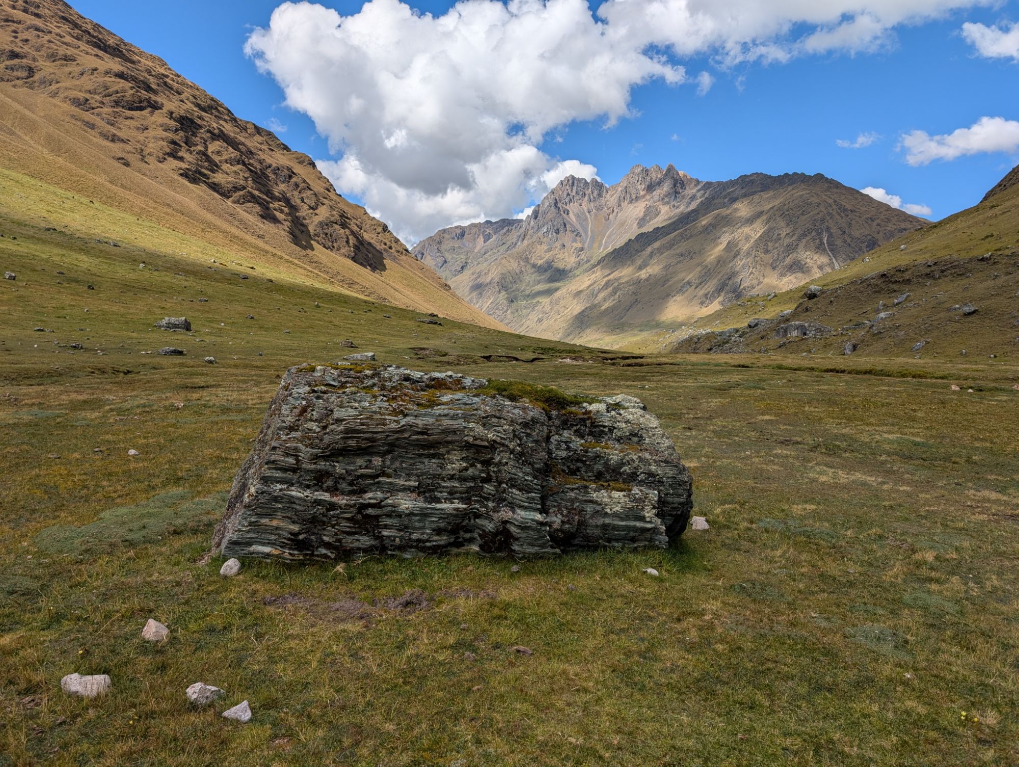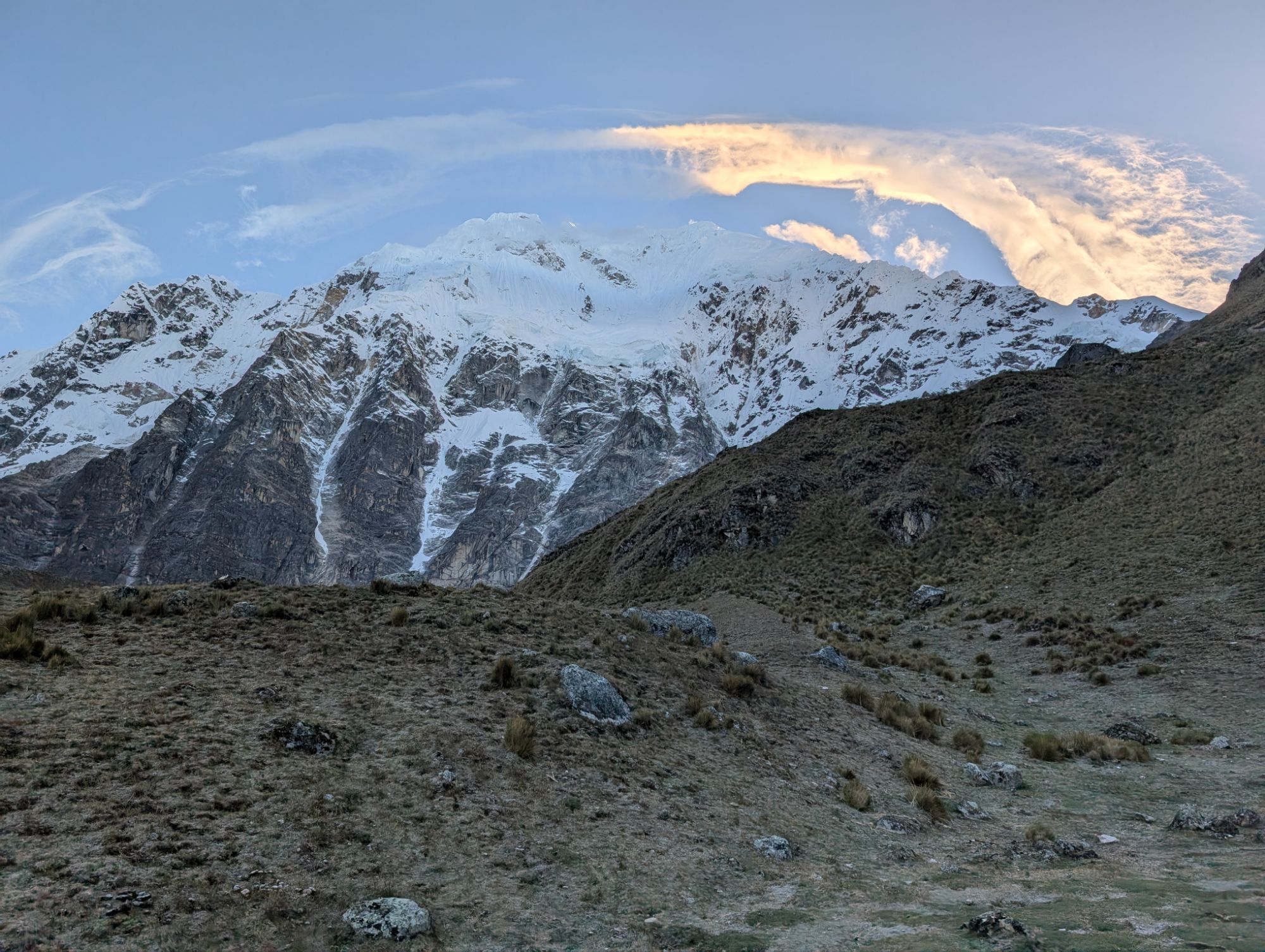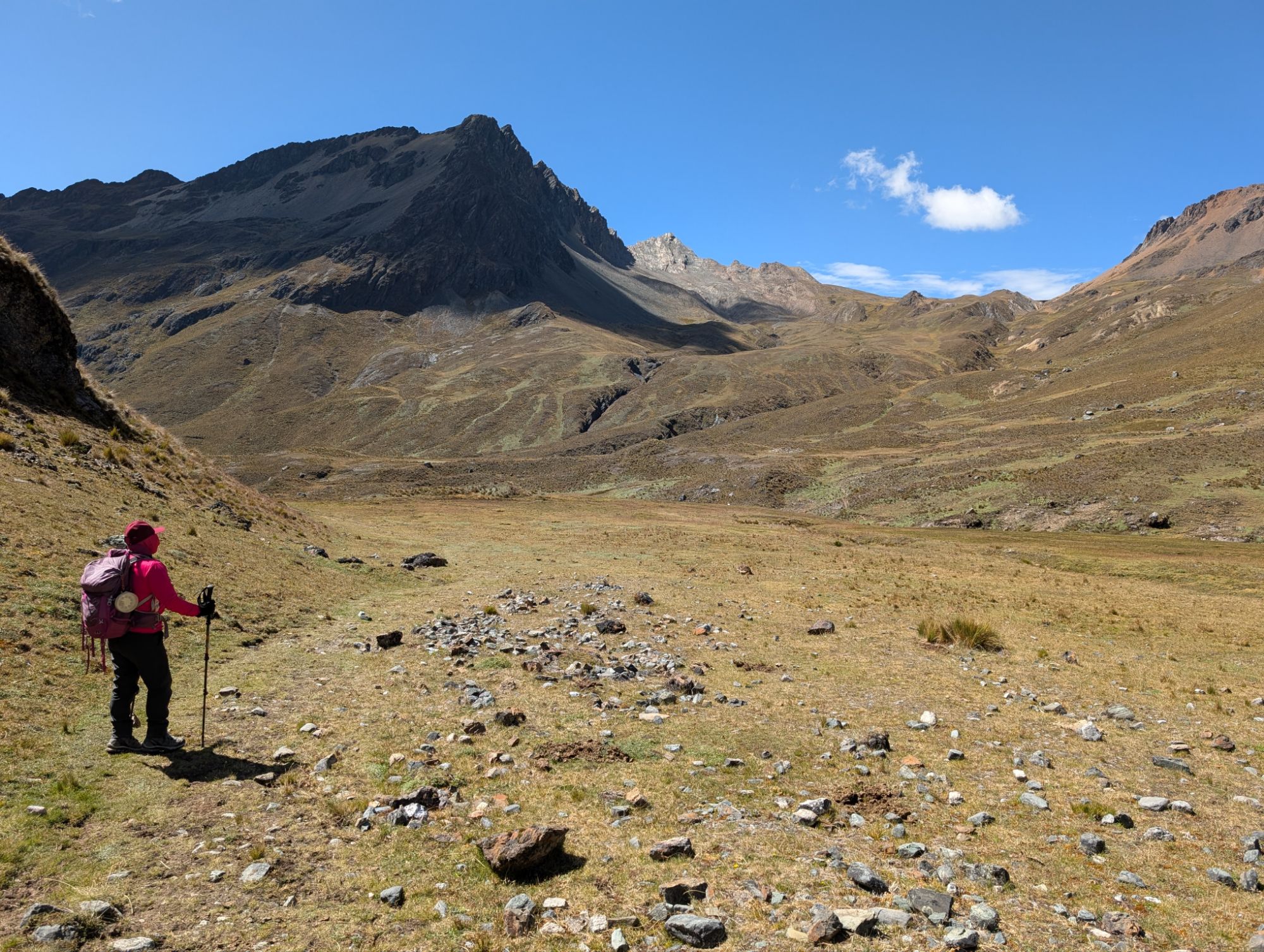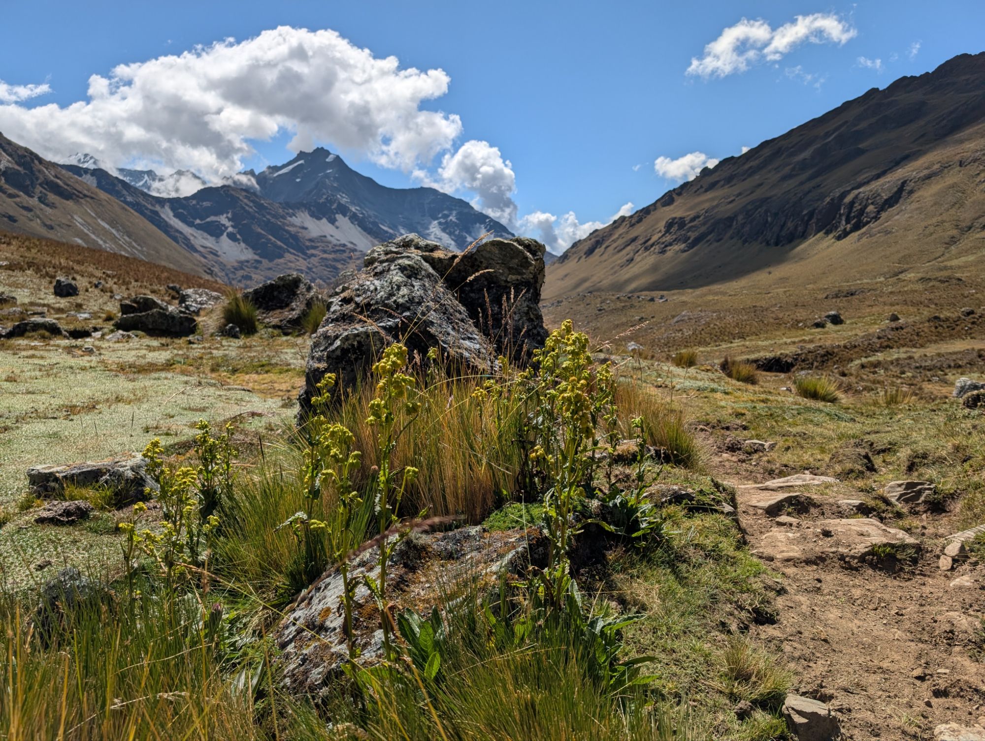 The sun finally reaches me and I shed my patagonia wind layer. I point out a large bird high in the sky and Elizabeth says that it’s an eagle. It floats over the mountains to our right and out of sight. At this high altitude, the vegetation is sparse. And there’s a couple birds that keep flitting away from me every time I try to take their picture. About an hour and a half after leaving camp, I turn around to a sound behind me. Elizabeth has an oval earthen whistle and calls to Earth Mother Pachamama and all her beings. Apu Salkantay good morning! Little birds good morning! Small flowers good morning! Laguna Salkantay we greet you! Apu Salkantay allin p’unchaw! Huch’uy pisqukuna allin p’unchaw! Huch’uy t’ikakuna allin p’unchaw! Laguna Salkantay napaykuyku!
