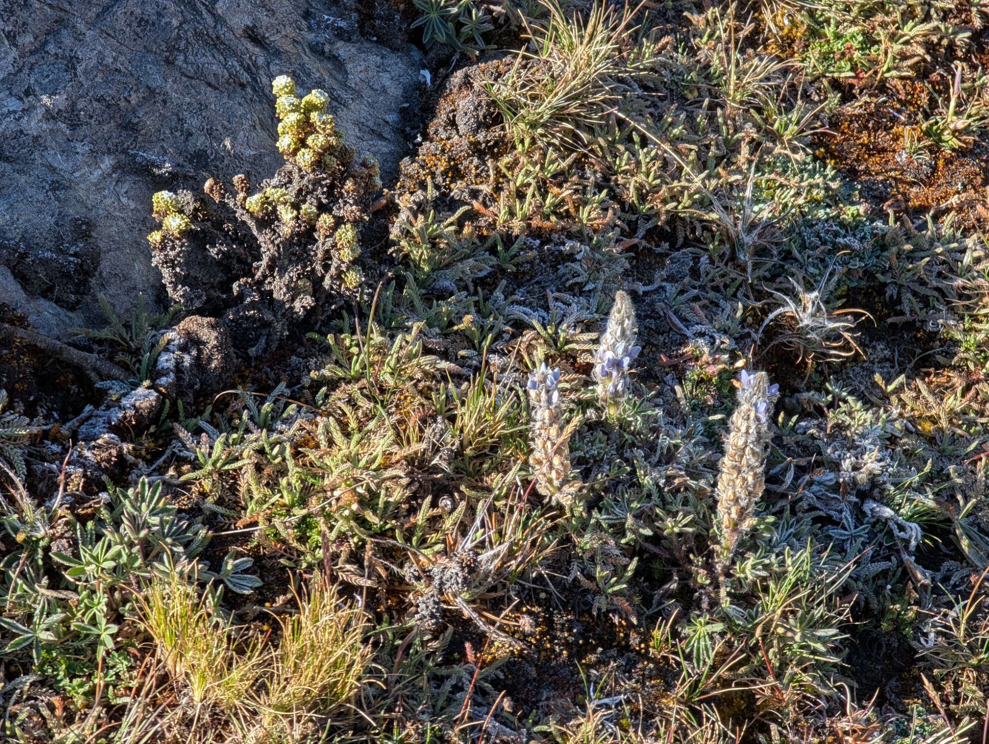 If you look closely, there’s lots of life in this high-altitude Puna zone. Several kinds of crustose lichens are painted onto rocks and Conyza is standing tall, with its yellow cone flowers getting ready to bloom. Clouds start to billow up and frost across the sky. I turn around and check out the spectacular view behind me.