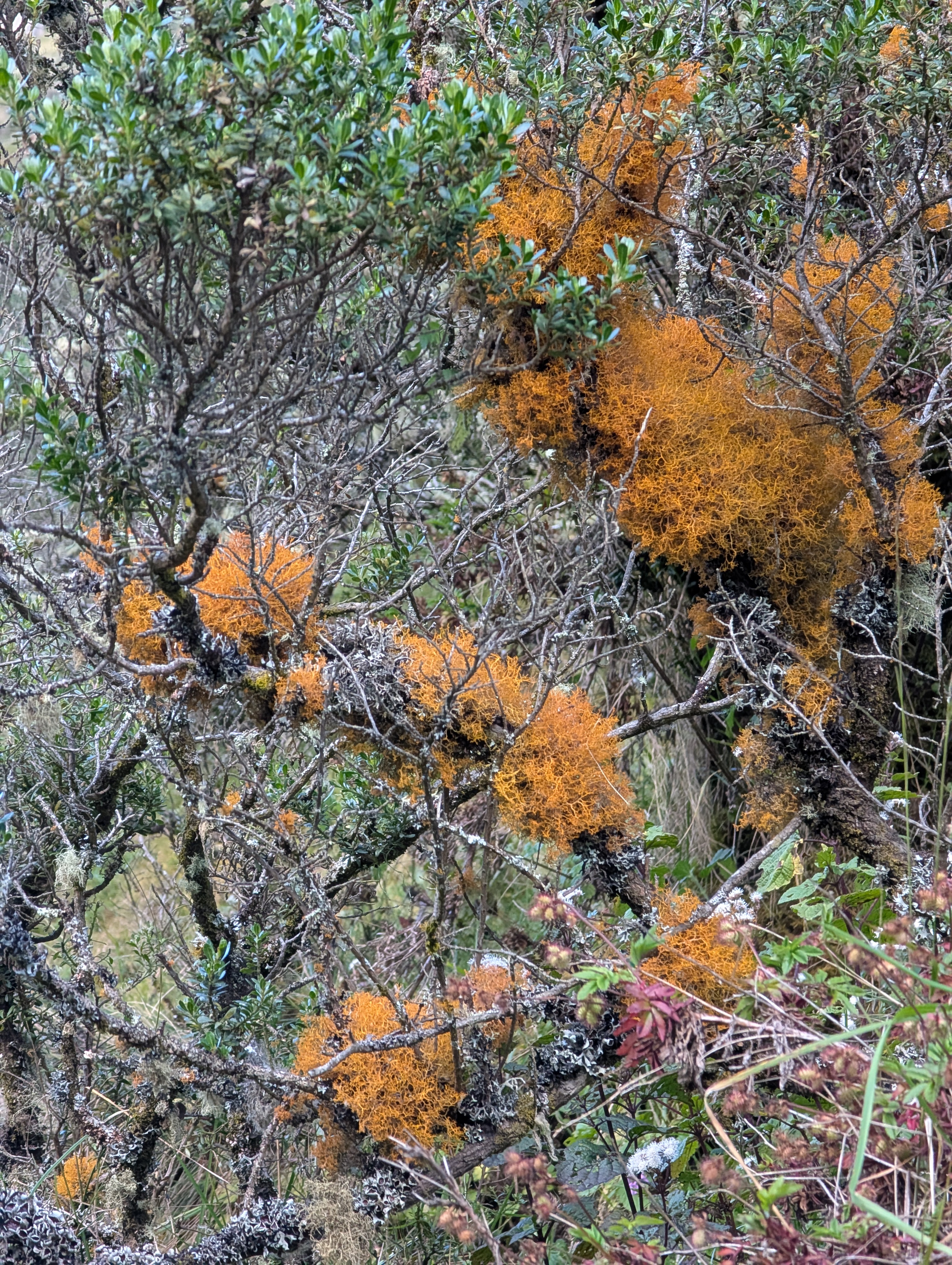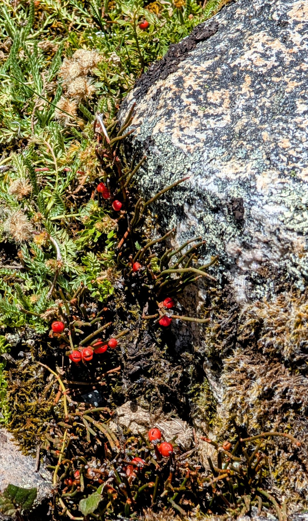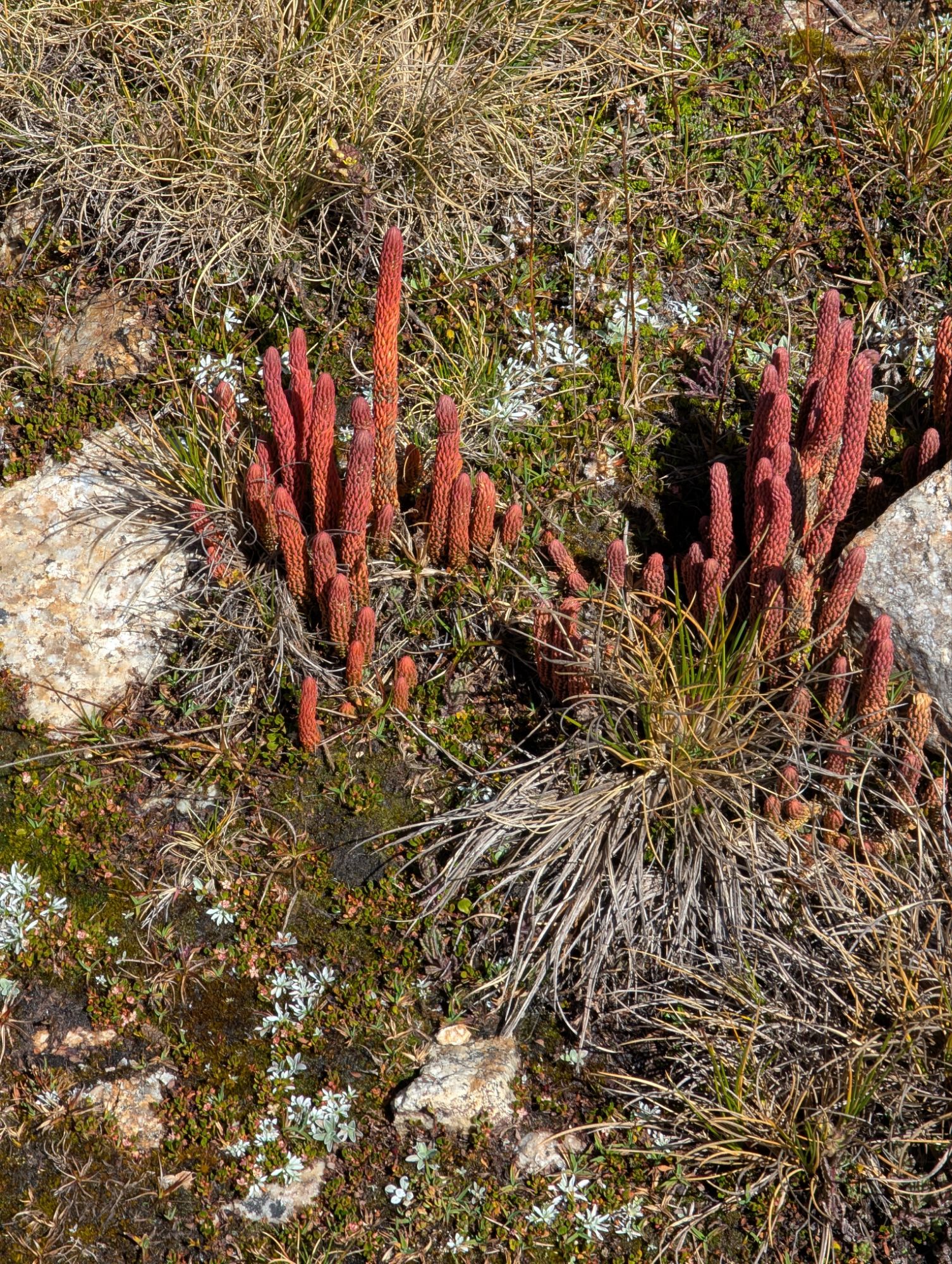 Our lunch spot soon slips out of view as I find all sorts of new wonders before me. Colorful peat or sphagnum moss, Elaphoglossum mathewsii fern and some more Ephedra americana. The black spores of the Elaphoglossum fern are distinct and look like a serpent tongue.