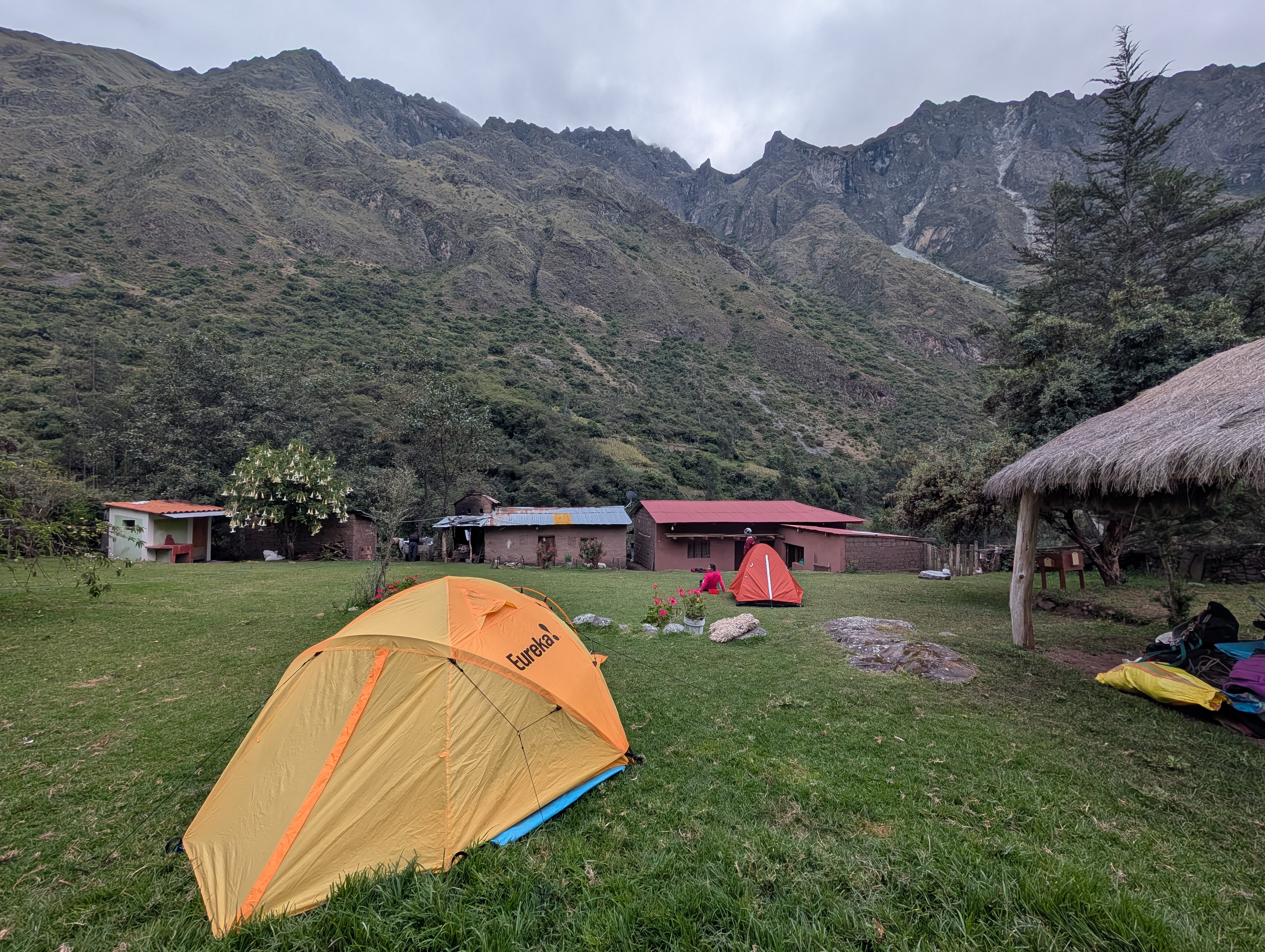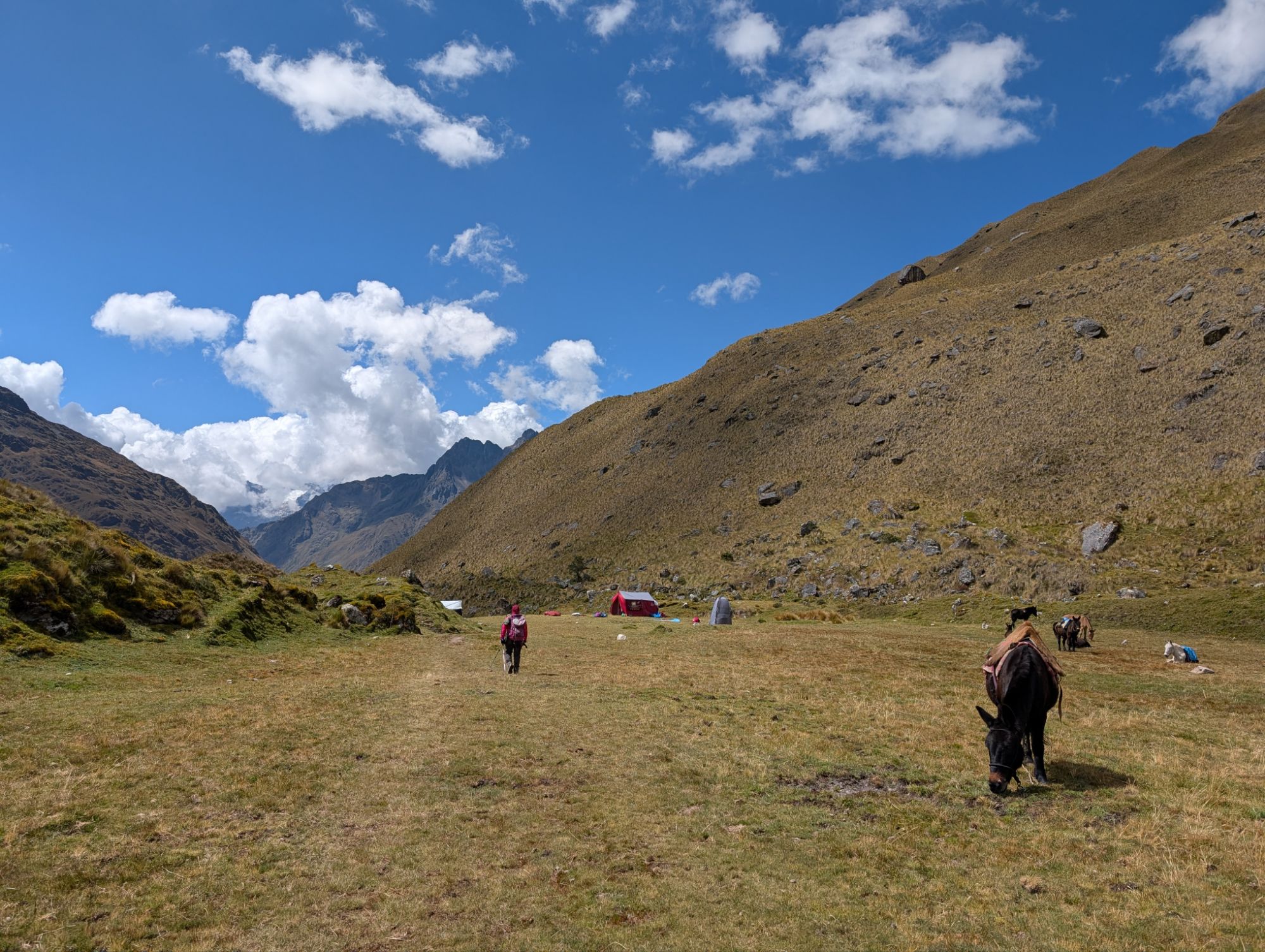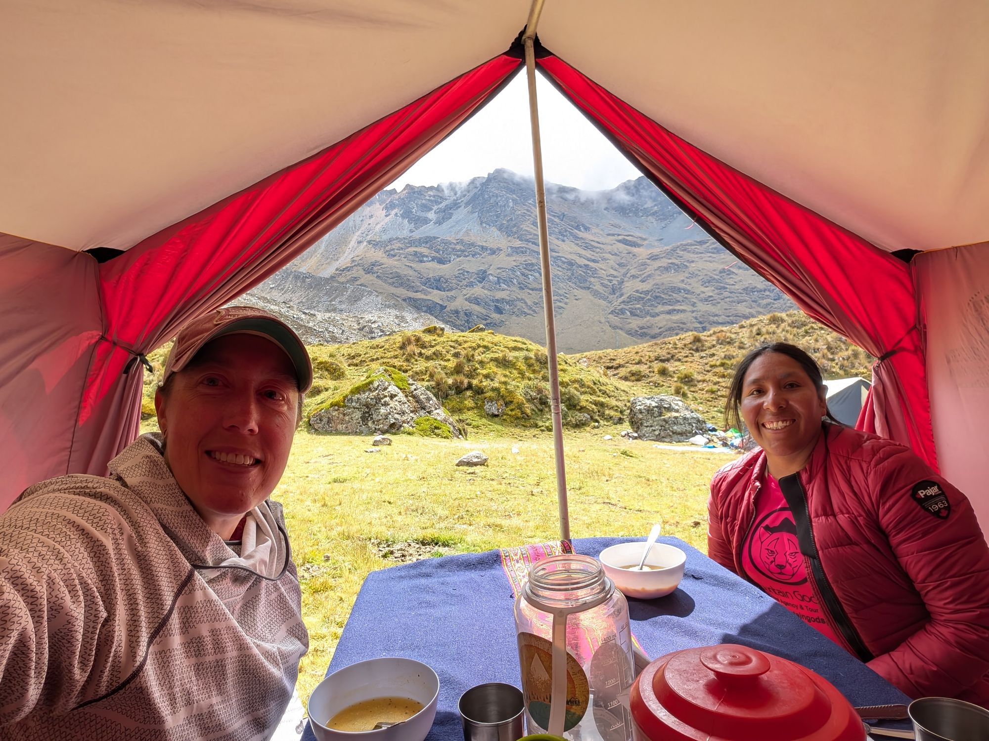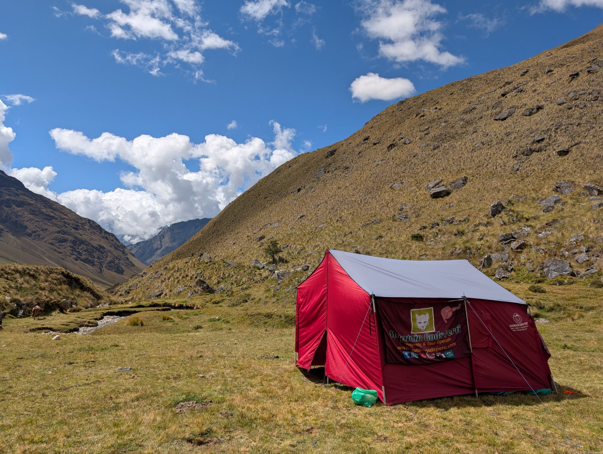 If you zoom in and look closely, you can see the red Mountain Gods Peru mess tent situated on the flat plateau ahead called Sisaypampa. After descending for a total of 2.5 hours, we follow the trail into Sisaypampa where the horses have already started grazing for their lunch. There is one other tent set up by another tour company. May I remind you that we were all together at Incachiriaska Pass just 2.5 hours ago. In that time, the Mountain Gods Peru crew has trekked down from the pass, set up the mess tent and toilet tent, set up our table and chairs, and are cooking lunch. I set my backpack out on the provided tarp and relax for a moment before being served with a pre-lunch beverage. A bowl of warm water also appears and I wash my hands and wipe them dry on a small towel.
