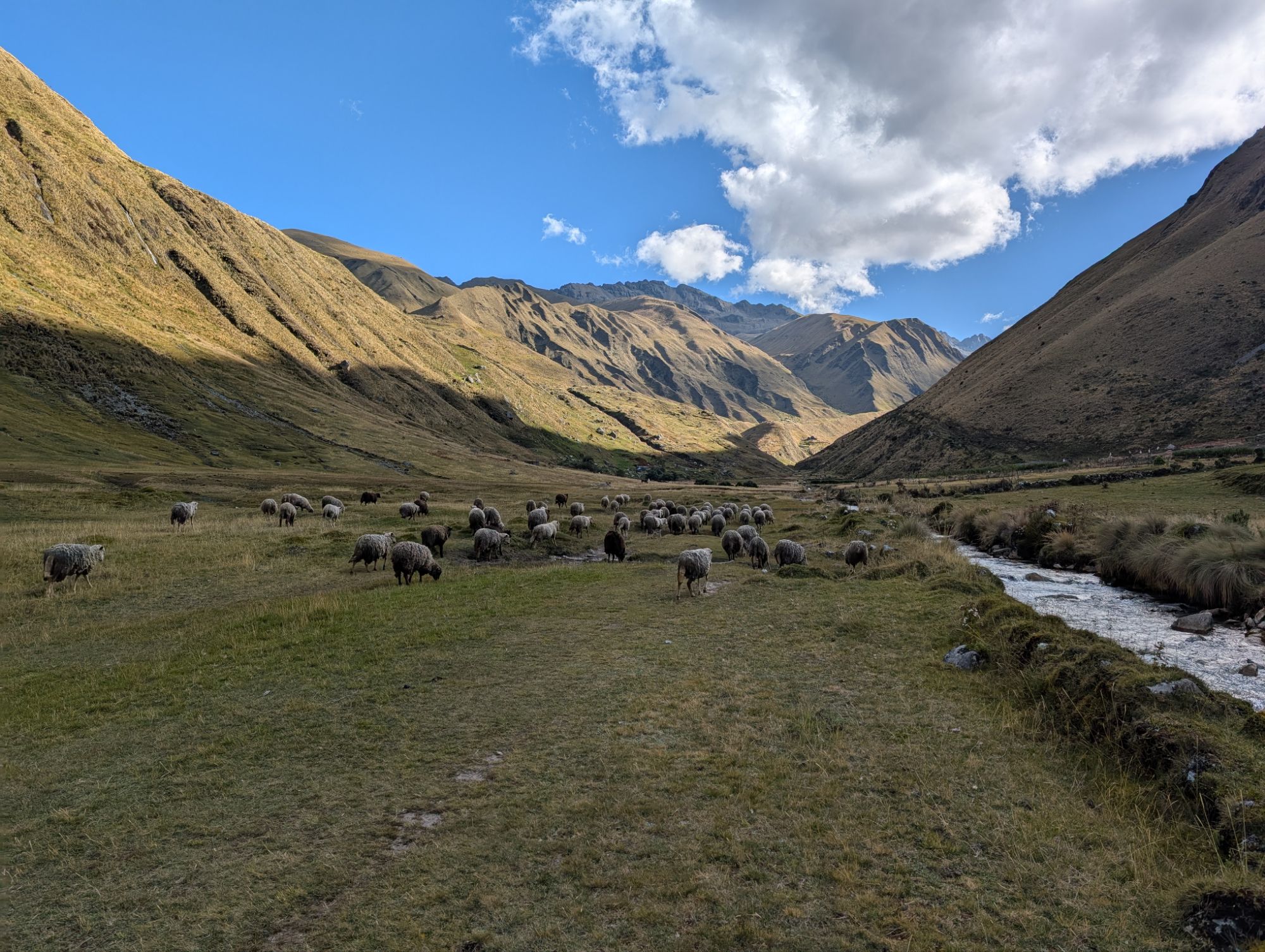 After we cross over the canal, we soon see a herd of sheep coming towards us. Behind them walks an elderly woman whose face is etched with wrinkles and Elizabeth speaks to her in Quechua. Elizabeth unloads some snacks and fruit into the woman’s skirt. I add a passion fruit as well. The woman smiles and seems very grateful. We part ways and the woman continues up the canyon with the sheep, presumably to the nearby houses.