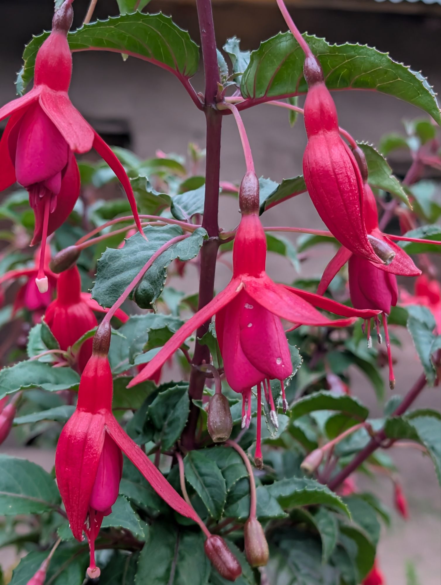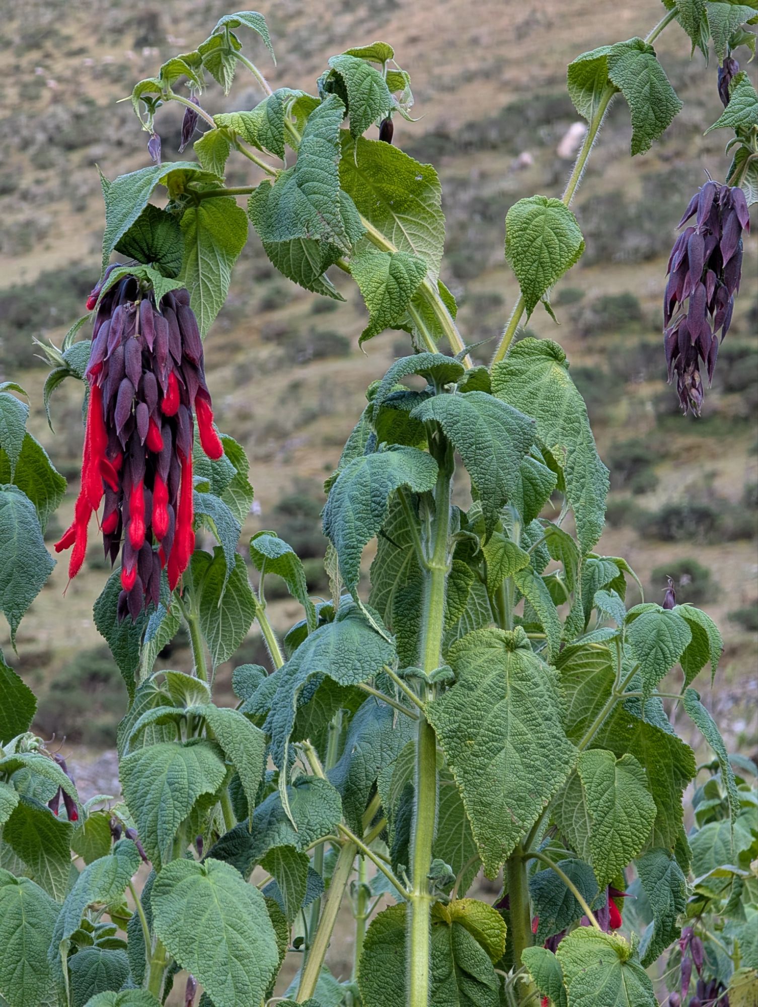 We reach the end of the flat valley floor and then the trail starts to descend more steeply. We pass Telochistes flavicans or golden-hair lichen, Polystichum andinum, a type of shield fern and some more Ageratina. As we drop in elevation, flowering plants begin to flourish and line the trail. Salvia dombeyi or Giant Bolivian Sage looks just like the mole poblano salvia I have at home. But these are more like trees with large hanging flower masses. Brugmansia sanguinea, or red angel’s trumpet must tempt every good shaman.