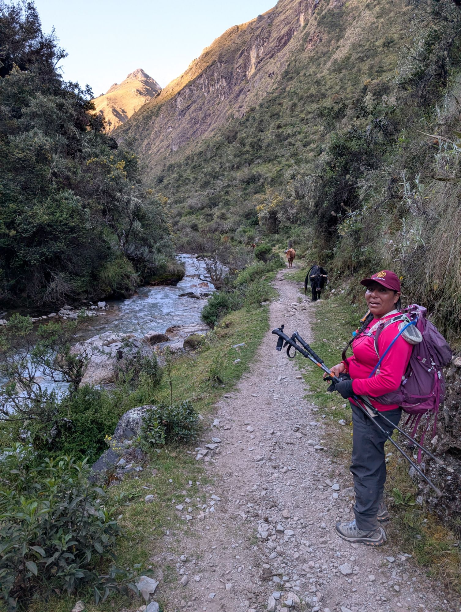 Just about 3pm we round a bend in the canyon and a narrow line appears below us near a few small houses and farm plots. This treasure is an ancient Inca canal utilizing advanced engineering and water management skills. The canal, which is constructed from precisely cut and fitted stones, uses the gentle slope of the valley to easily move water down the canyon. The canal was an important part of the Inca’s extensive hydraulic network and is still used today by local farmers to irrigate crops. Pause and imagine for a moment about the construction involved to make this river stop meandering and to prevent erosion and landslides with effective drainage.
