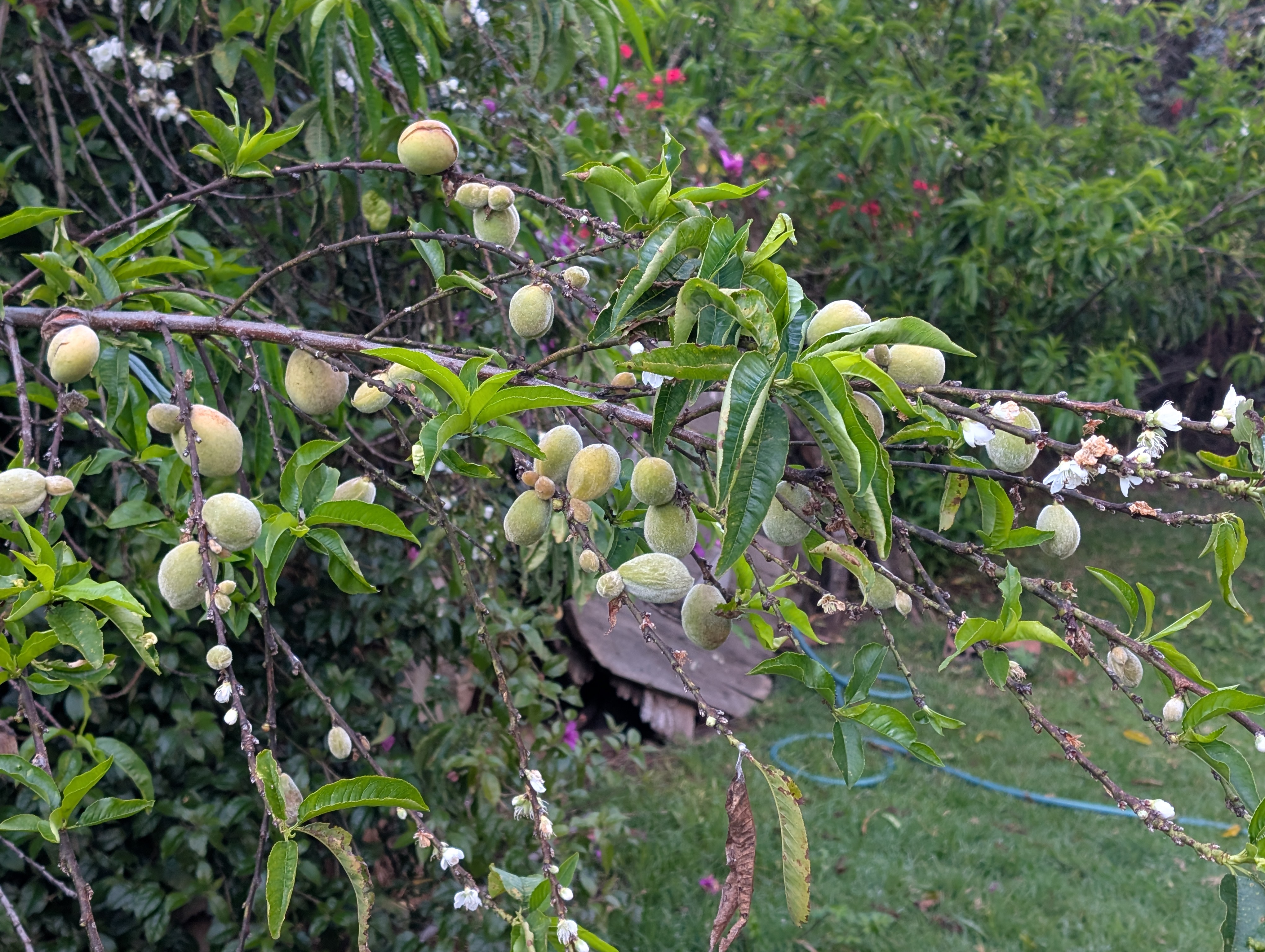 I sleep as well as possible and better than the night before. Our extra miles yesterday translate into a leisurely morning and I get to sleep in until 6 am. After my usual morning rituals, I extract myself from my tent and spend some time checking out all the flowers in the yard. Fuchsias, roses, bougainvillea and a bird pecking at the hull of an almond.