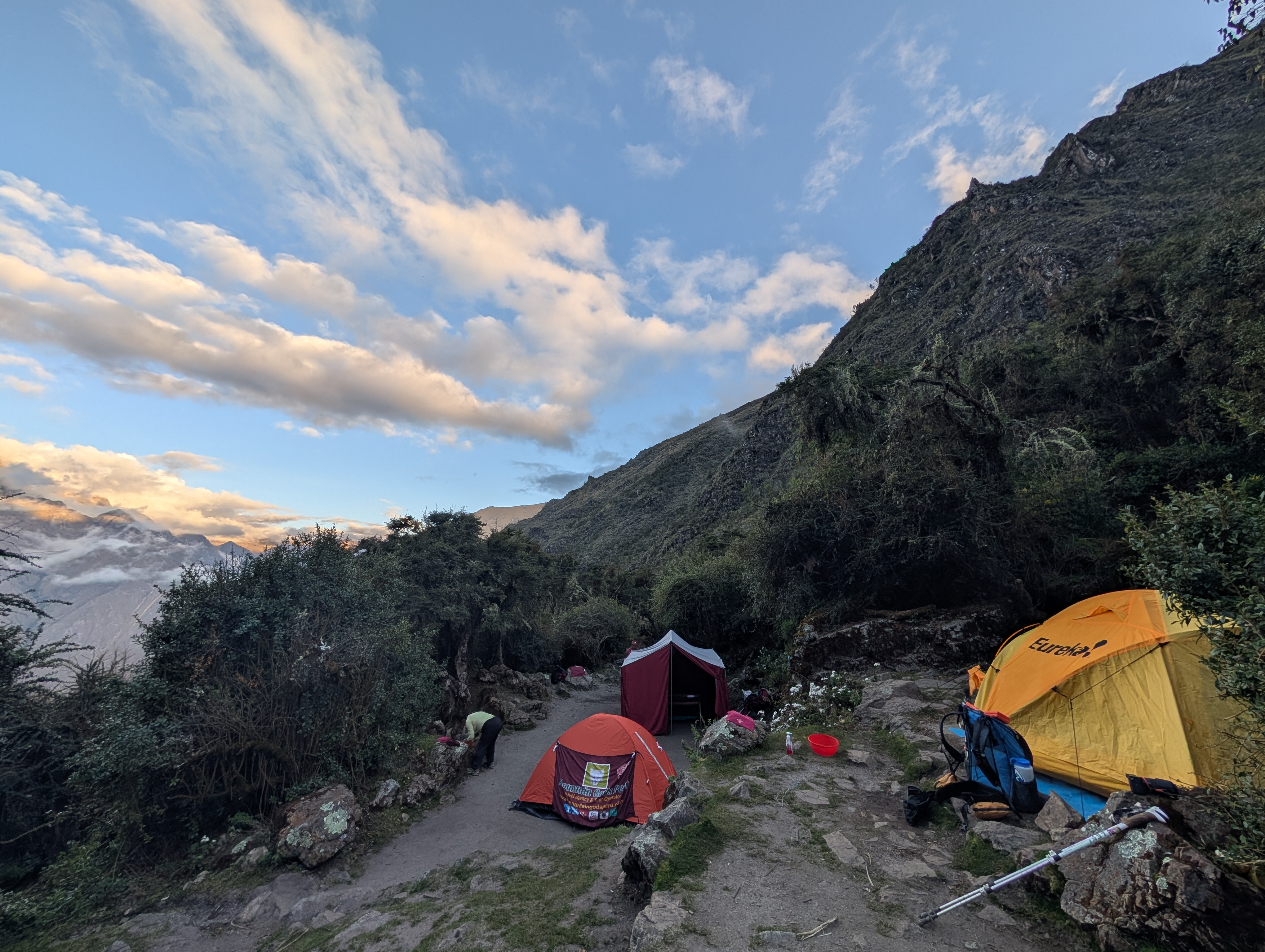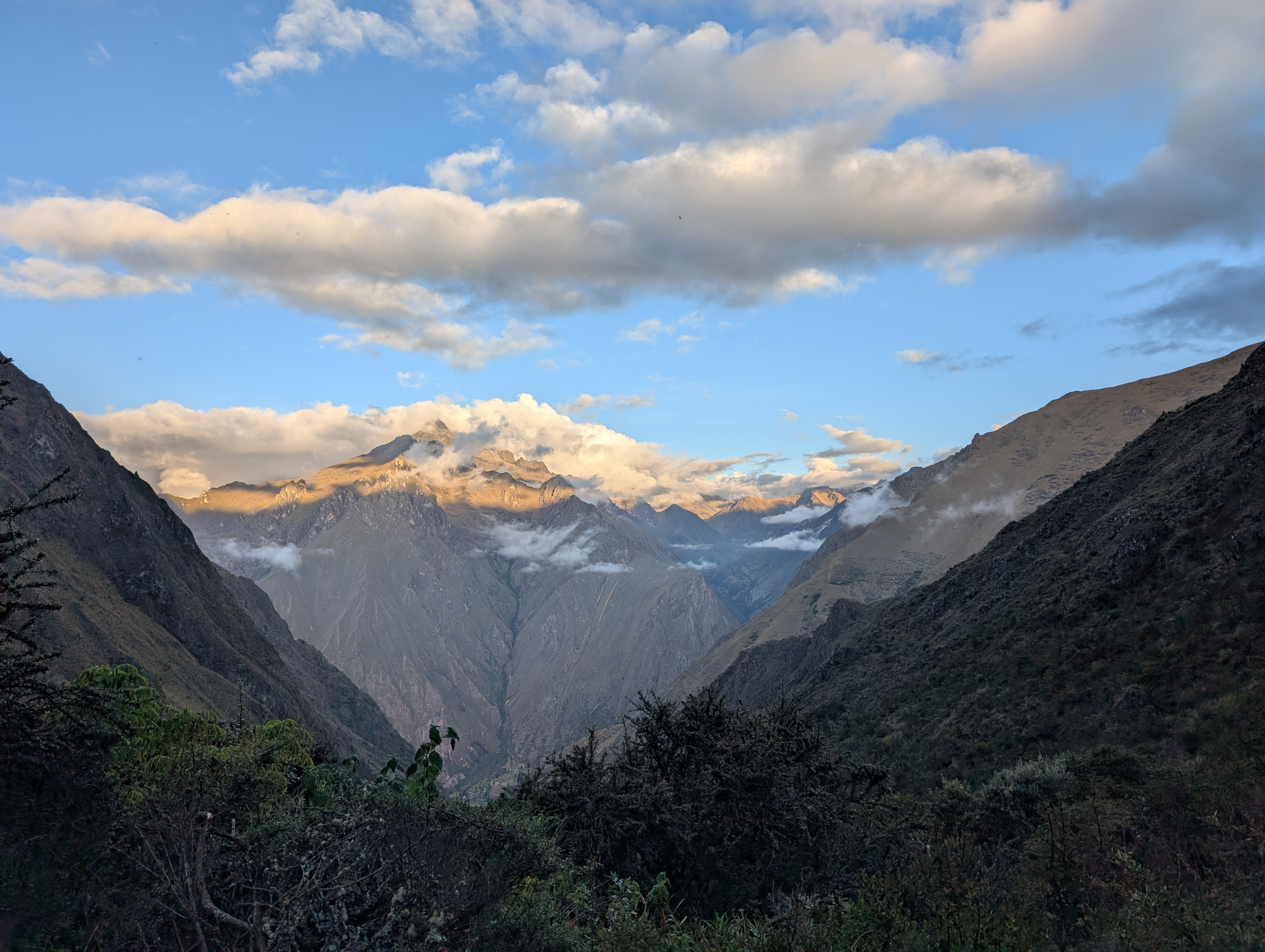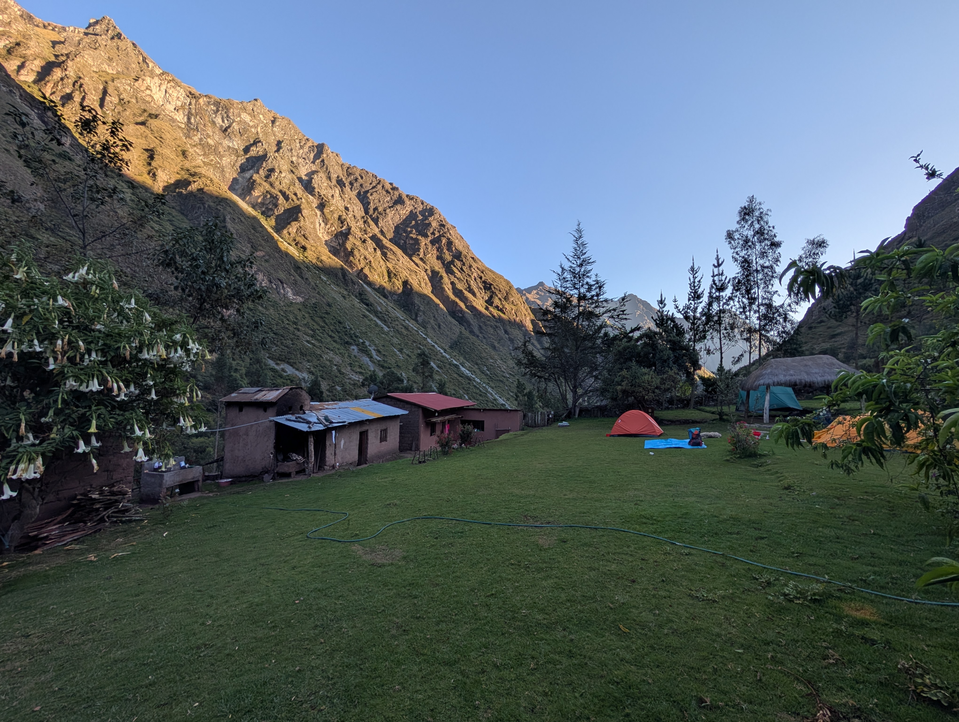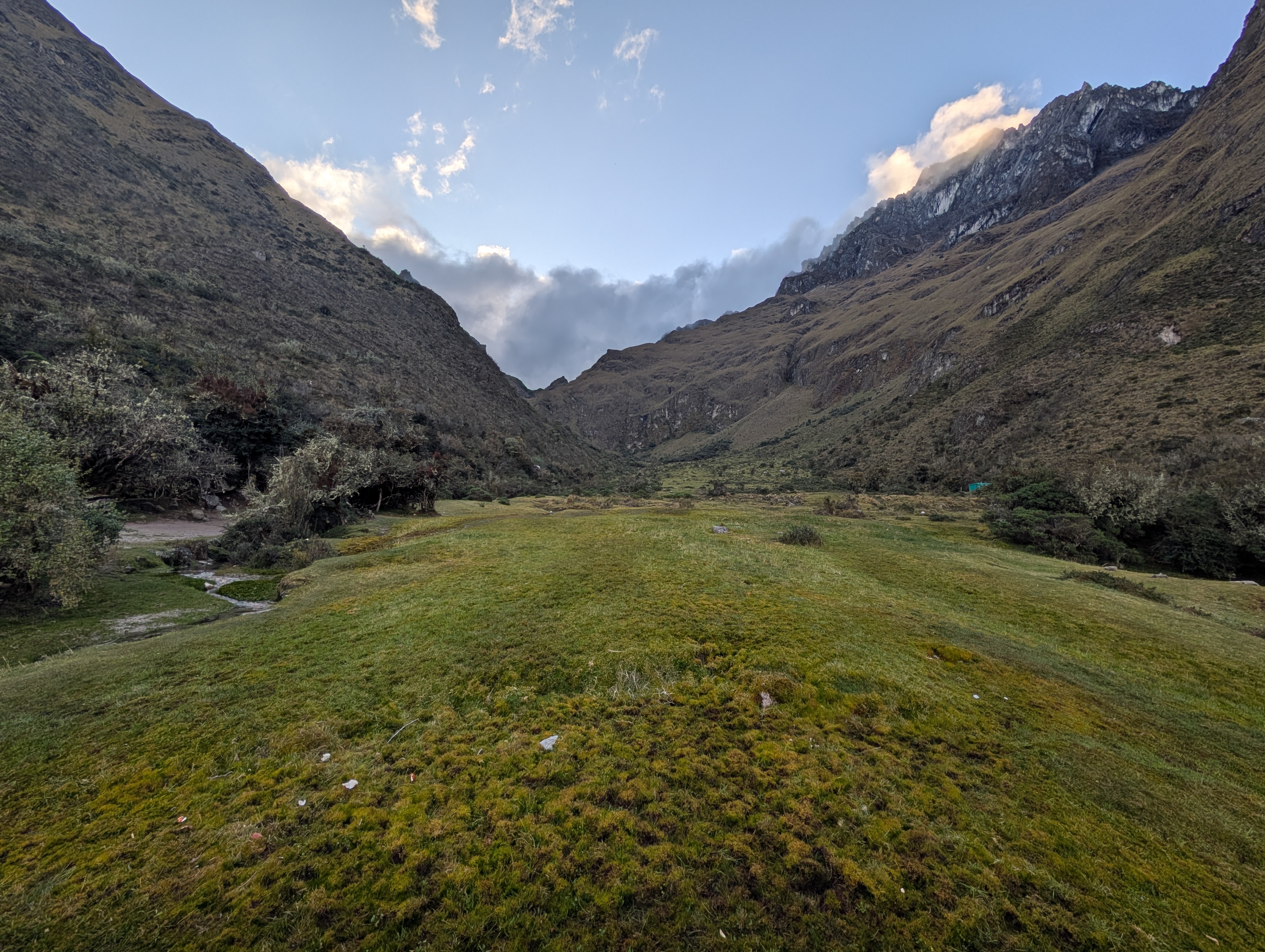 We arrive at Llulluchapampa, our home for the night, just before 5 pm and having climbed about 1,500 ft. since Ayapata. Remember that two L’s in Spanish make a you sound. So it’s pronounced, you you cha pampa. Also remember that bamba or pampa mean plain. This camp is a small flat area in this otherwise very steep canyon. Before ascending to our campsite, I turn around and take another look down the Llullucha canyon as the setting sun turns the mountains to glow.