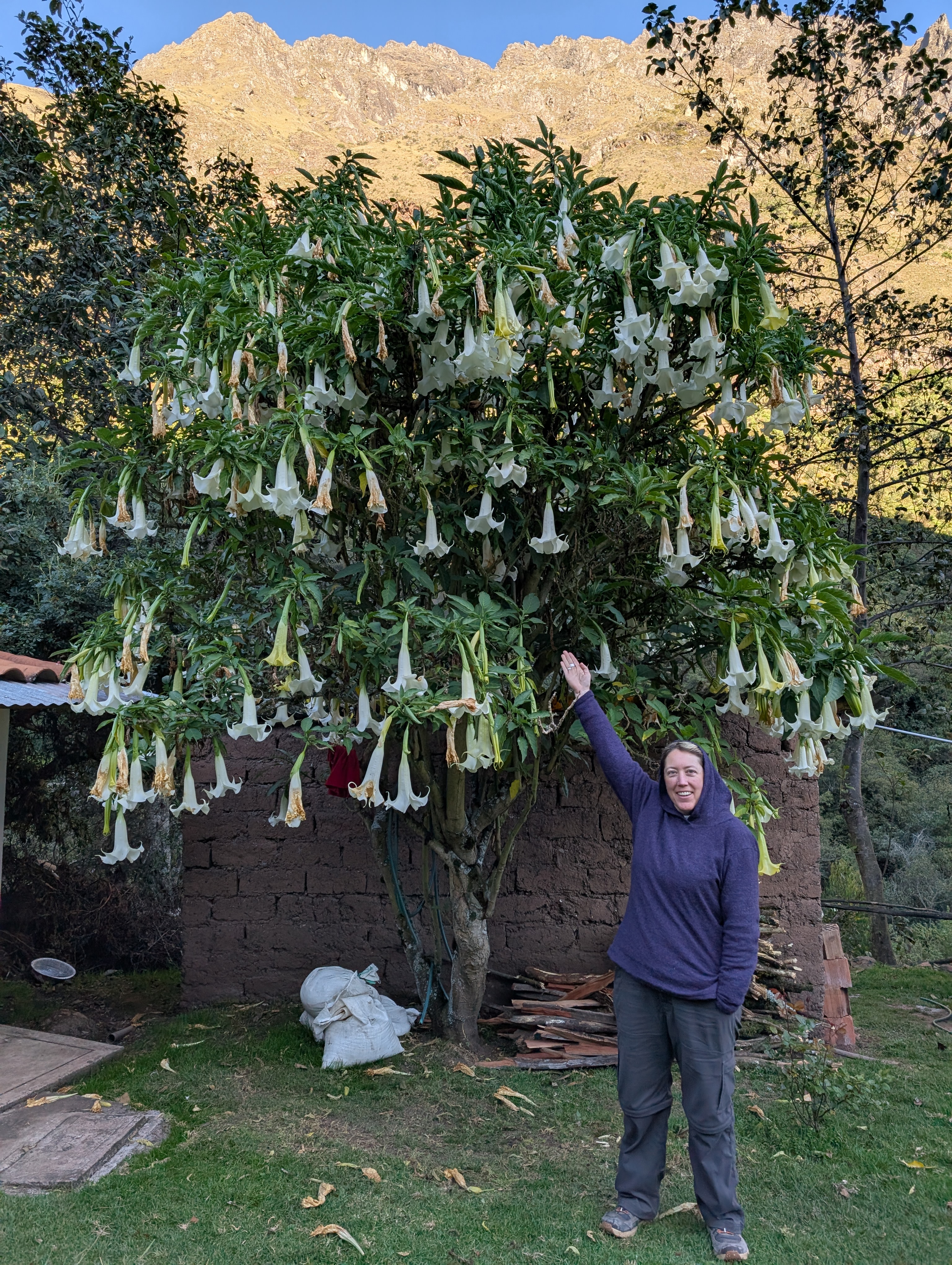 I’m obsessed with the giant Brugmansia arborea tree in the yard and must absolutely get my picture with it.