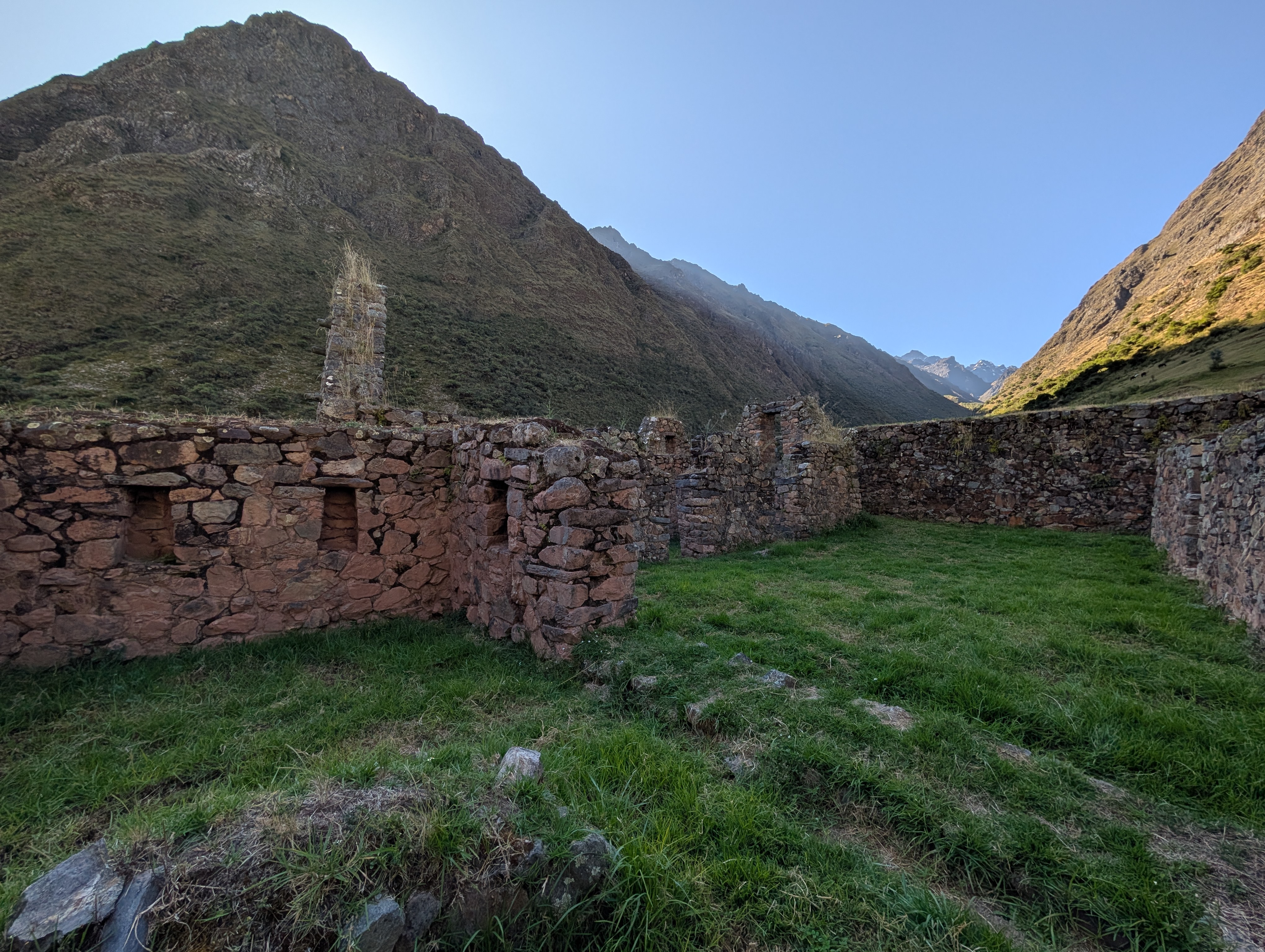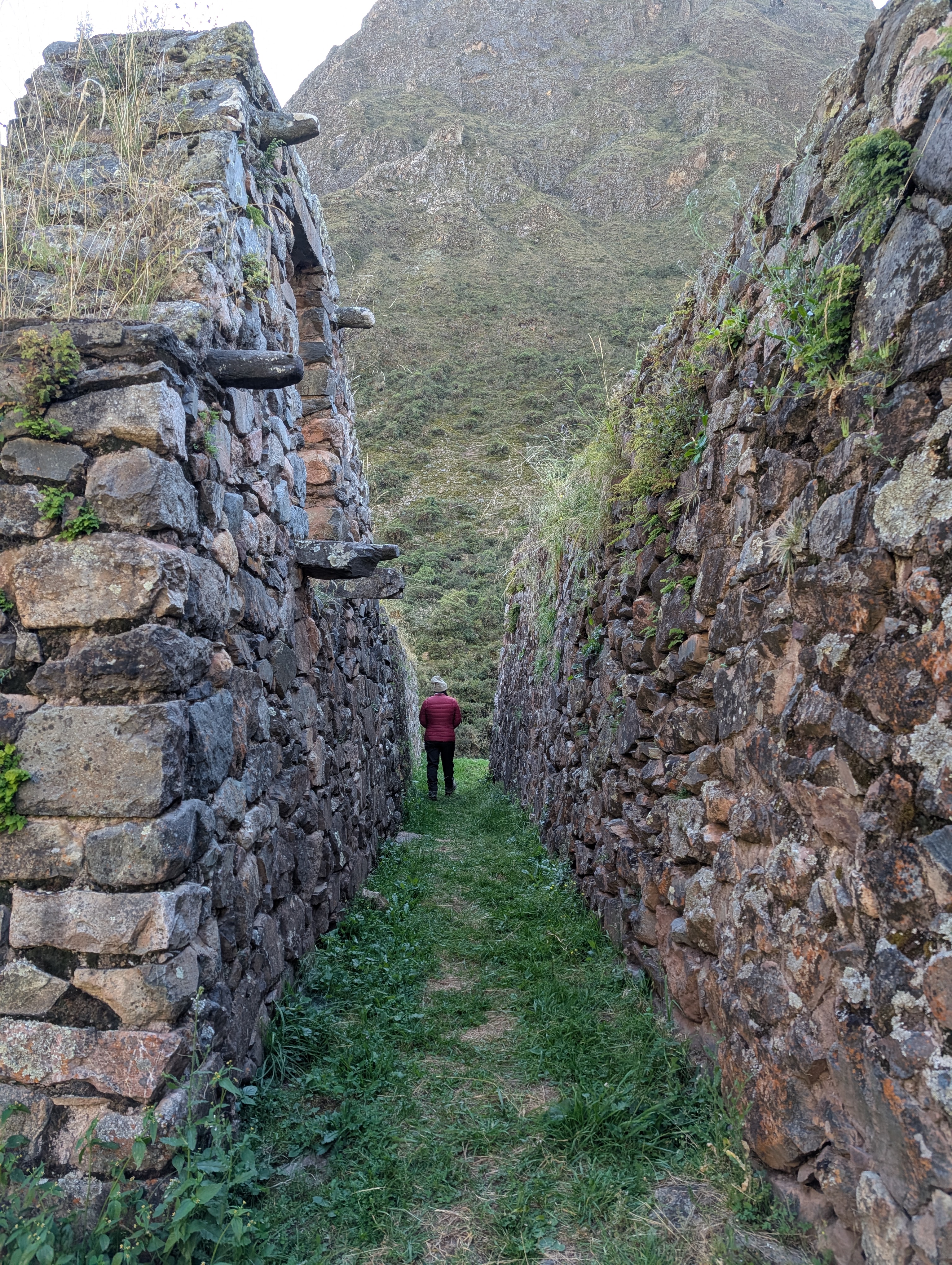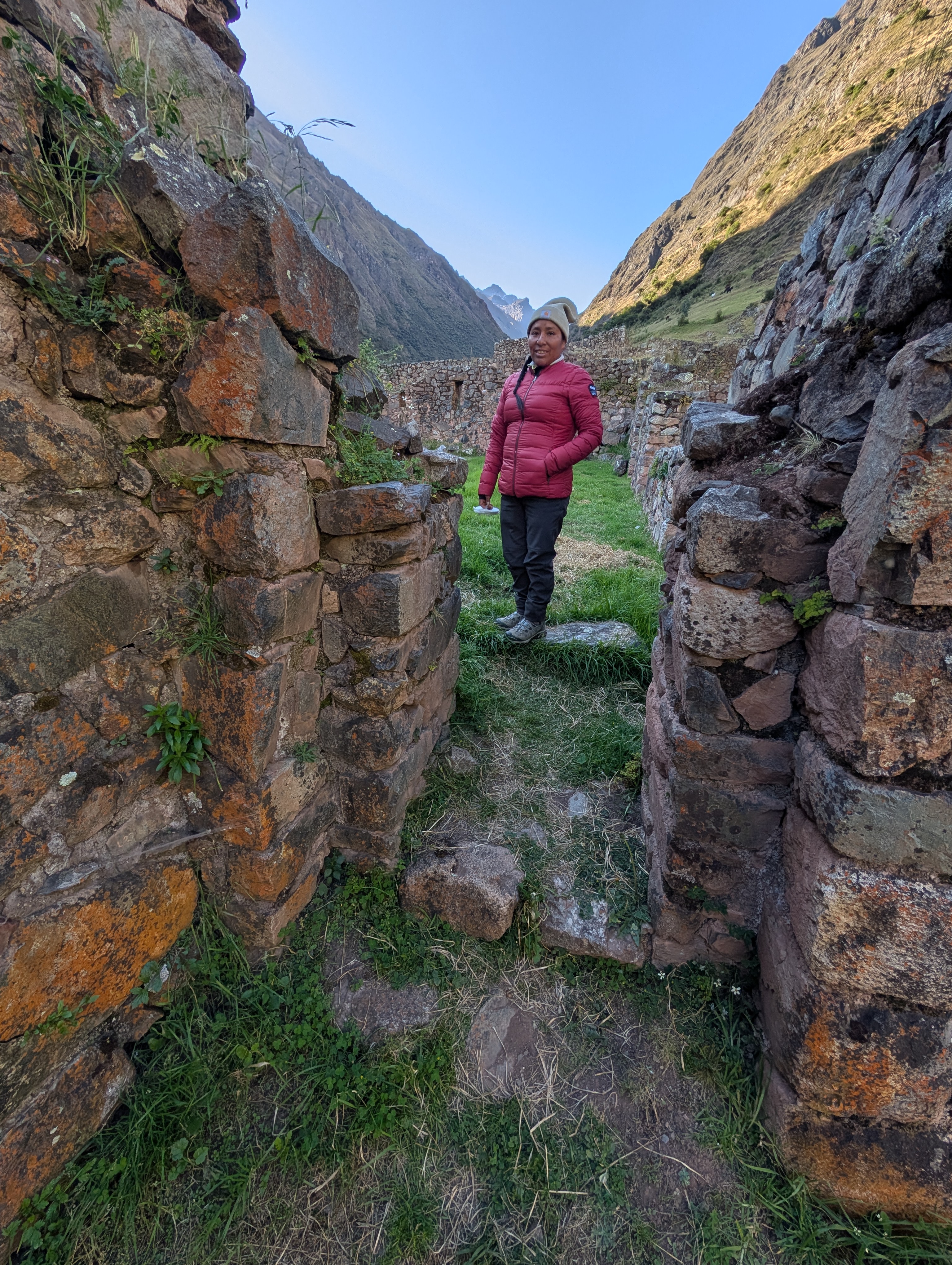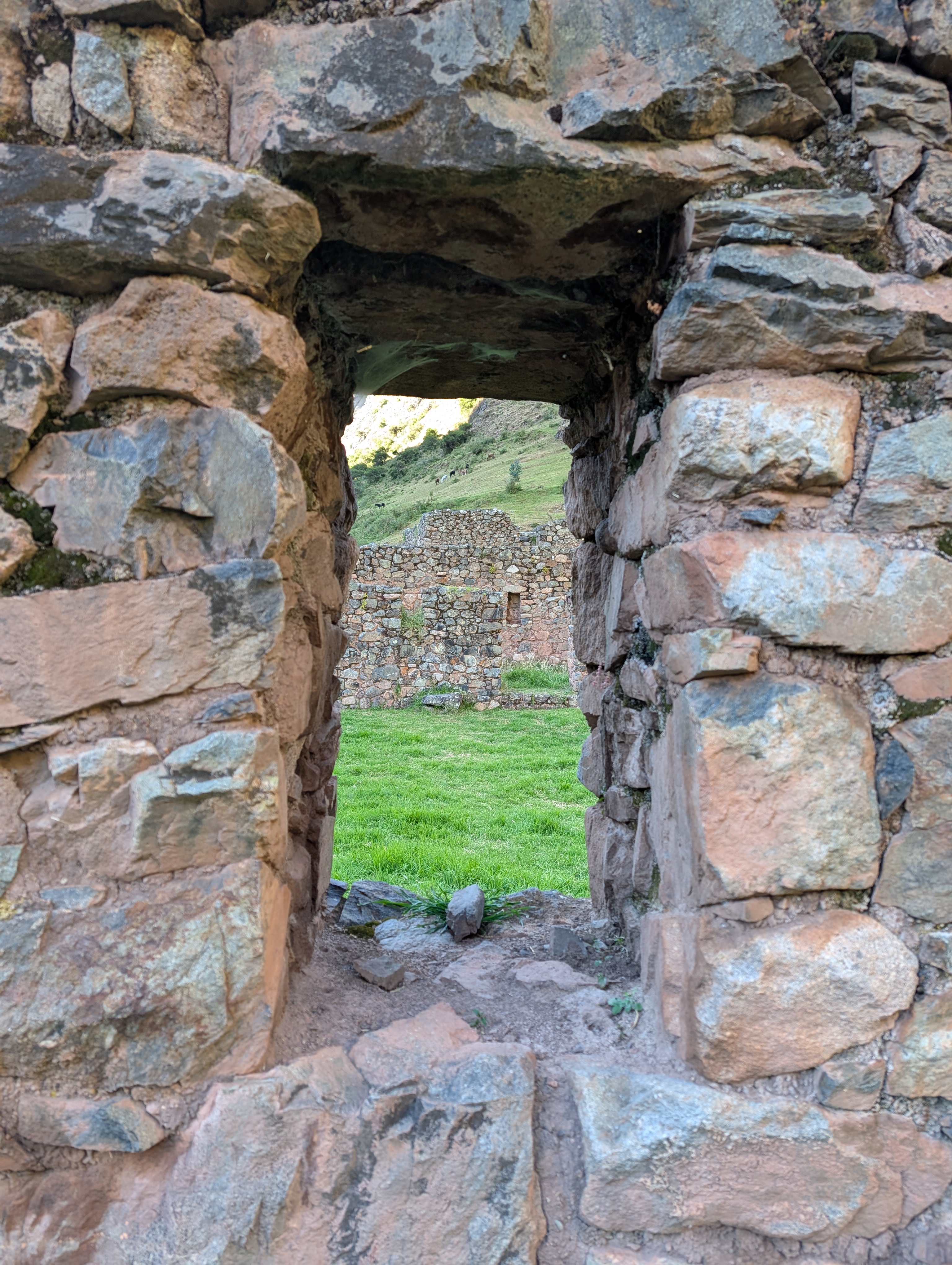 We hike up the stairs that connect the agricultural terraces and then follow a narrow pathway towards the main entrance. Elizabeth explains about the symbolic tiered entryway stonework that is used to signify a religious entry point. Paucarcancha was a small Inca citadel which served as a ceremonial and administrative center. This is a lesser-known ruins site which means that Elizabeth and I have it all to ourselves as the sun slowly creeps into the valley.
