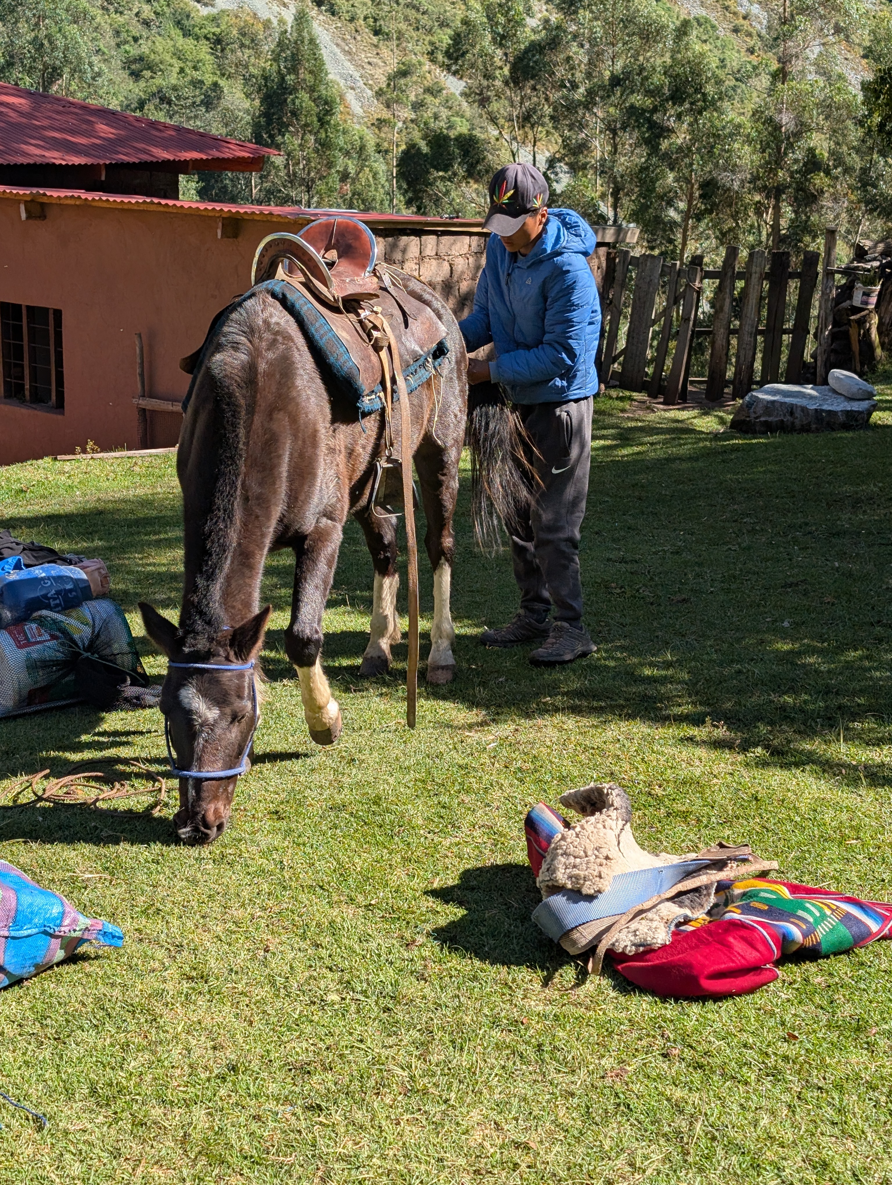 By 9:20 am we’re back down to the home where we camped and Oscar is packing up one horse. Sadly, it is time to say goodbye to Oscar and his horses because horses are not allowed on the Inca Trail. There’s something very sweet about Oscar so it’s hard to say goodbye to him and his crew. With tears in my eyes, I give him a tip before he loads up one horse. Oscar will deliver some of our gear farther down the canyon to Huayllabamba, where we will have lunch before officially joining the Inca Trail.