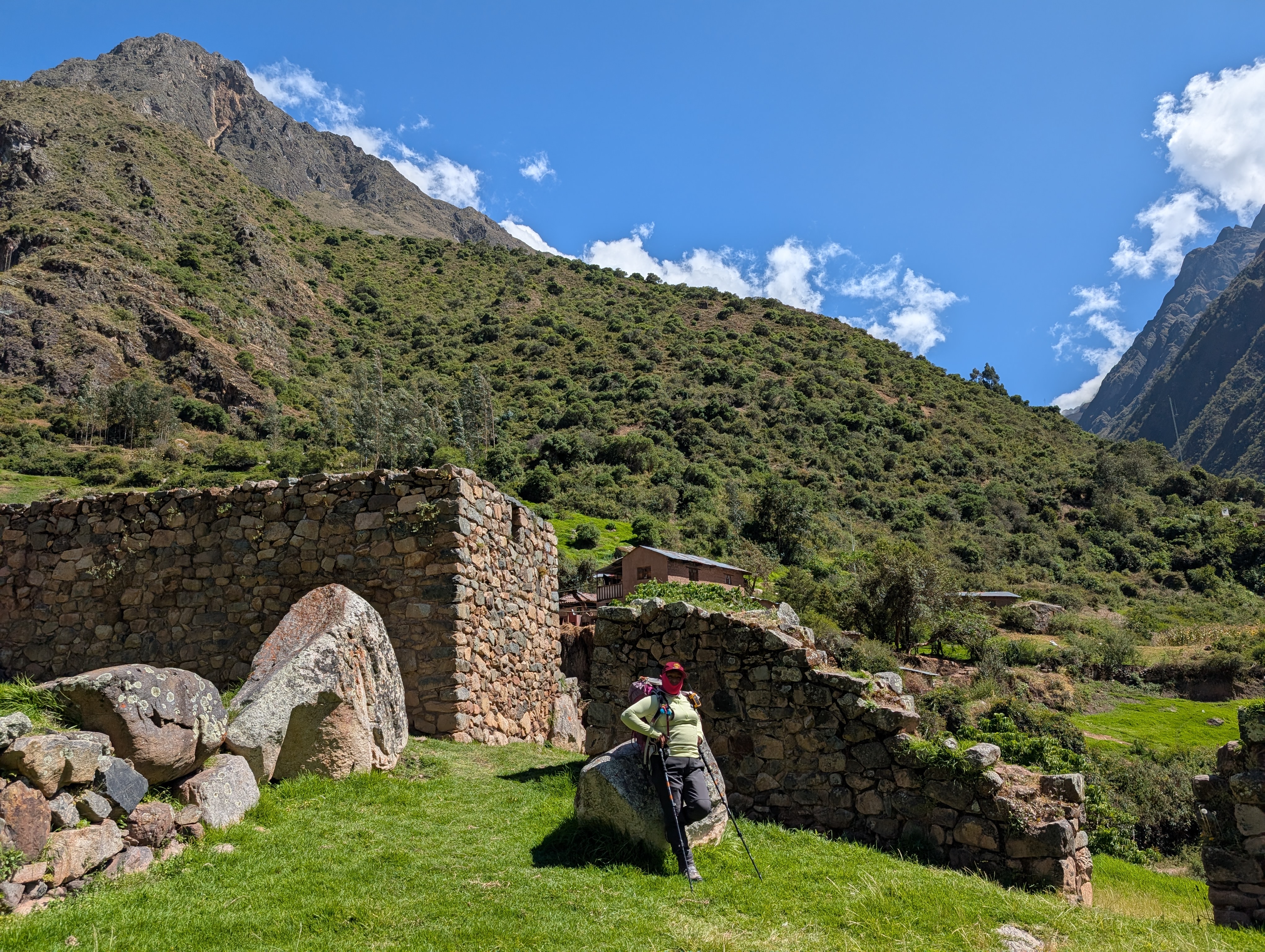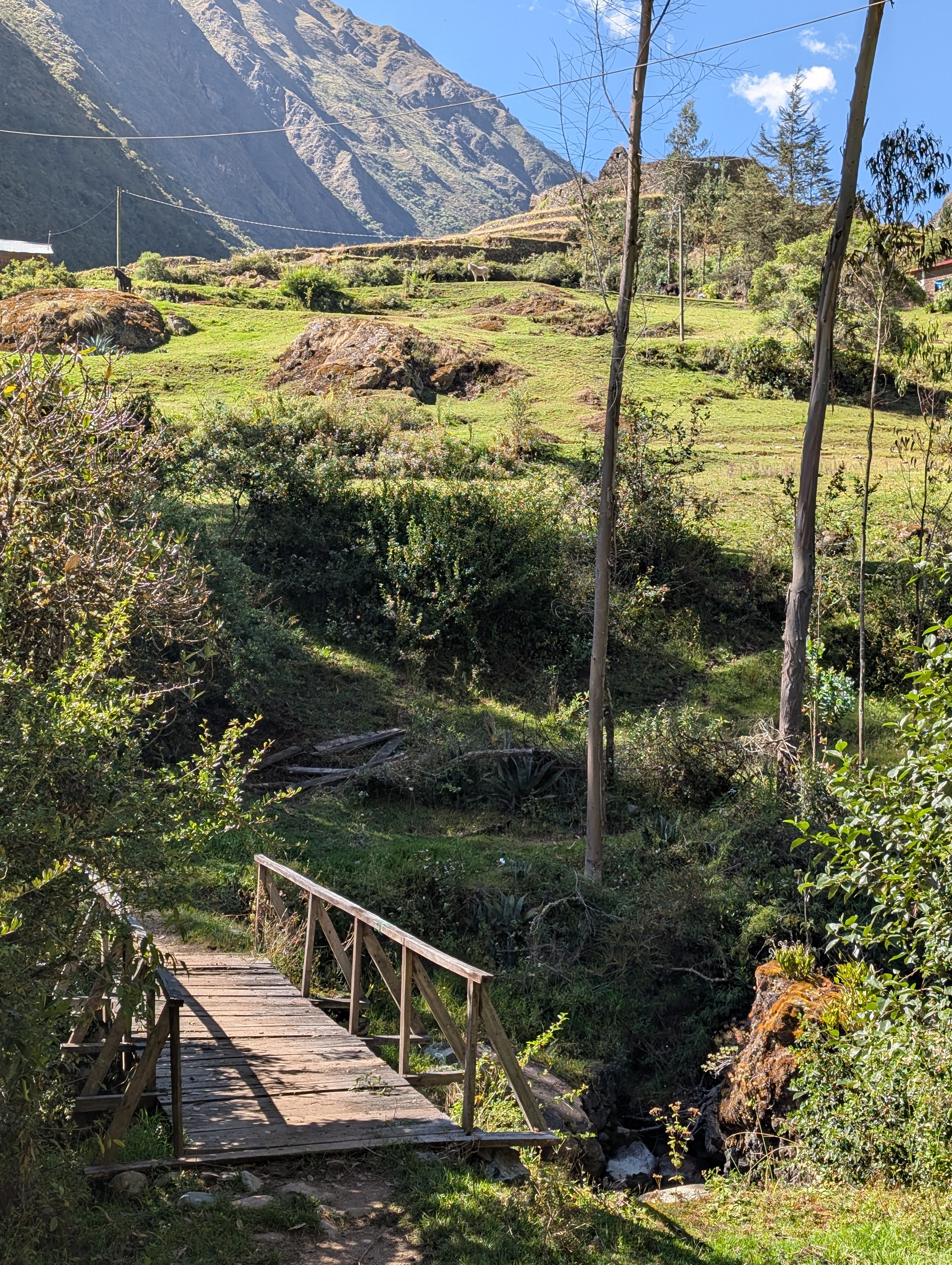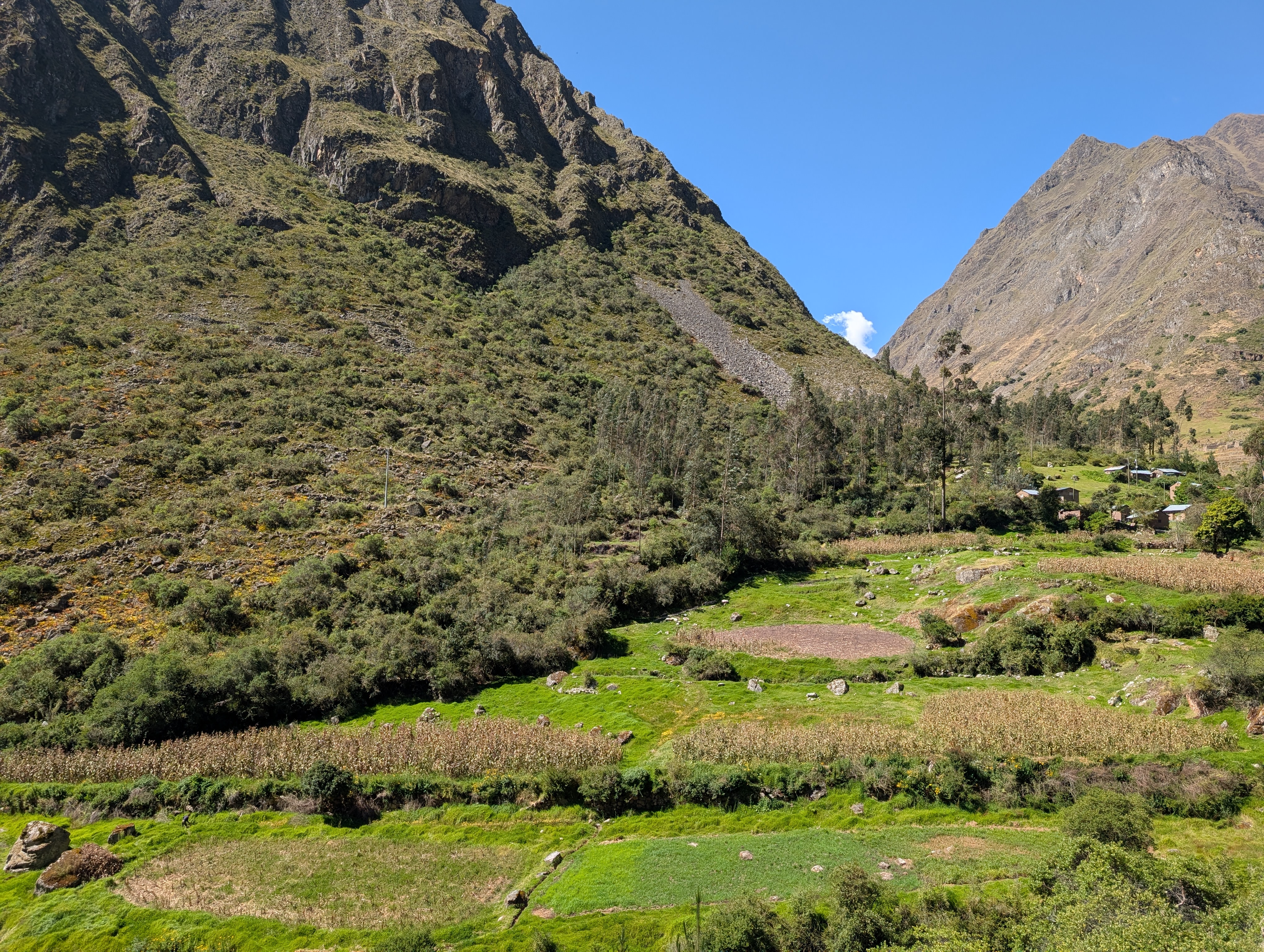 We descend a bit farther before arriving at our lunch spot in Huayllabamba about 11:30 am. In Quechua, Huaylla means grassy and Bamba or pampa means plain. Now, this isn’t the grassy plain one might imagine from the middle of the United States. But in comparison to the towering canyon walls, this junction of the Cusichaca and Llullucha Rivers has formed a rich alluvial plain filled with trees and farm plots.