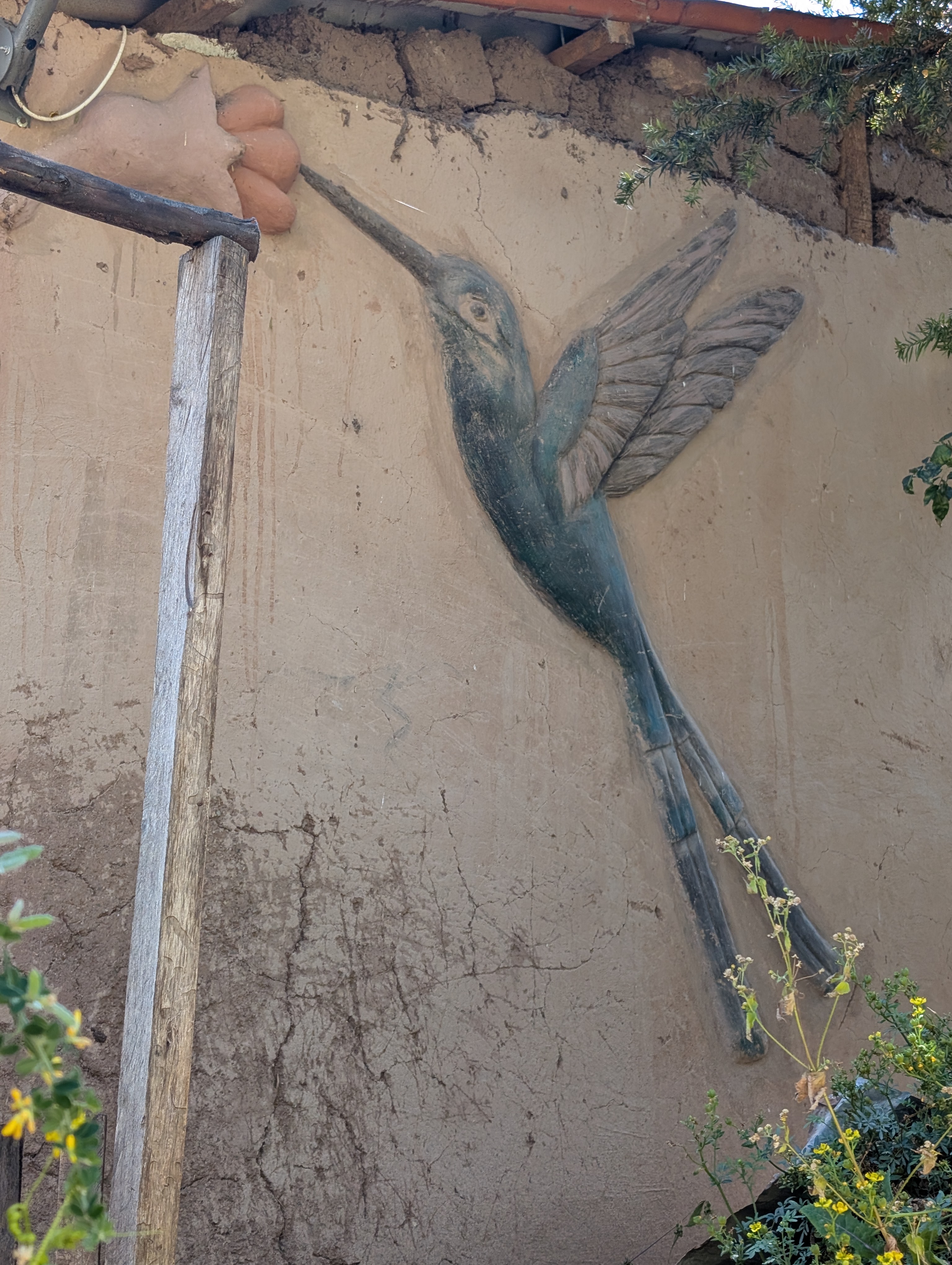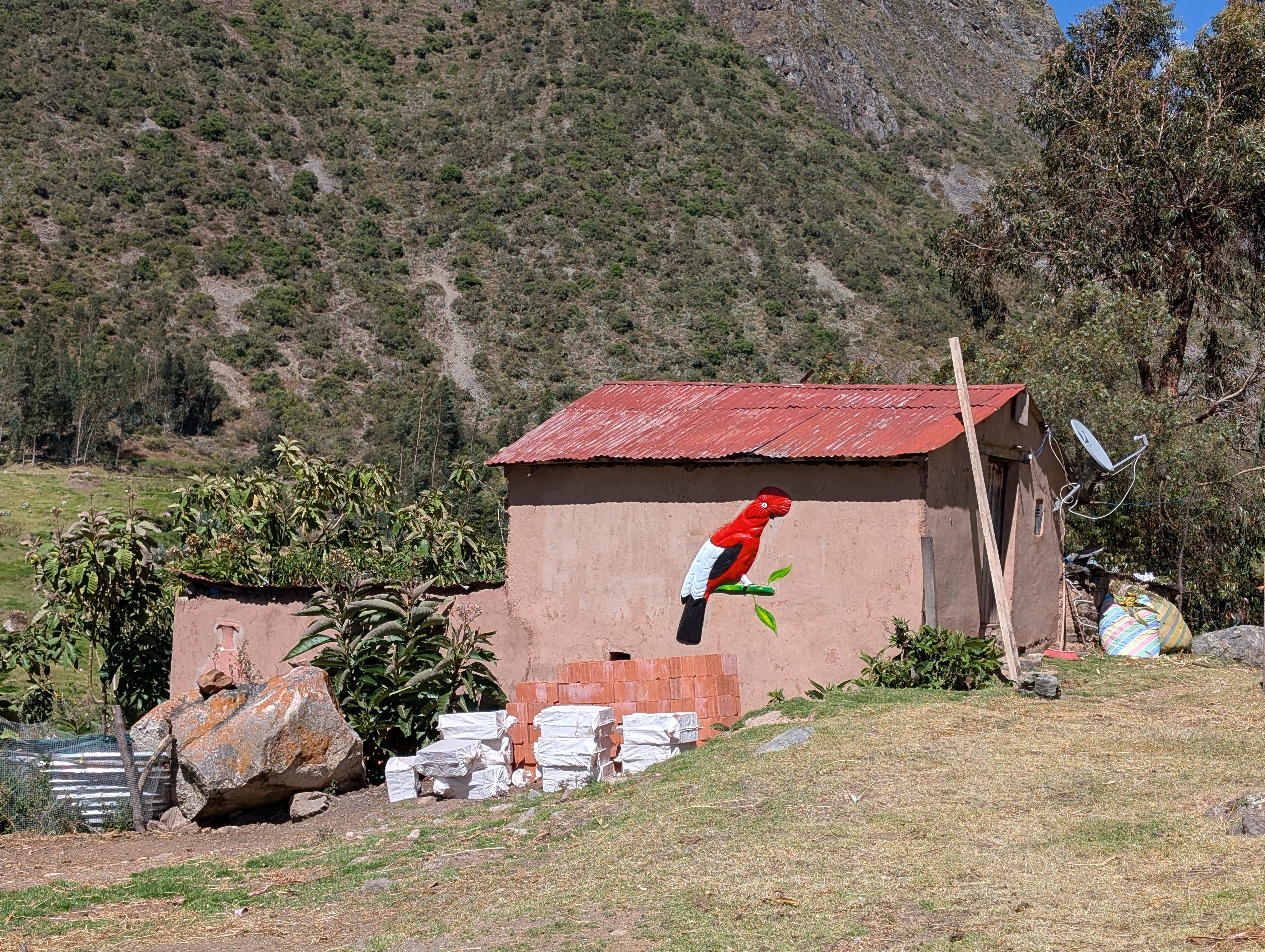 Just after 11 am, we meet some donkeys and Oscar coming back up the canyon riding his horse. I wave one final goodbye. We circle up above the trail and spend a few minutes checking out what’s left of some ancient ruins. Peru’s national bird, the gallito de las rocas or Andean Cock-of-the-Rock, is beautifully depicted using natural building techniques on the side of a house. No joke – cock of the rock, also known as Tunki in Quechua, is noteworthy for its sexual dimorphism. The male is the only one who displays the red rock-shaped head. And then the female makes a nest under a rocky overhang and raises the young all by herself.